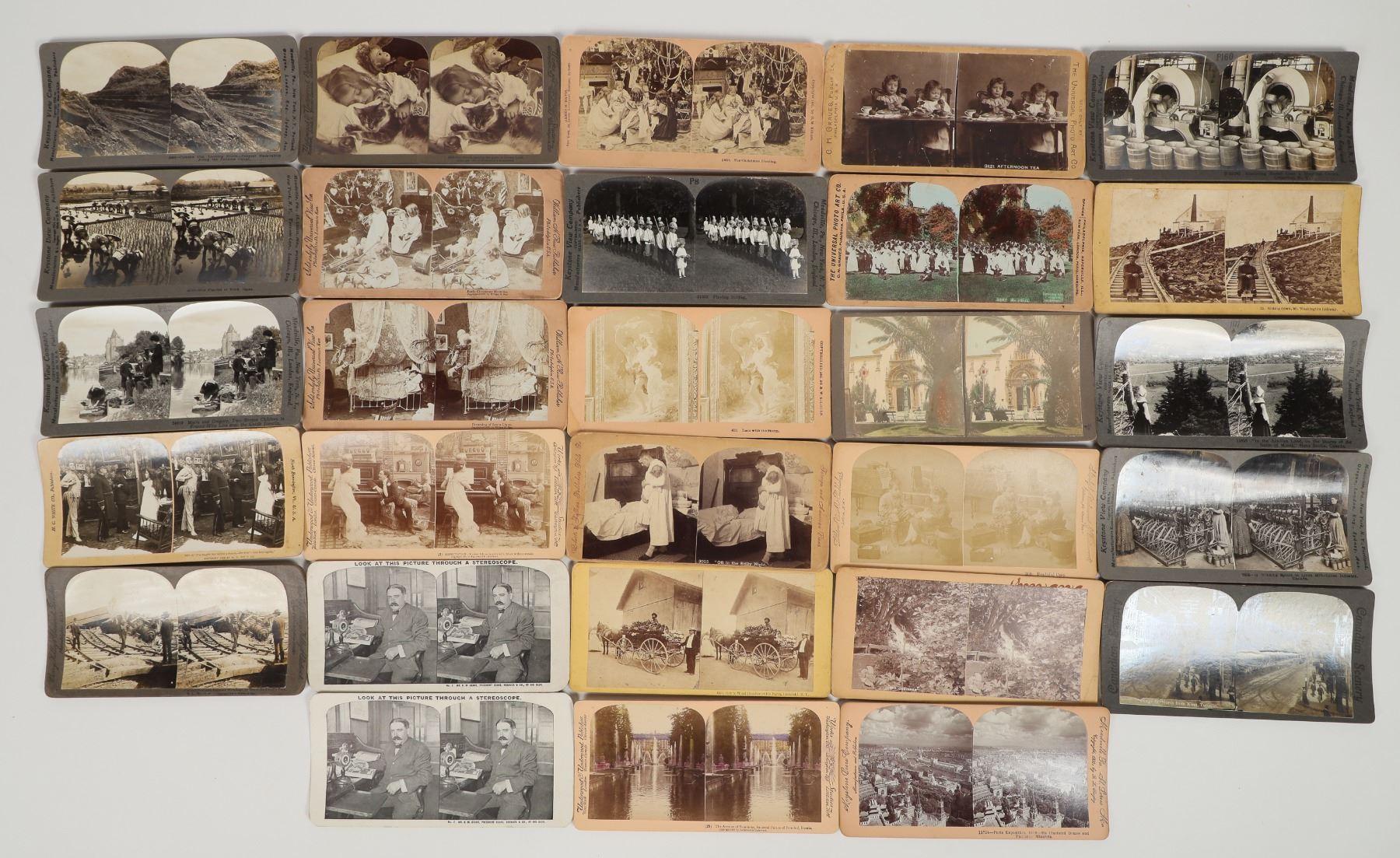 Lot of 26. Nearly all different. Includes: president of Sears Roebuck; Imperial Palace in Russia; Paris Exposition of 1900; Toronto street scene; Nova Scotia; Canadian linen mill; Mt. Washington Railway; butter churn; Rev. Henry Ward Beecher; destroyed railroad at Kansas City, Missouri; rice farmers in Japan; and much more. Please inspect.