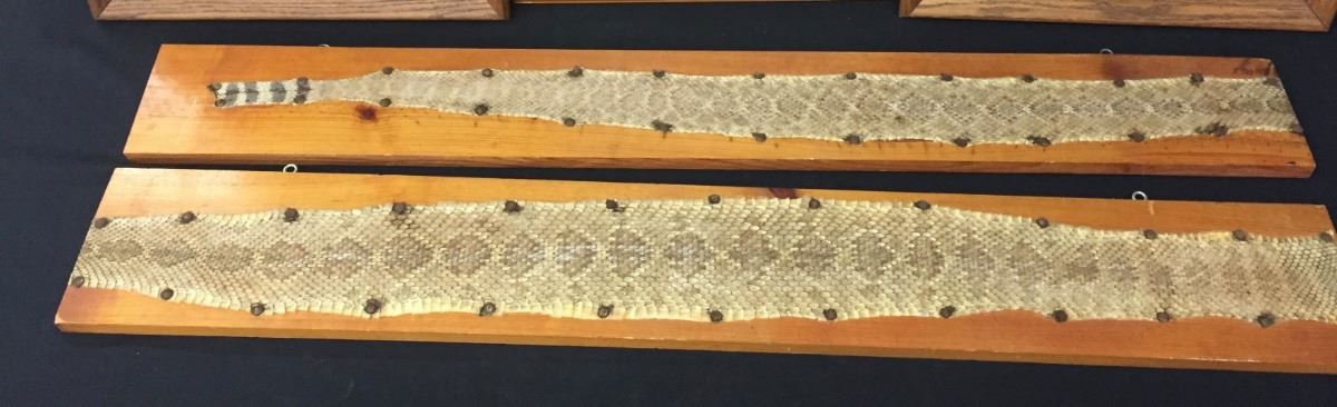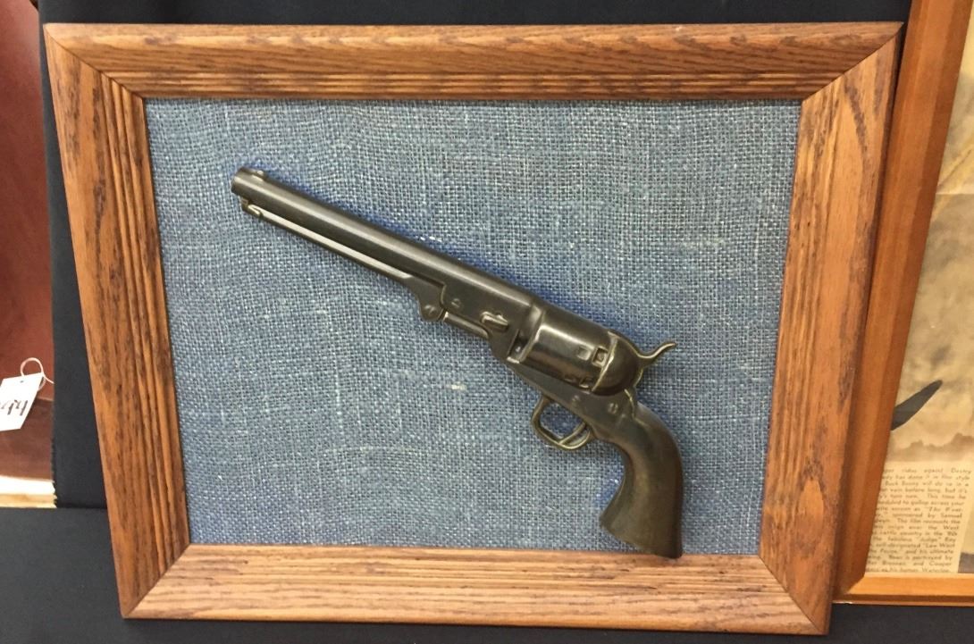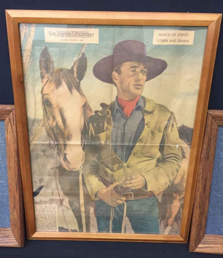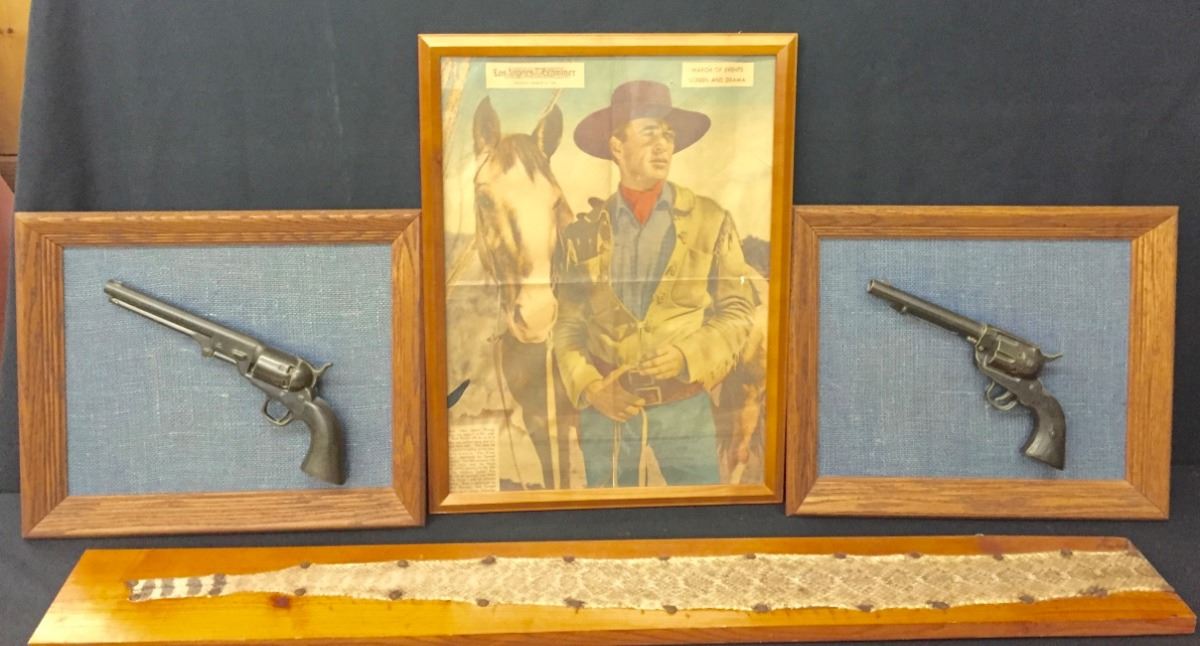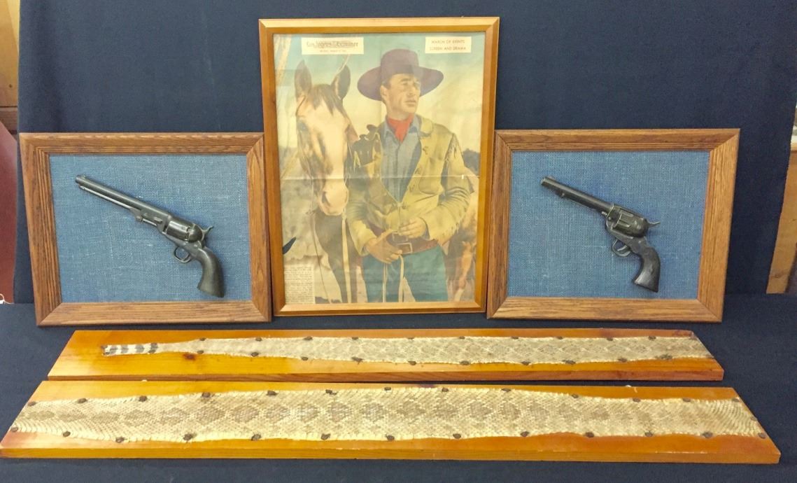 The two rattlesnake skins mounted on boards measures approximately 42 inches long, each. There is a page from a March 3, 1940 Los Angeles Examiner which measures 16 inches wide by 21 inches high. There are two ceramic pistols in frames which measure 16.5 inches wide by 14 inches high, each. Please look closely at pics - they are an important part of our description. Shipping: There will be a $10 handling / packaging fee for shipping this lot. The actual cost of postage will be added on top of that.