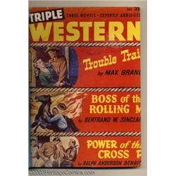 Miscellaneous Western Pulp Group (Various, 1932-50) Condition: Average GD. This is a large group of western-themed pulp magazines. All were trimmed on three sides and restapled with an added paper dust cover. The original front and back covers are still intact under the "new" outer cover. The paper quality is generally good, with supple newsprint pages and mostly white to cream inside covers. A few are getting slightly brittle at the corners, but all are readable. The 54 pulps in this lot consist of Ace-High Western Sept. 1947; Nov. 1947; Dec. 1947; Jan 1948; Feb. 1948; Action Stories Aug. 1932; Oct. 1934; Aug. 1940; Winter 1943; Action-Packed Western July 1939; Big-Book Western Jan/Feb 1934; Complete Western Book Aug. 1935; July 1937; May 1938; Cowboy Stories Sept. 1934; Danger Trail Oct. 1934; Nov. 1934; Dime Western Dec. 1934; Jan. 1935; Dec. 1947; Jan. 1948; Feb. 1948; Apr. 1948; Gun-Swift Western Sept. 1938; Quick Trigger Western Sept. 1937; New Western Dec. 1950; Ranch Romances Sept. 1933; Dec. 1933; Feb. 1934 (V52#3); Feb. 1934 (V52#4); Mar. 1934; Apr. 1934; Rangeland Love Feb. 1934; Rangeland Romances July 1935; Real Western Dec. 1936; Aug. 1937; Oct. 1937; Mar. 1938; Smashing Western Sept. 1937; Star Western Sept. 1934; Oct. 1934; Nov. 1934; Dec. 1934; Sure-Fire Western July 1937; Thrilling Ranch Stories Jan. 1934; Mar. 1935; Top-Notch Magazine Feb. 1935; Triple Western Oct. 1948; Dec. 1948; Aug. 1949; Dec. 1949; June 1950; Dec. 1950; Two-Gun Western Jul/Aug 1937; and June 1938. The Ultimate Guide to the Pulps VG value for group = $875. 54 items Important notice: Heritage usually auctions material at the rate of 200-250 lots per hour. On some occasions eBay Live bid software or the Internet may not be able to keep up with the pace of the auction. We recommend placing a realistic absentee bid now as insurance to avoid disappointment. Occasionally the auctioneer may eliminate or reject an eBay Live bid, and the auctioneer may also reopen a lot after the close of the eBay live bidding (usually because we missed an audience bid), and may reject your bid even if it shows you as the winning bidder. By bidding via eBay Live, you agree that Heritage may award the lot to another bidder at its sole discretion under the circumstances described above or any other reasonable circumstances. Also please note that all Heritage lots purchased through eBay Live carry a 20% Buyer's Premium. Please make sure you read the Terms and Conditions before you bid.