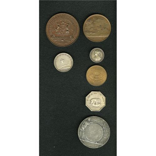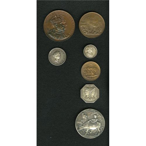 <B>Miscellaneous World Medals and Tokens Group Lot.</B></I> A fantastic world lot of seven pieces: a French jeton, circa 1830s; a couple of silver French medals (later Paris Mint restrikes); a British medal of Edward VII dated 1907; a British 1897 medal of the royal family; a French agricultural silver-plated medal, circa 1890s; and a bronze medal early restrike of the storming of the Bastille, circa 1844. Viewing of this lot is highly recommended due to the variety of the tokens and medals. The market value is approximately $150-$200.<BR><BR><b>Shipping:</b> Coins & Currency (<a target="_blank" href="http://www.heritageauctions.com/common/shipping.php">view shipping information</a>)