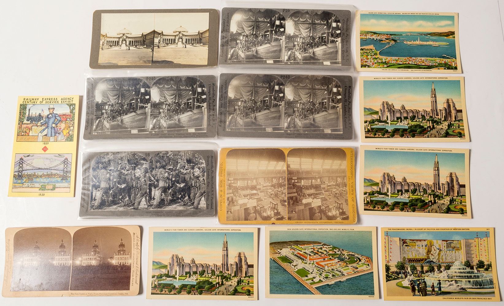 Lot of 14: 7 stereoviews plus 7 Golden Gate Exposition postcards. Included: Underwood stereoview of The Twin Towers at Night, Trans-Mississippi Expo.. in Omaha; undated Copelin & Son stereoview of interior at Grand Inter-state Exposition in Chicago; four Keystone stereoviews (two different) of exhibits at the Jamestown Exposition; exterior stereoview labelled PPIE on reverse; and 7 unused postcards from the 1939 Golden Gate Exposition. (Prag Collection) Date: Location: United States HWAC # 50665