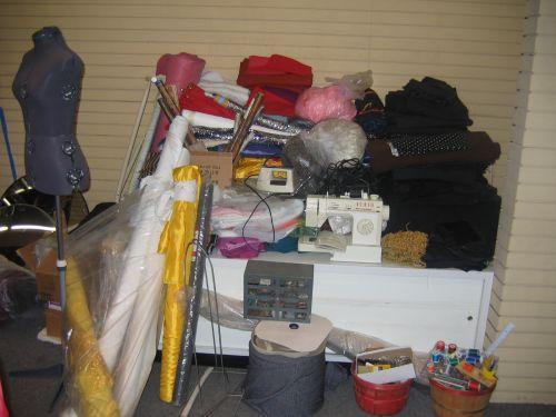 (lot) Miscellaneous fabric, SINGER 4530 sewing machine, tailoring stand. Includes white wooden counter that opens on both sides of the bottom.