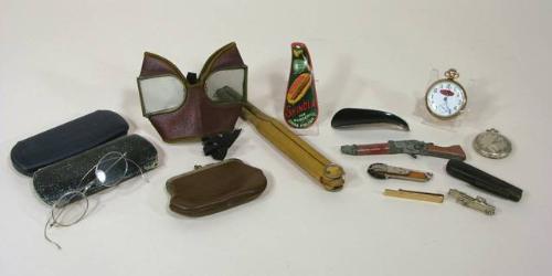 Miscellaneous group incl. adv. shoehorn, old specticles and pocket watches. Good Cond.
