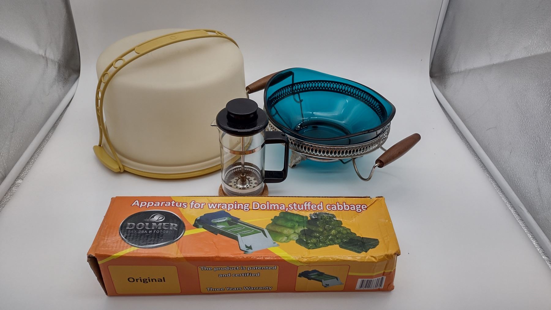 includes Dolma wrapping apparatus, mini french press, colored glass serving bowl, and travel cake caddie