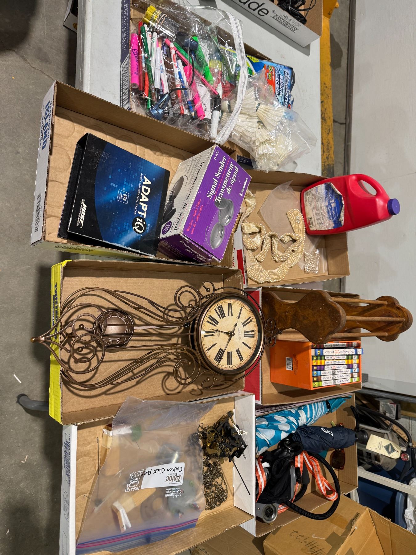Miscellaneous lot, clock, books, umbrellas, etc.
