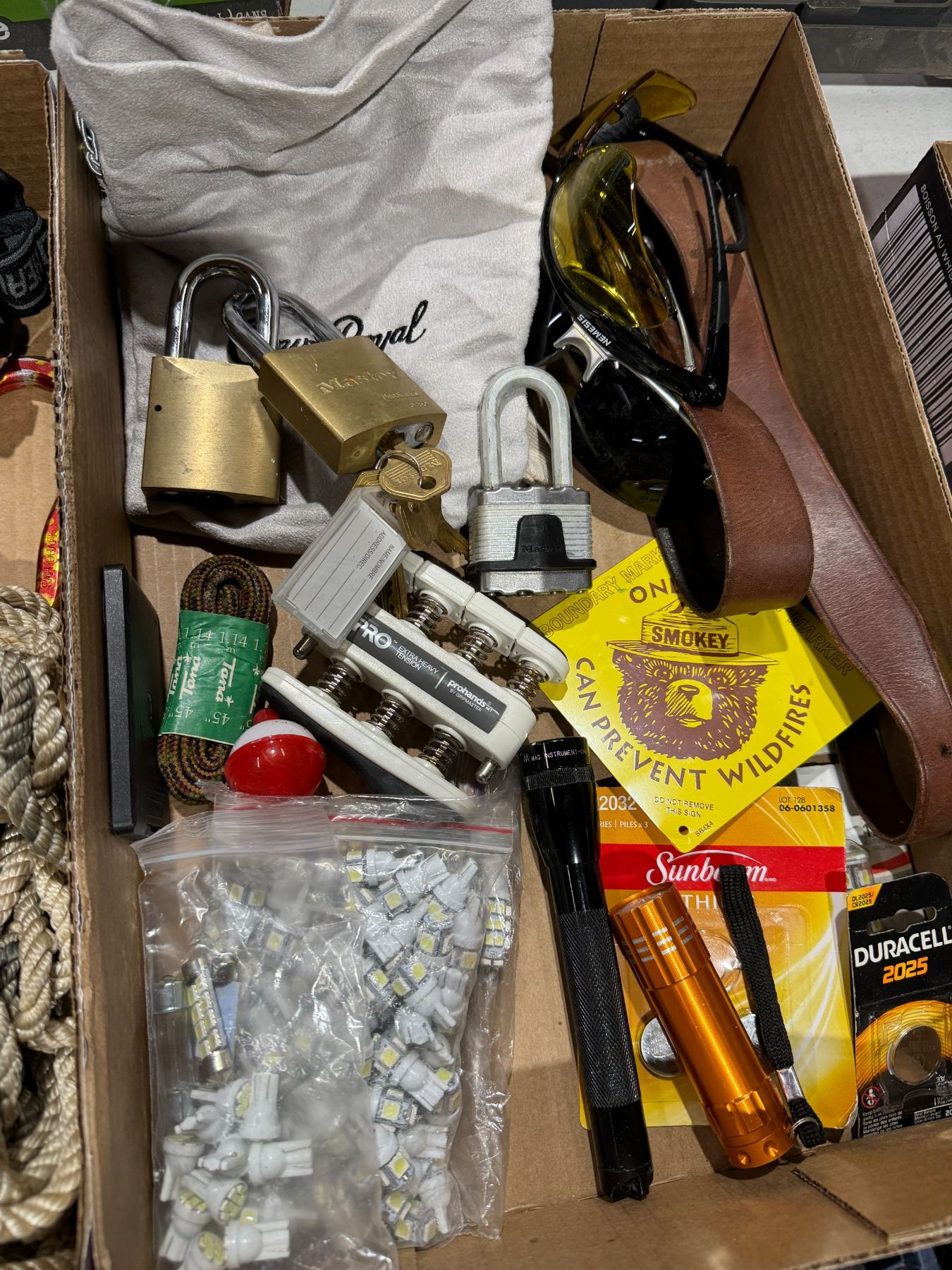 Miscellaneous lot, flashlight, batteries, locks, etc.