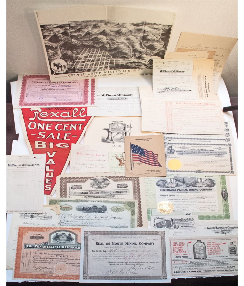 Lot of 45. Includes New England Mining Company certificate, Rio Grande Southern first day bank note, stocks from Pennsylvania Railroad Company, Del Monte Mining, Stanley Consolidated Mining, Baltimore & Ohio RR, Mountain Valley Mining, Esmeralda-Parral Mining of Chili, Green Gold-Silver Co, J Rieger whiskey billhead, Idaho Springs, Colorado Springs, and Denver billheads, 1917 Camp Cody Thanksgiving Dinner menu, map of Cripple Creek Mining District, 1897 Colorado letters.City: County: State:
