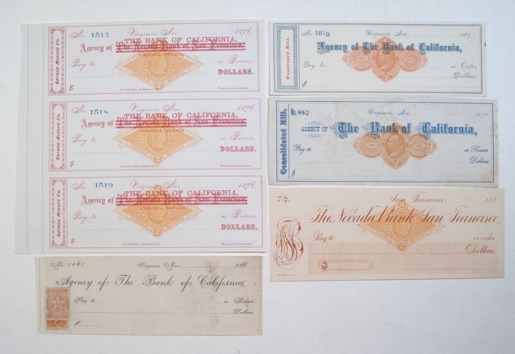 Lot of 5 Virginia City checks with revenue imprinted stamps. 1) Agency of the Bank of California with Woodworth Mill imprinted on left. Unused #1870. Although it processed Comstock ore, this mill was actually on the Carson River. 2) Agency of the Bank of California with Consolidated Mill imprinted on left. Unused, #842. 1874 date. 3) Nevada Bank of San Francisco check c1880. Unused. 4) Sheet of three 1876 Agency of the Nevada Bank of San Francisco. Bank named crossed out and Bank of California imprinted on top of it. For Savage Mining Company. Checks 1571, 1518 and 1519. Unused. 5) Unused Bank of California 1860's check. This check has a 2c orange Nevada and US attached revenue stamps.City: Virginia CityCounty: StoreyState: NV
