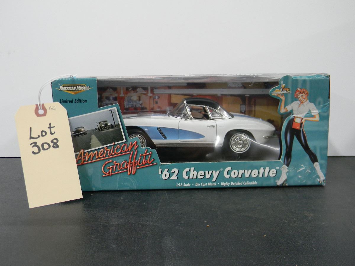 1962 white with blue racing stripe Chevy Corvette 1/8 scale die cast metal by American Grafitti; NIB
