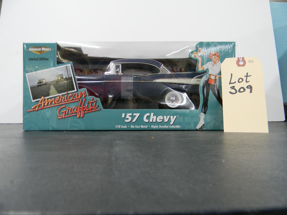 1957 blue with white strip Chevy; 1/8 scale die cast metal by American Grafitti / NIB