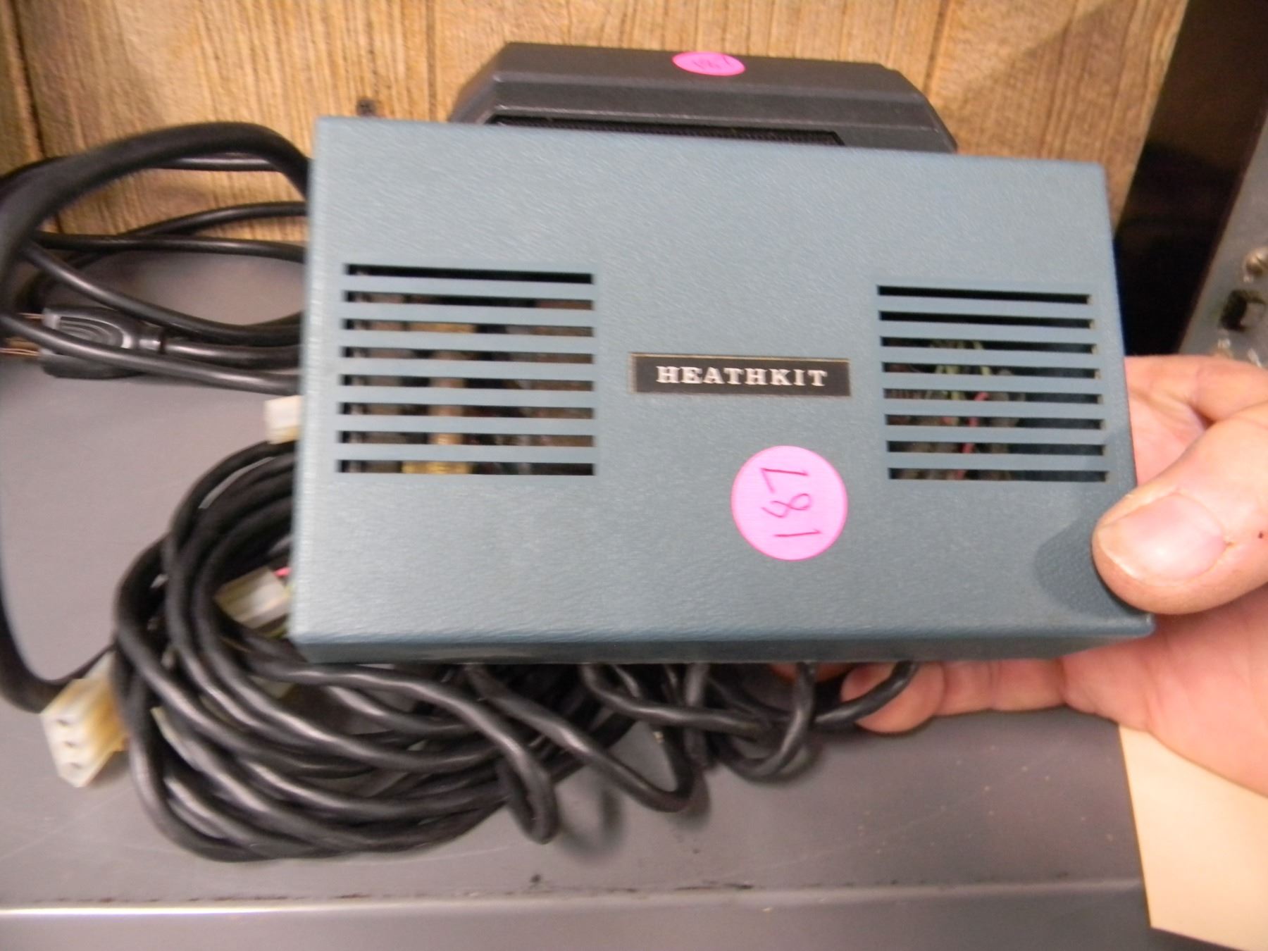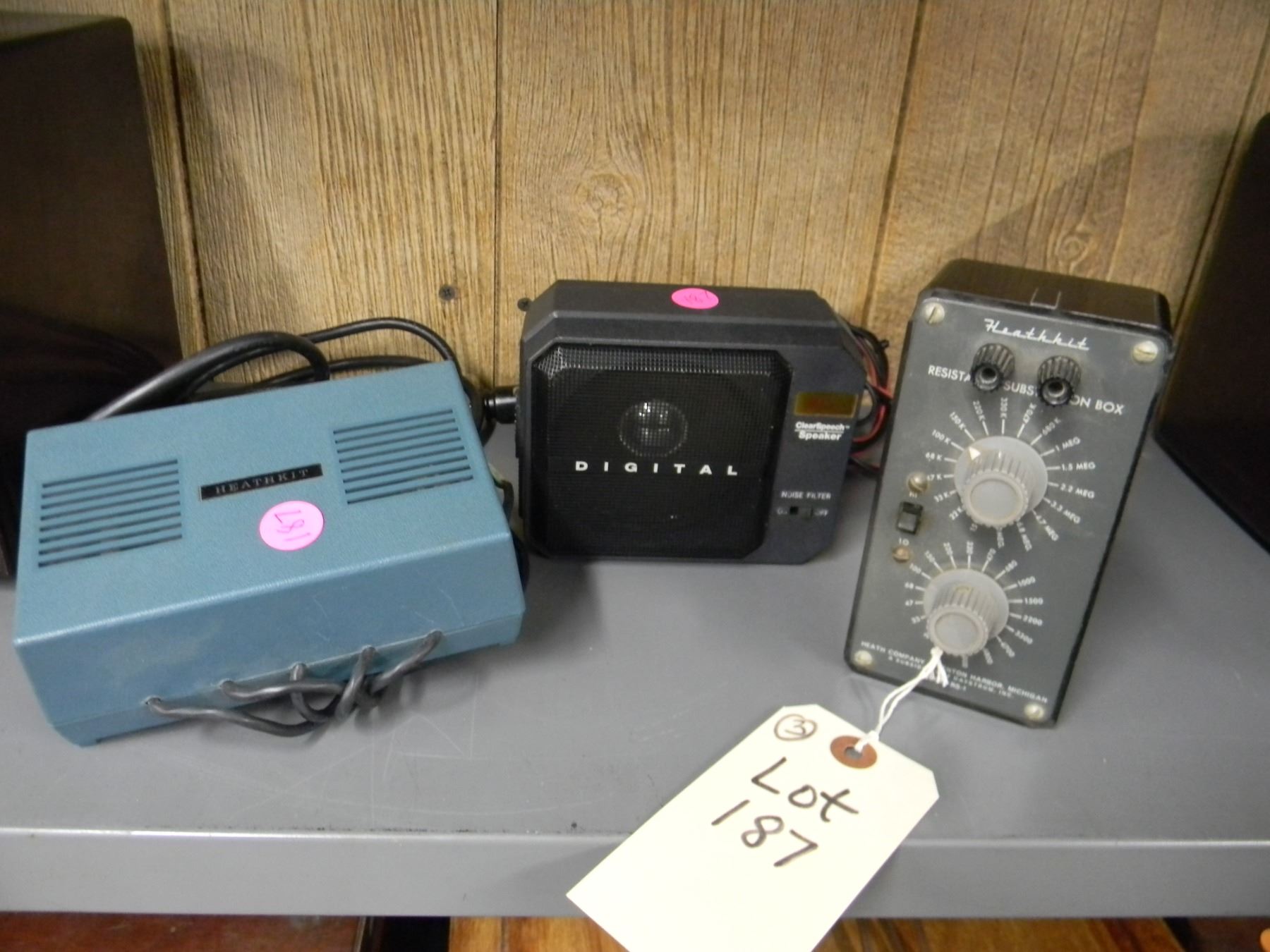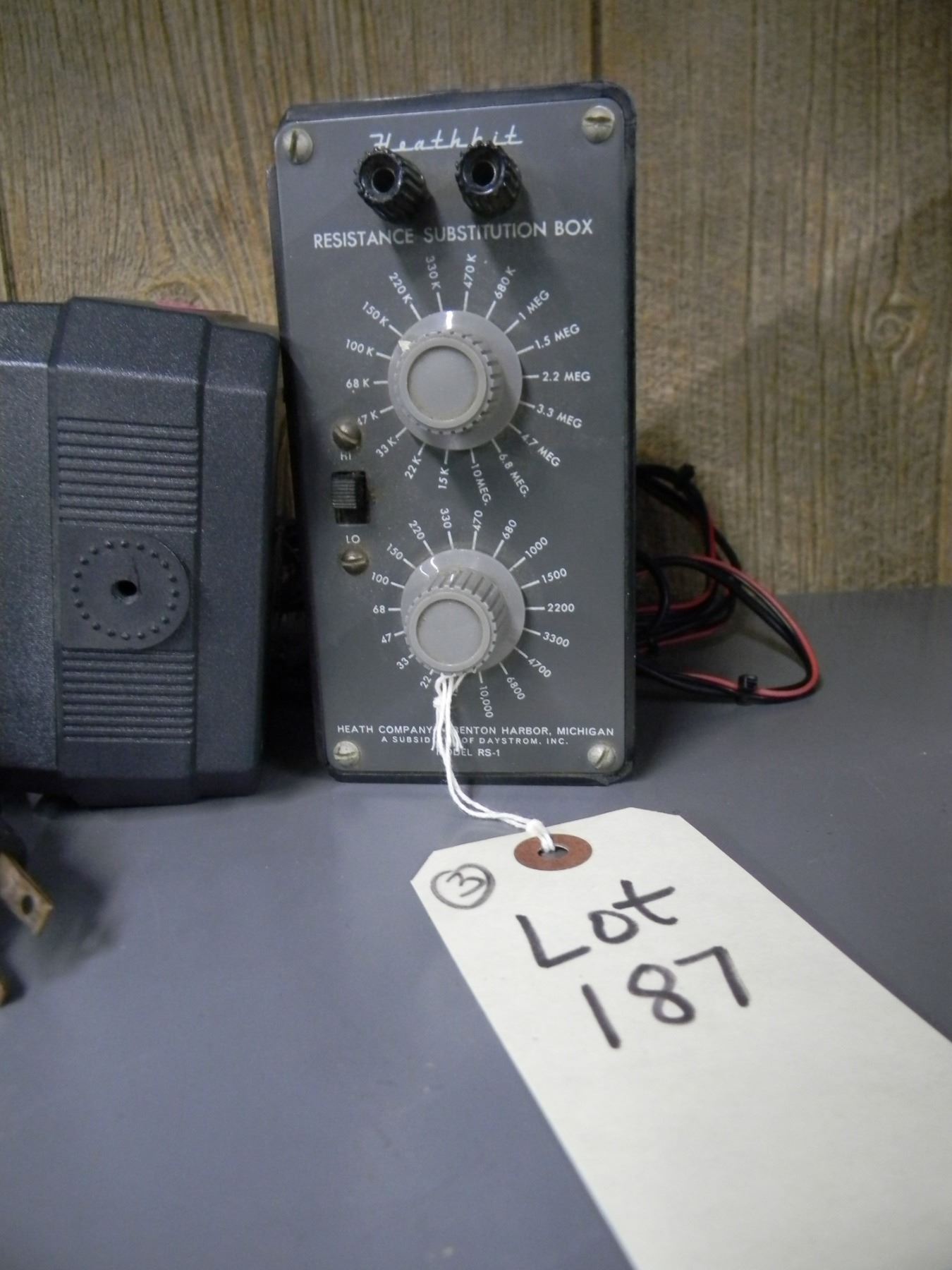 3 items - Heathkit resistance substitution box - model RS-1; clear speech speaker; Heathkit power supply