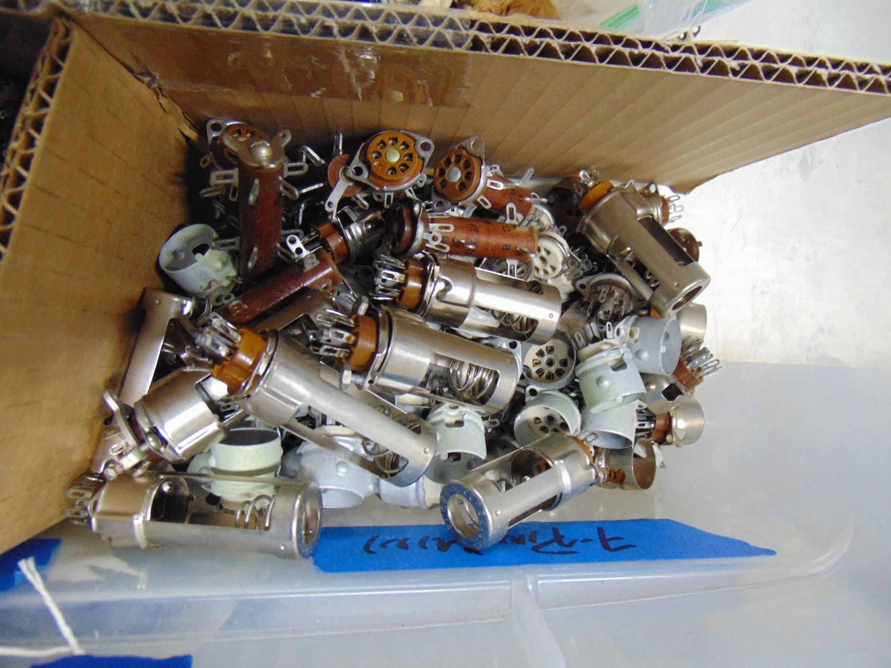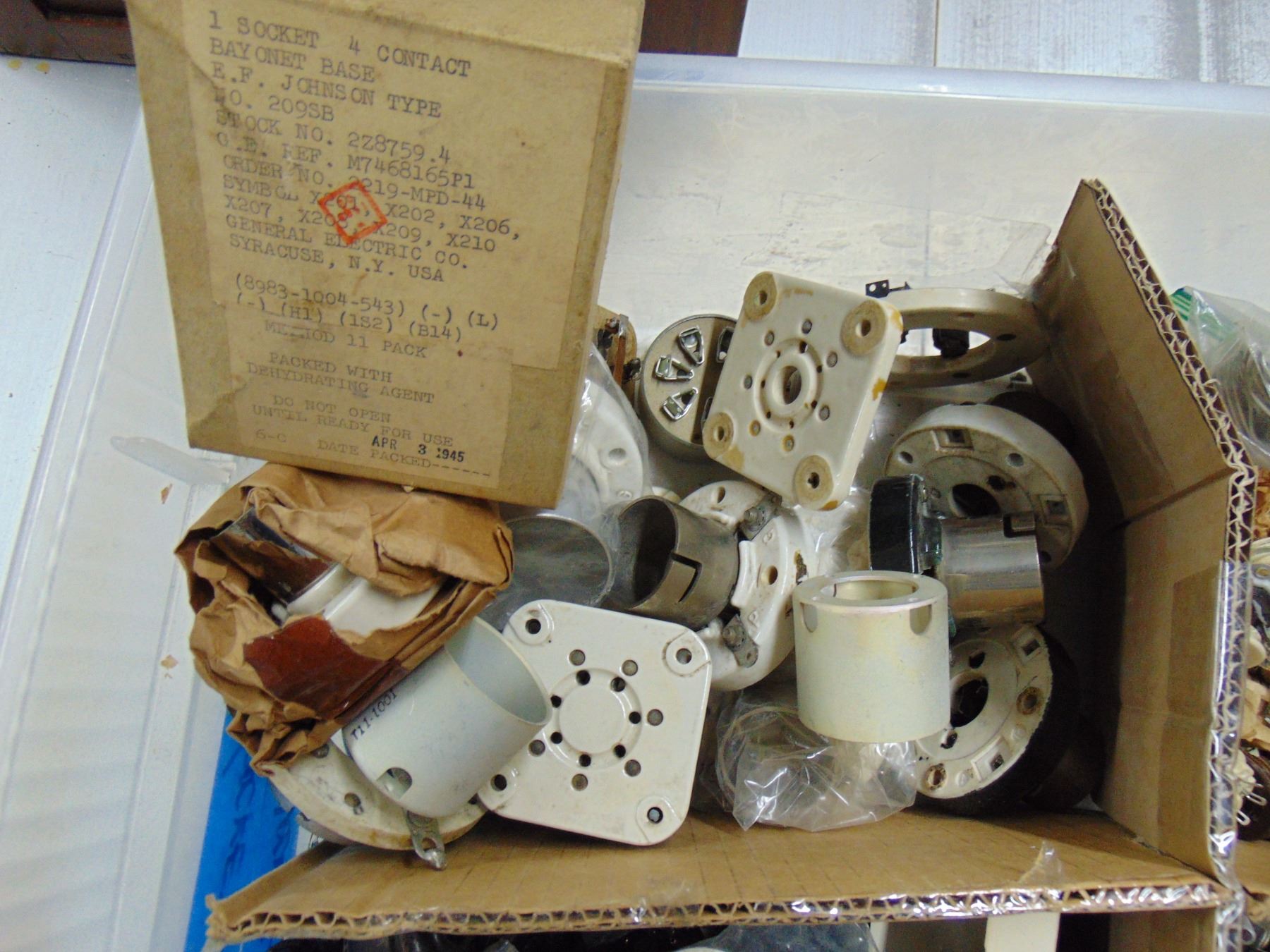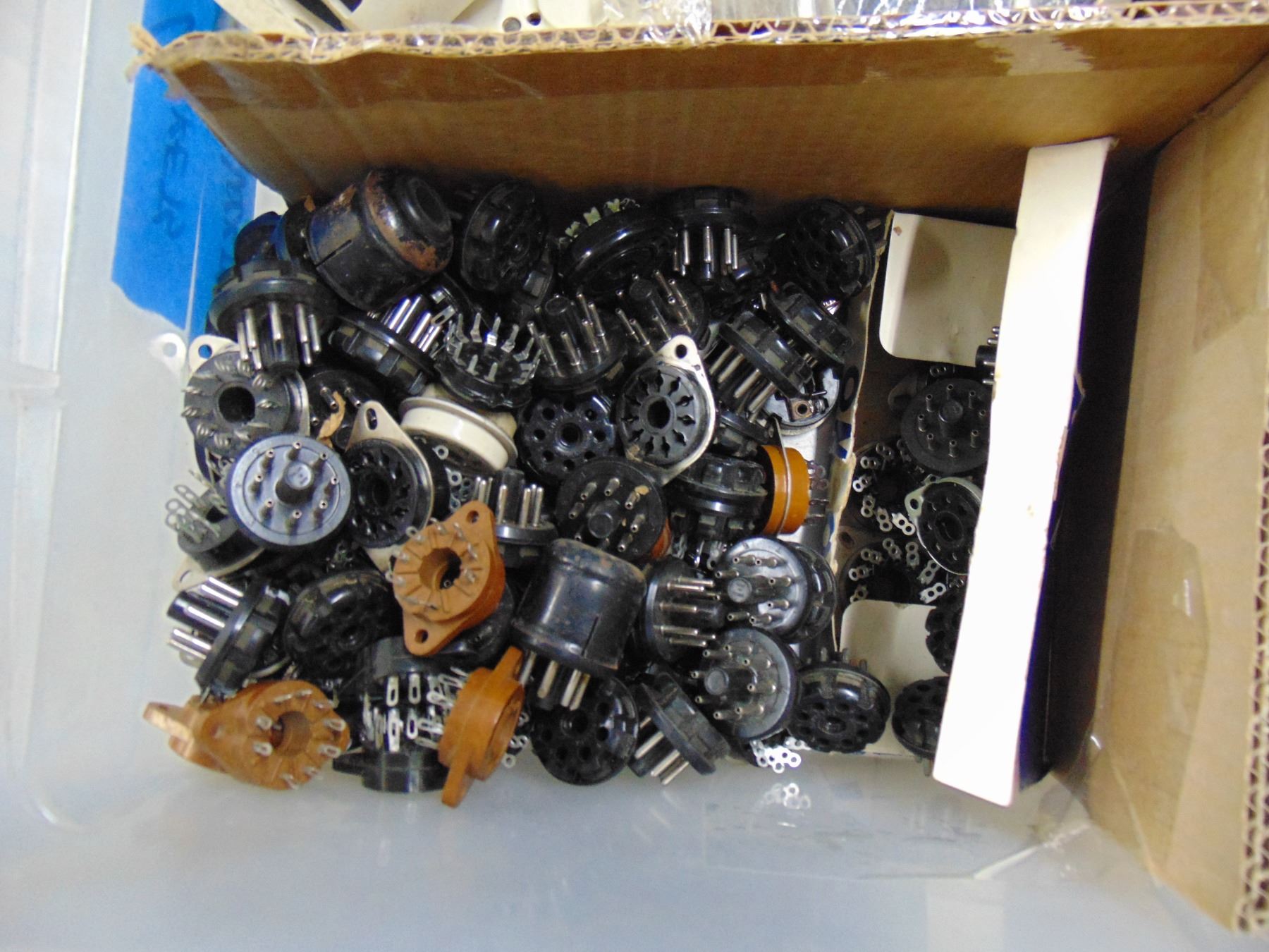 Tub of mostly NOS tube sockets; includes 7 pin, 9 pin, octal, and loctal, as well as porcelin sockets