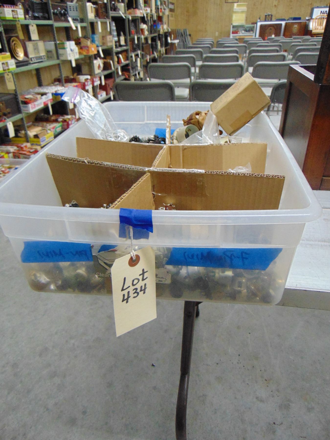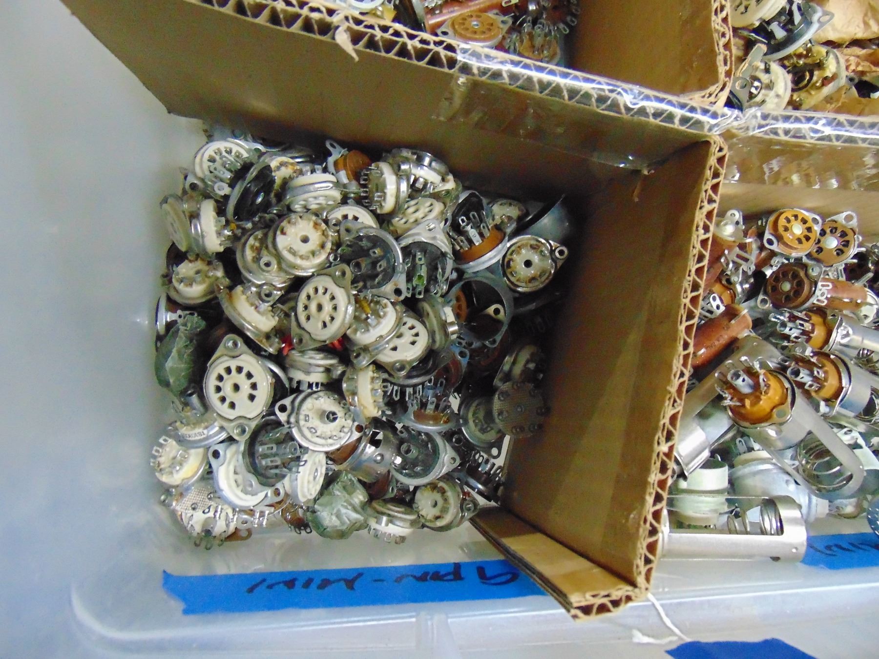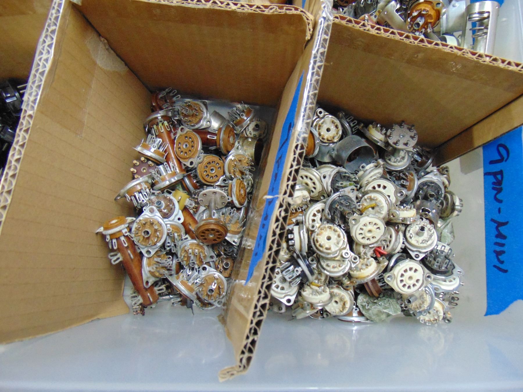 Tub of mostly NOS tube sockets; includes 7 pin, 9 pin, octal, and loctal, as well as porcelin sockets