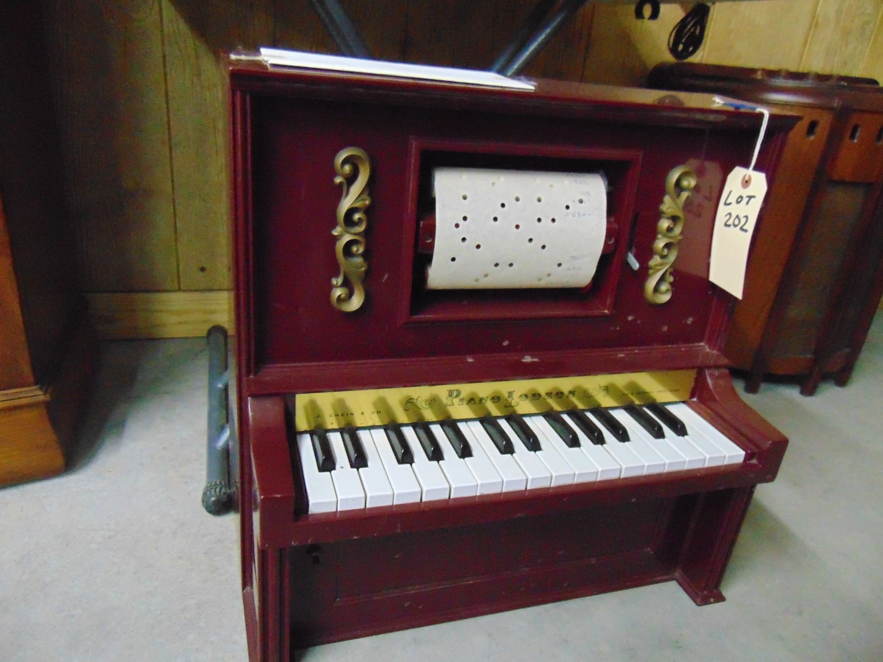 J. Chein and Company player piano; "Piano Lodeon"; child sized electromechanical player piano; works; 20" tall
