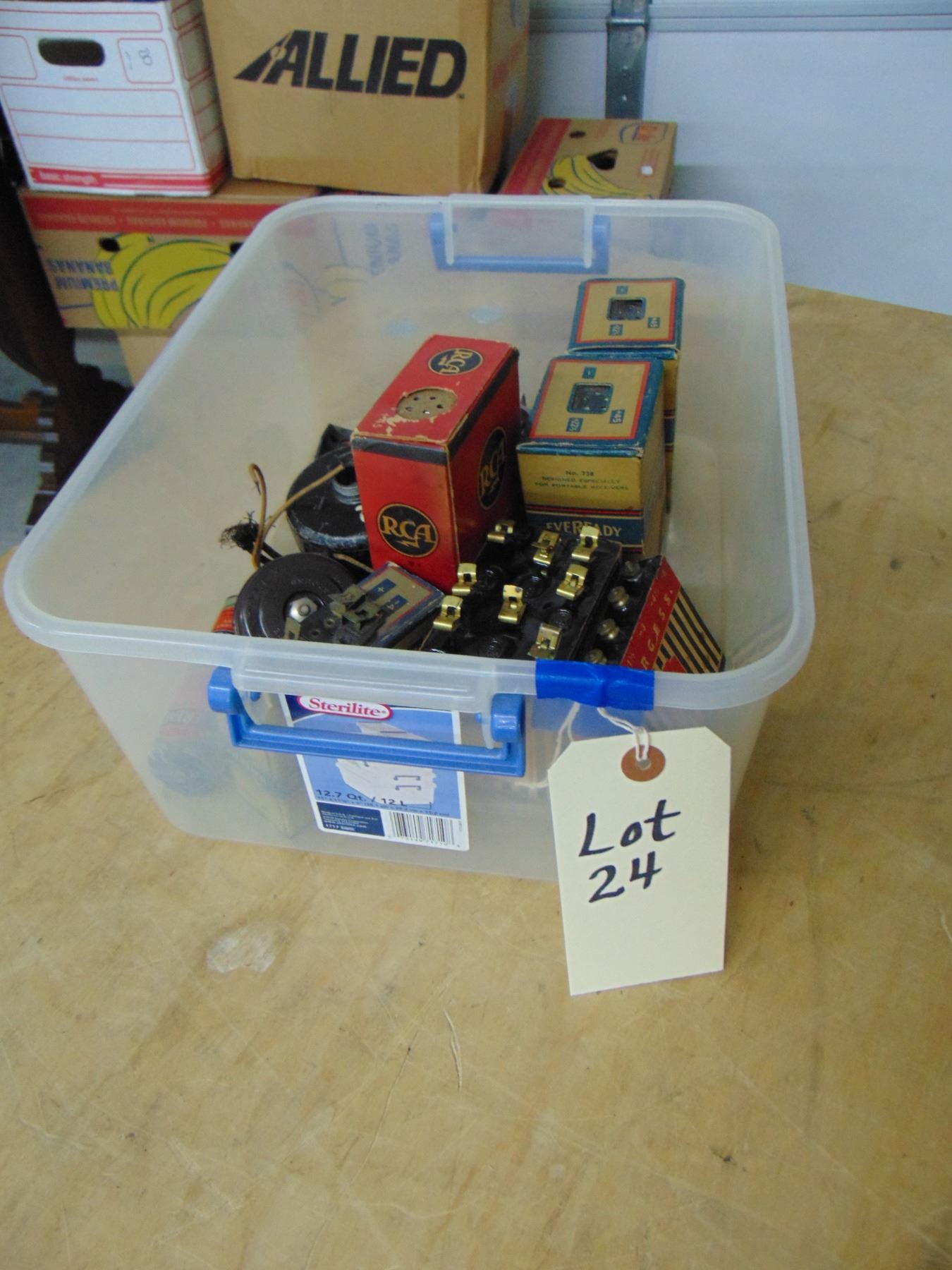 Flat of 10 various size batteries and 3 horn speaker drivers