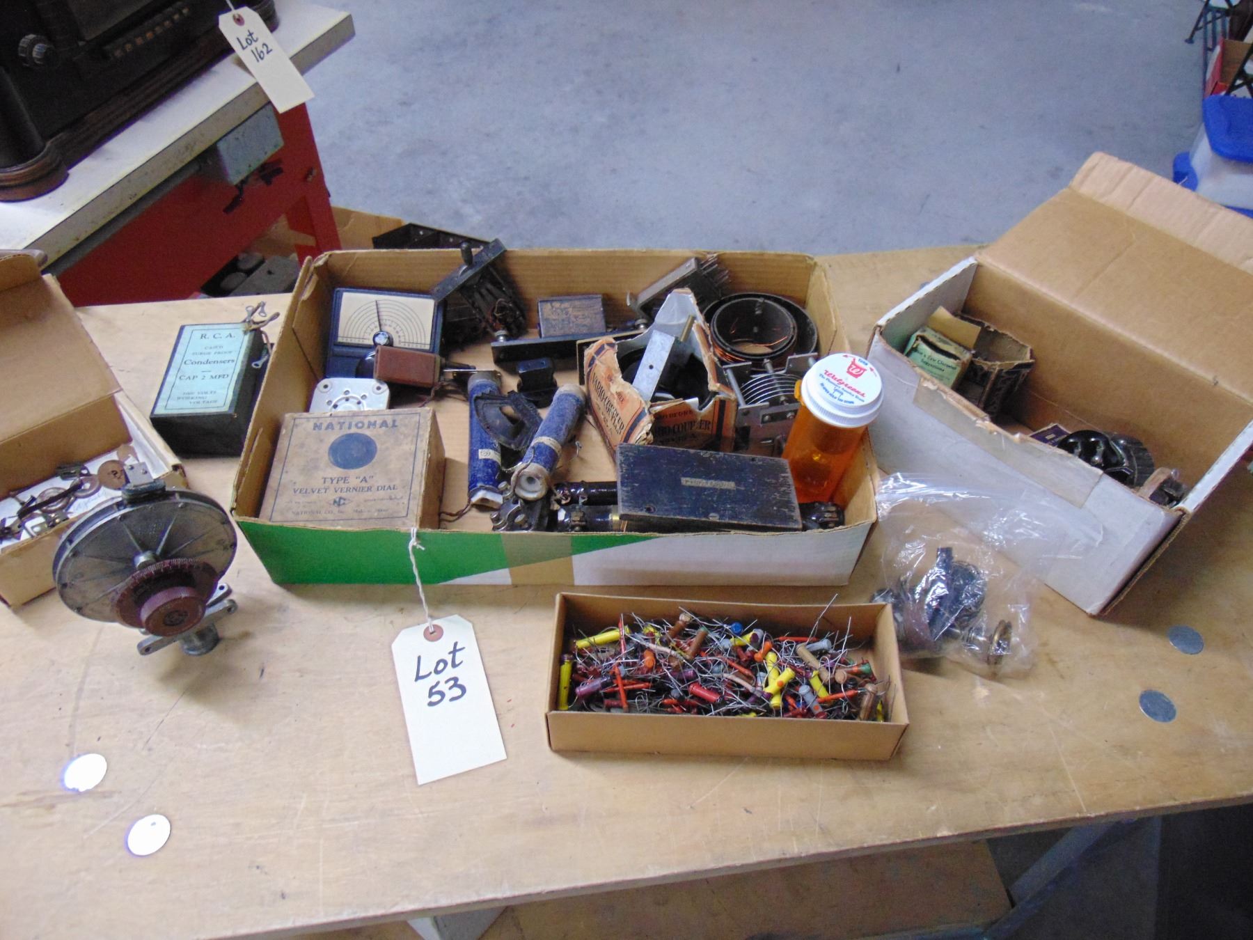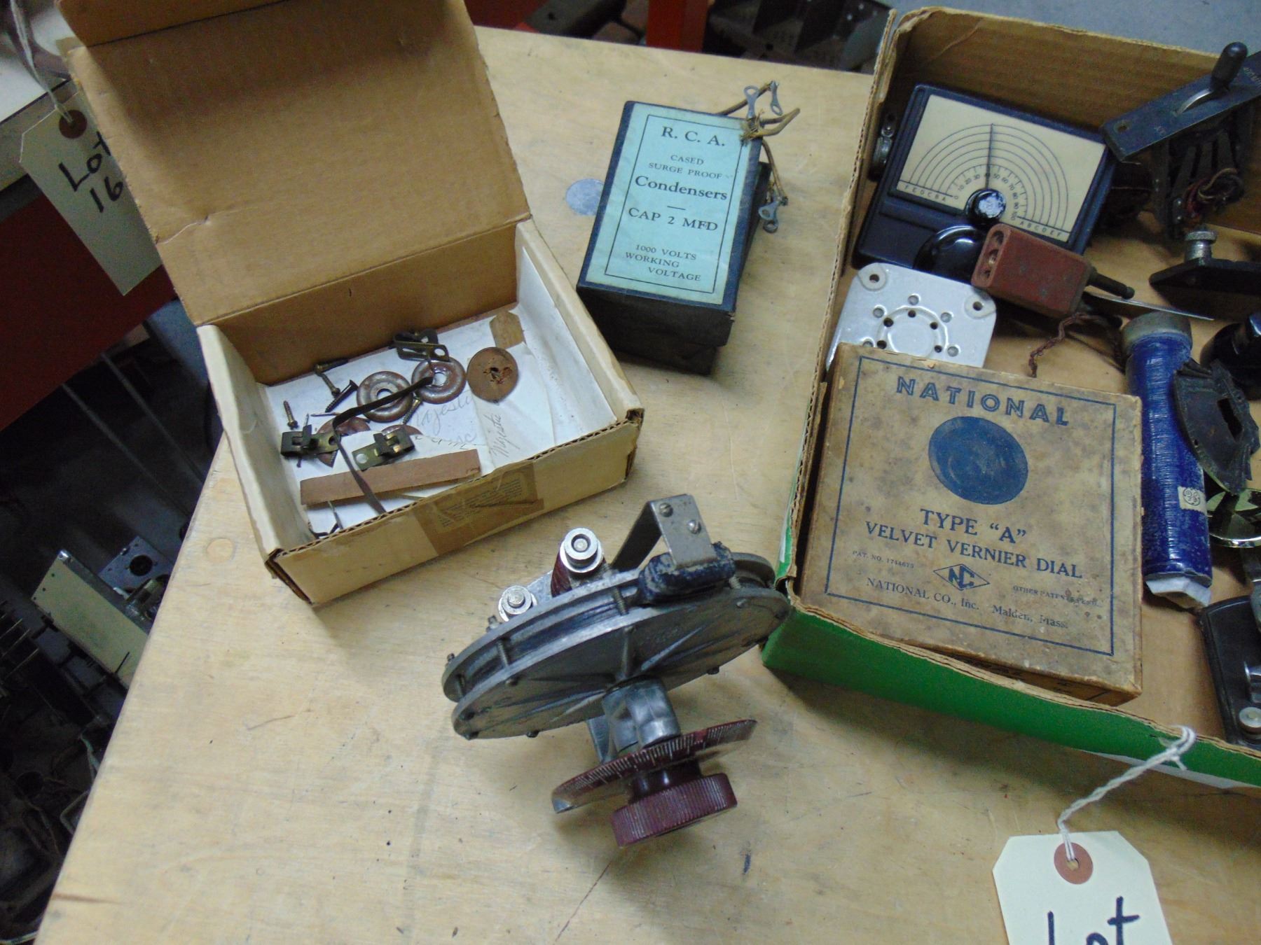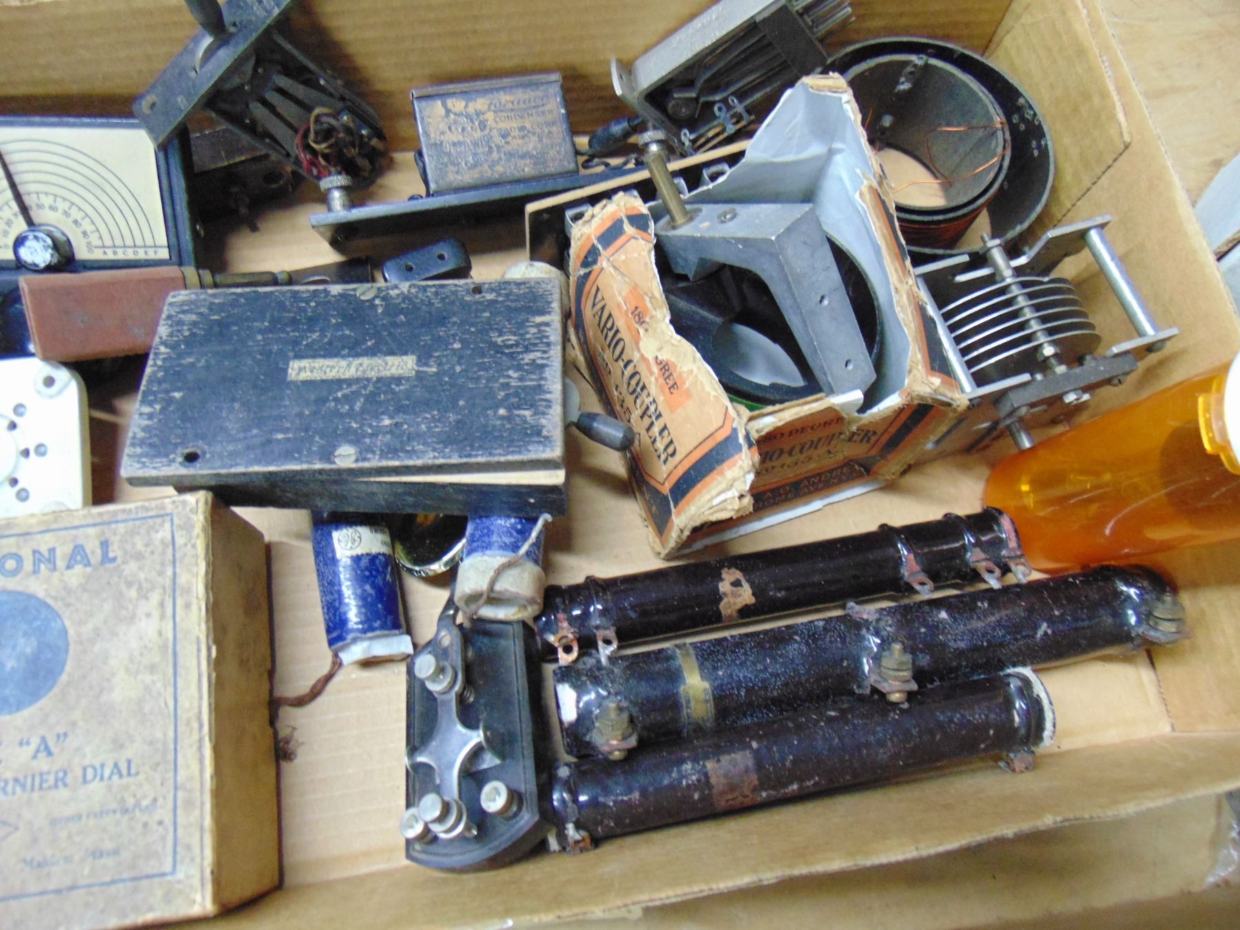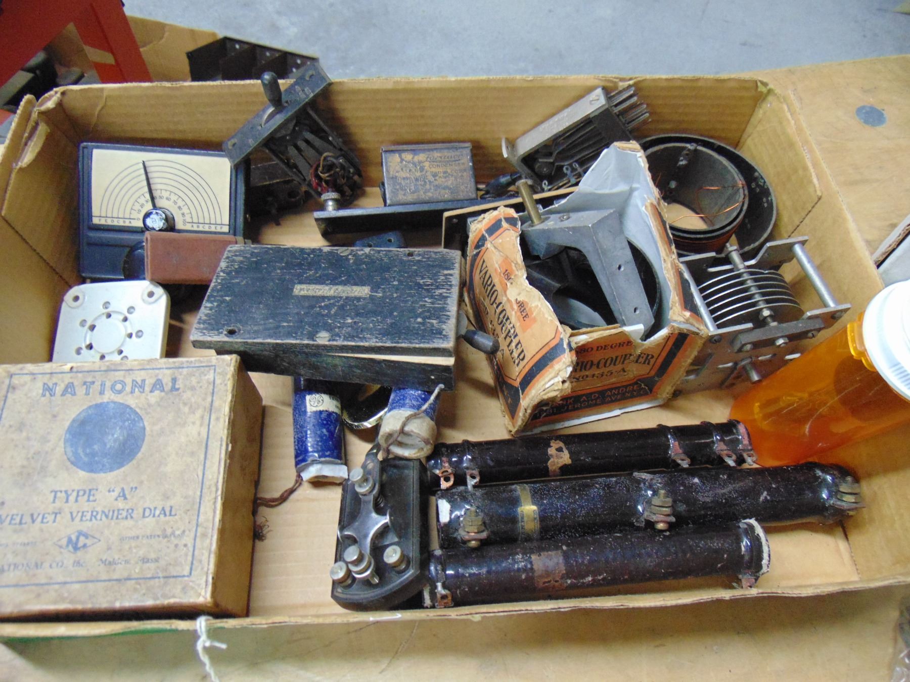 Flat of various radio parts, including early RCA transmitting condenser, made by Wireless Specility Apparatus; pre 1920