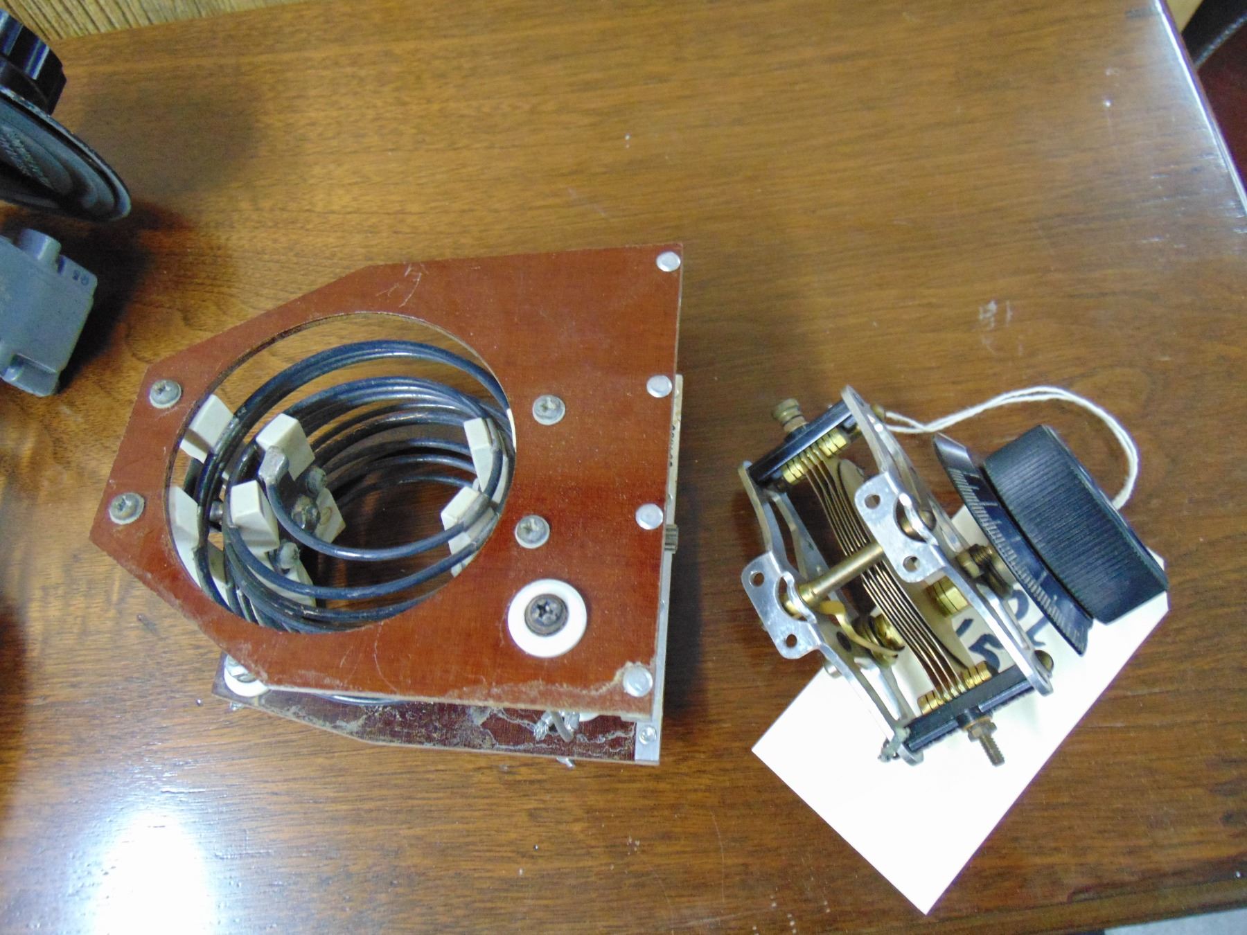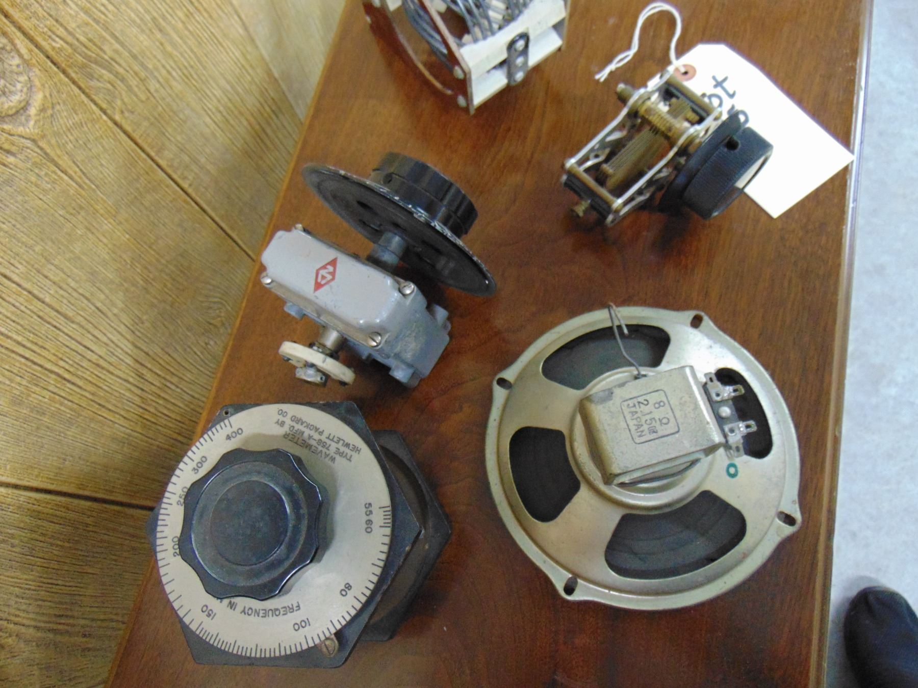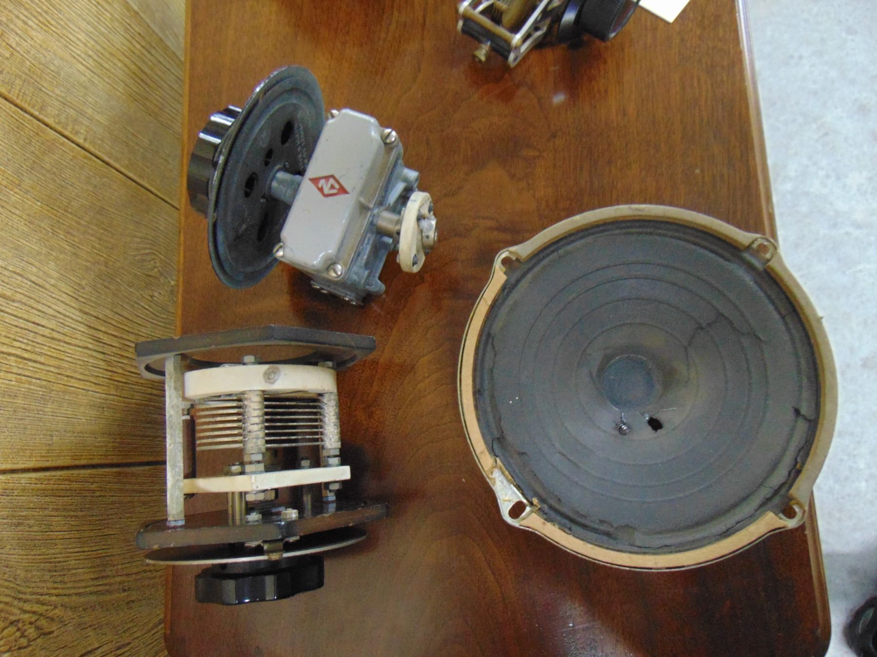 5 items; National tuning unit gear drive; Hewlett Packard wave meter; coil; misc. parts