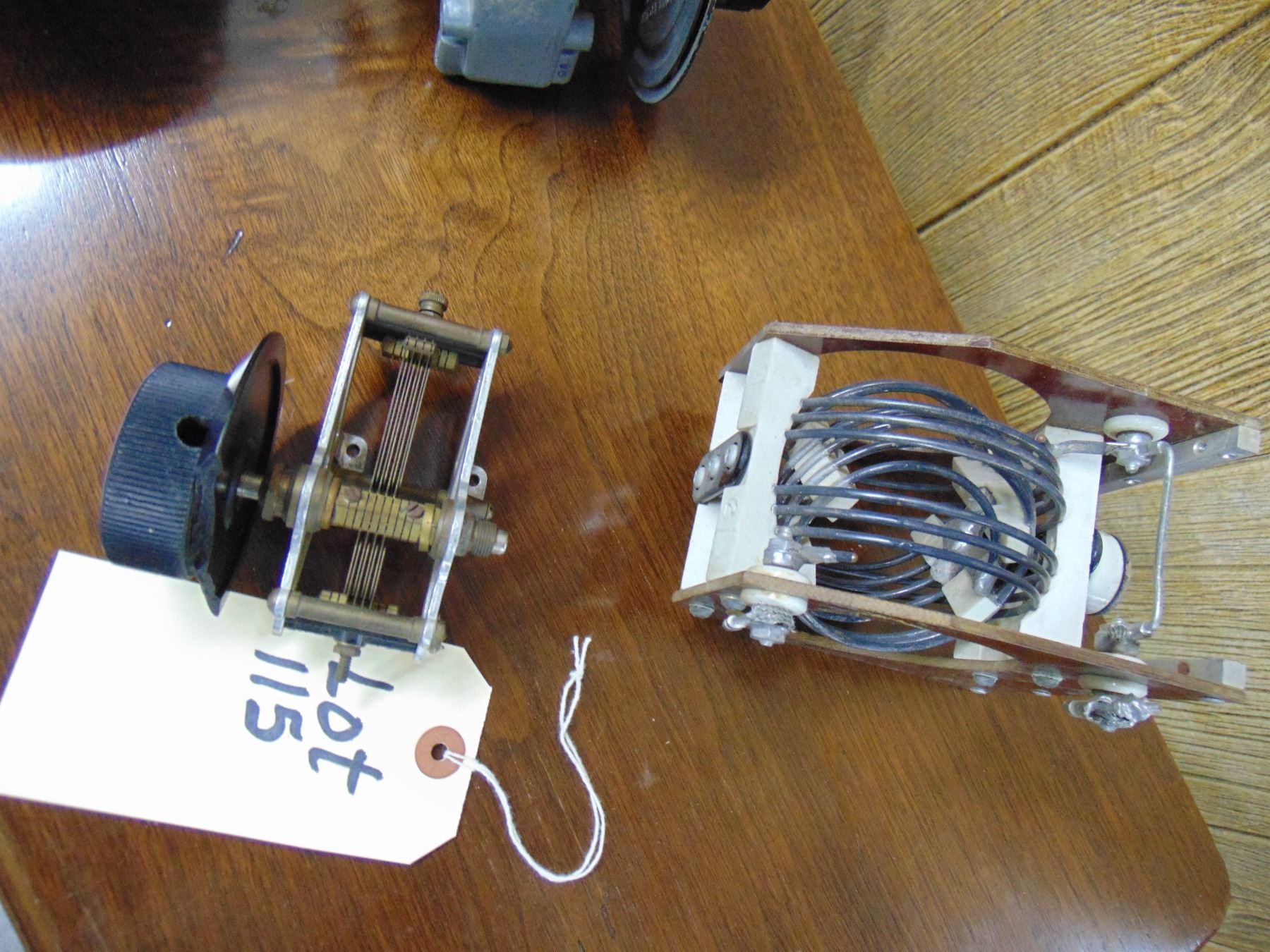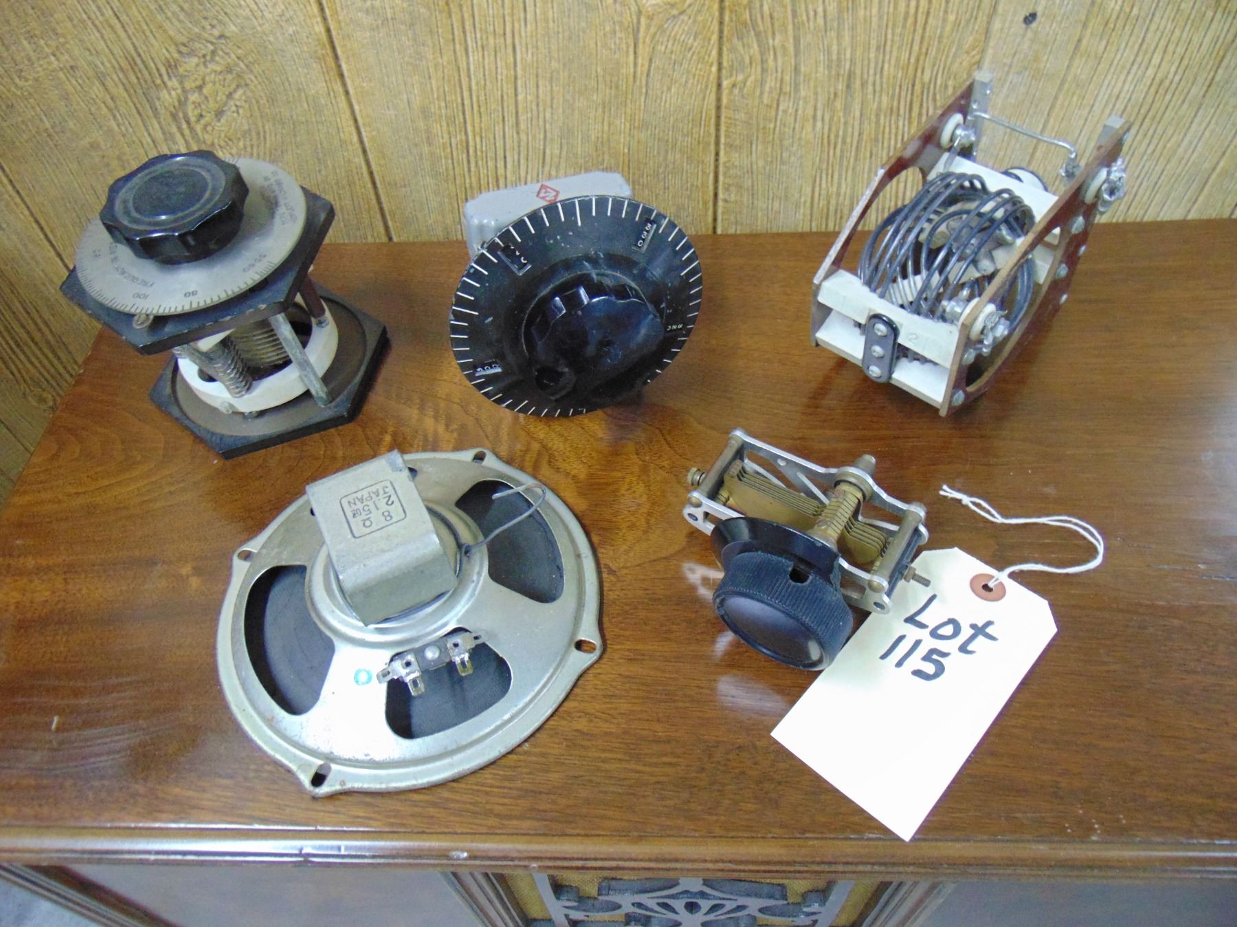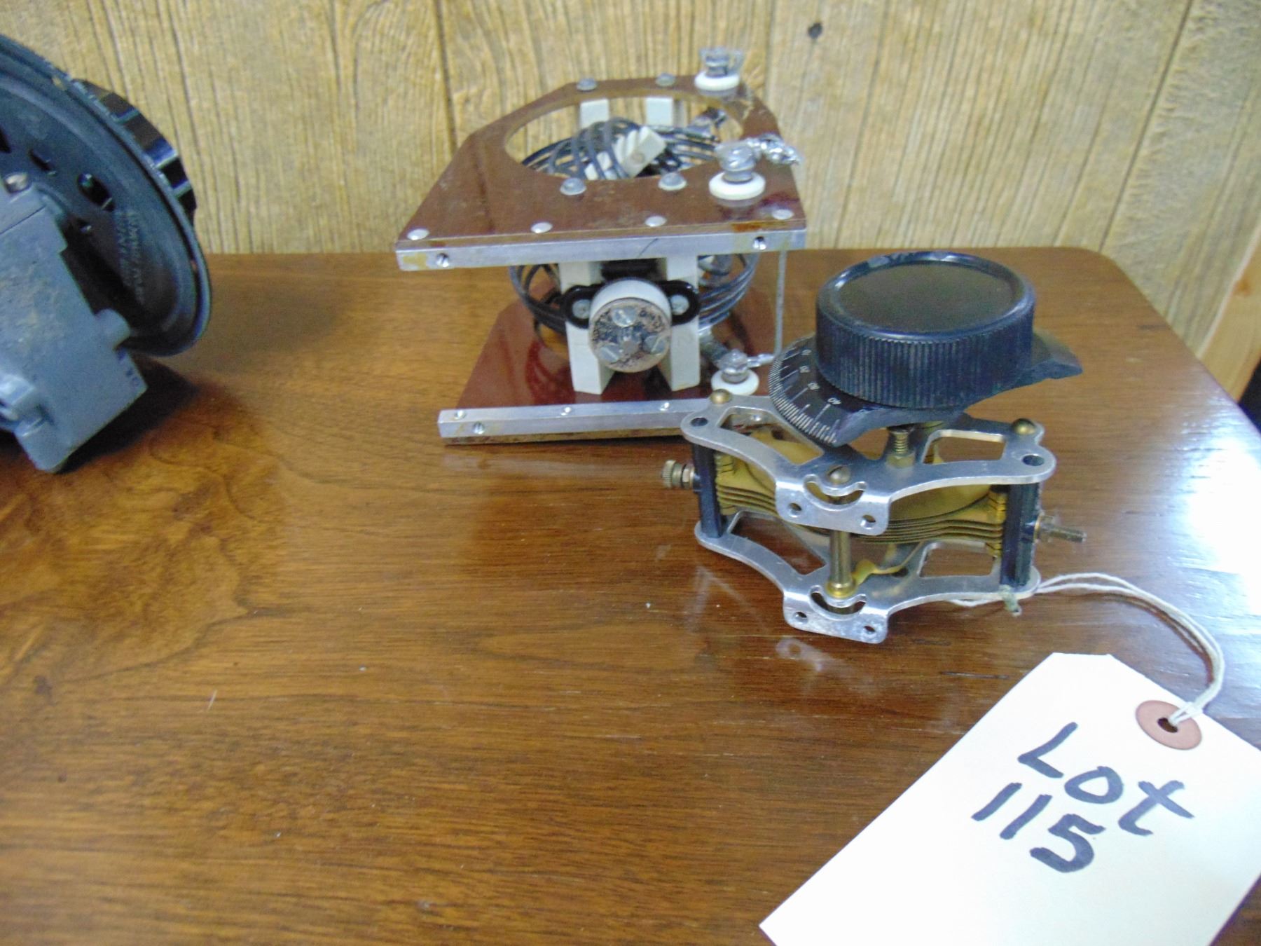 5 items; National tuning unit gear drive; Hewlett Packard wave meter; coil; misc. parts