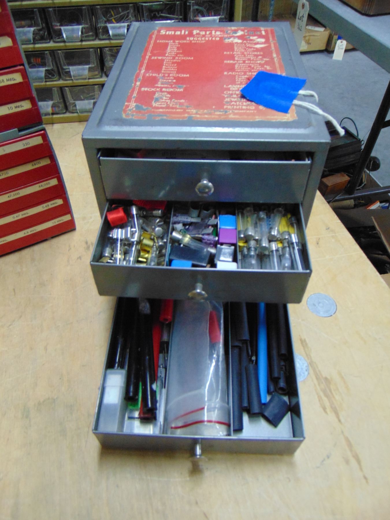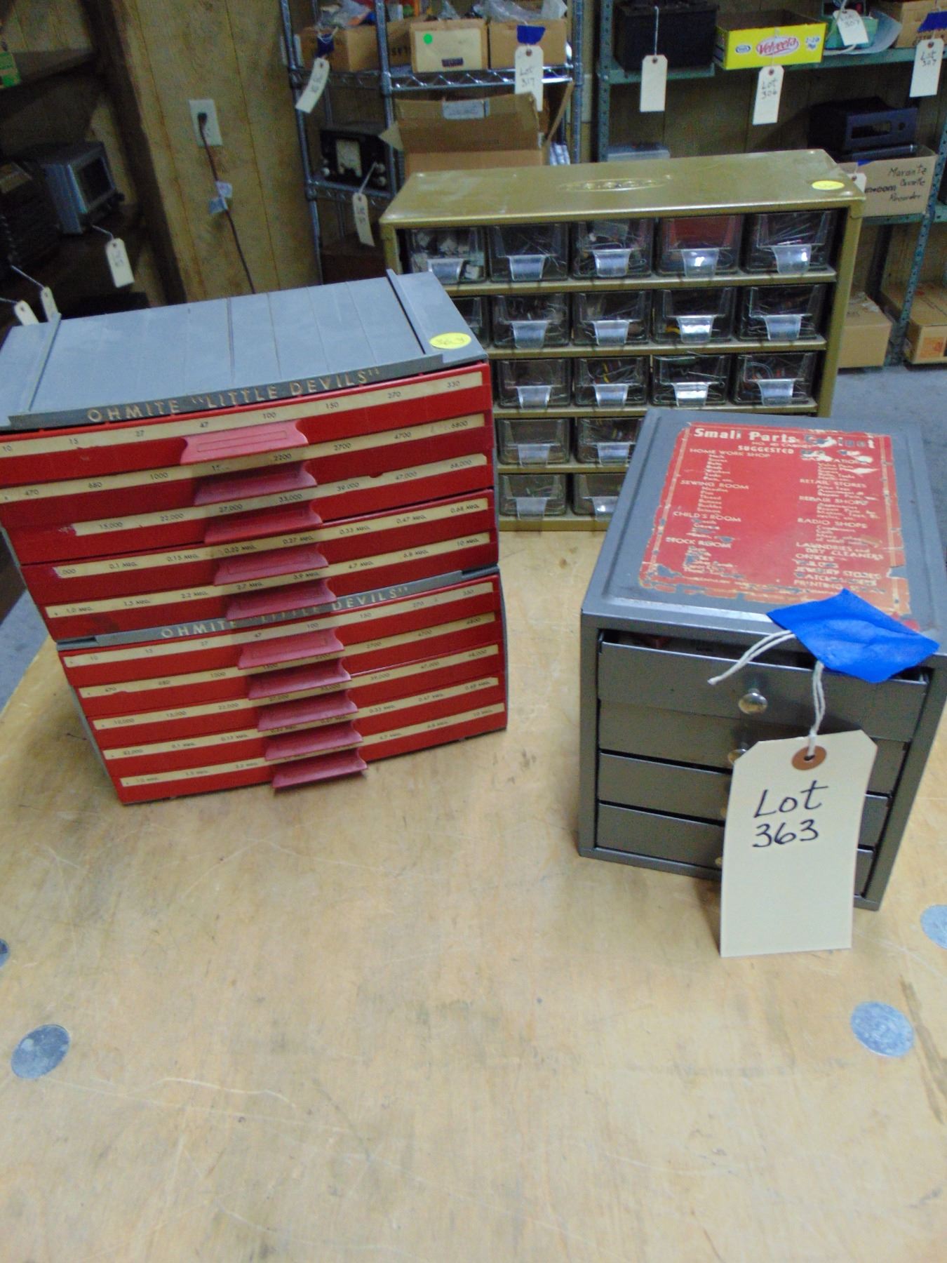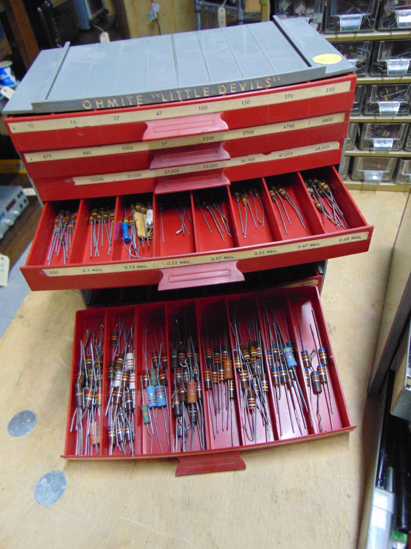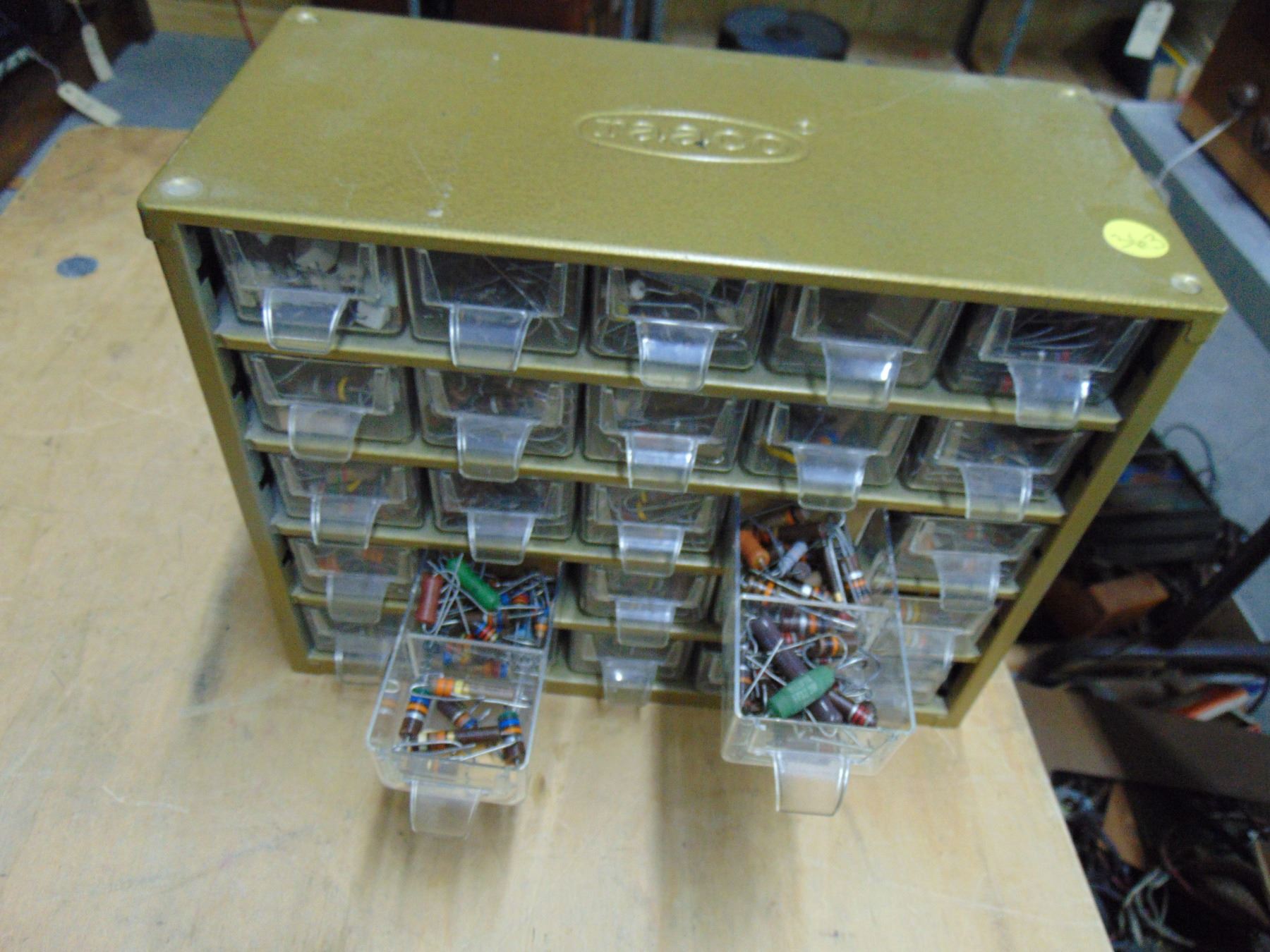 4 parts bins; 3 are bins containing NOS resistors; 1 bin is misc. electrical items