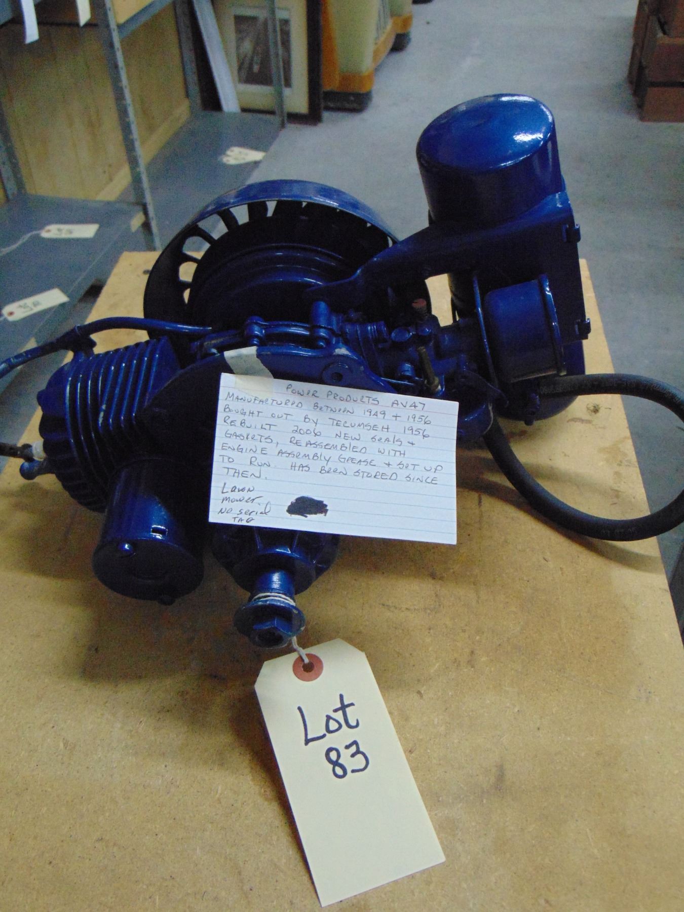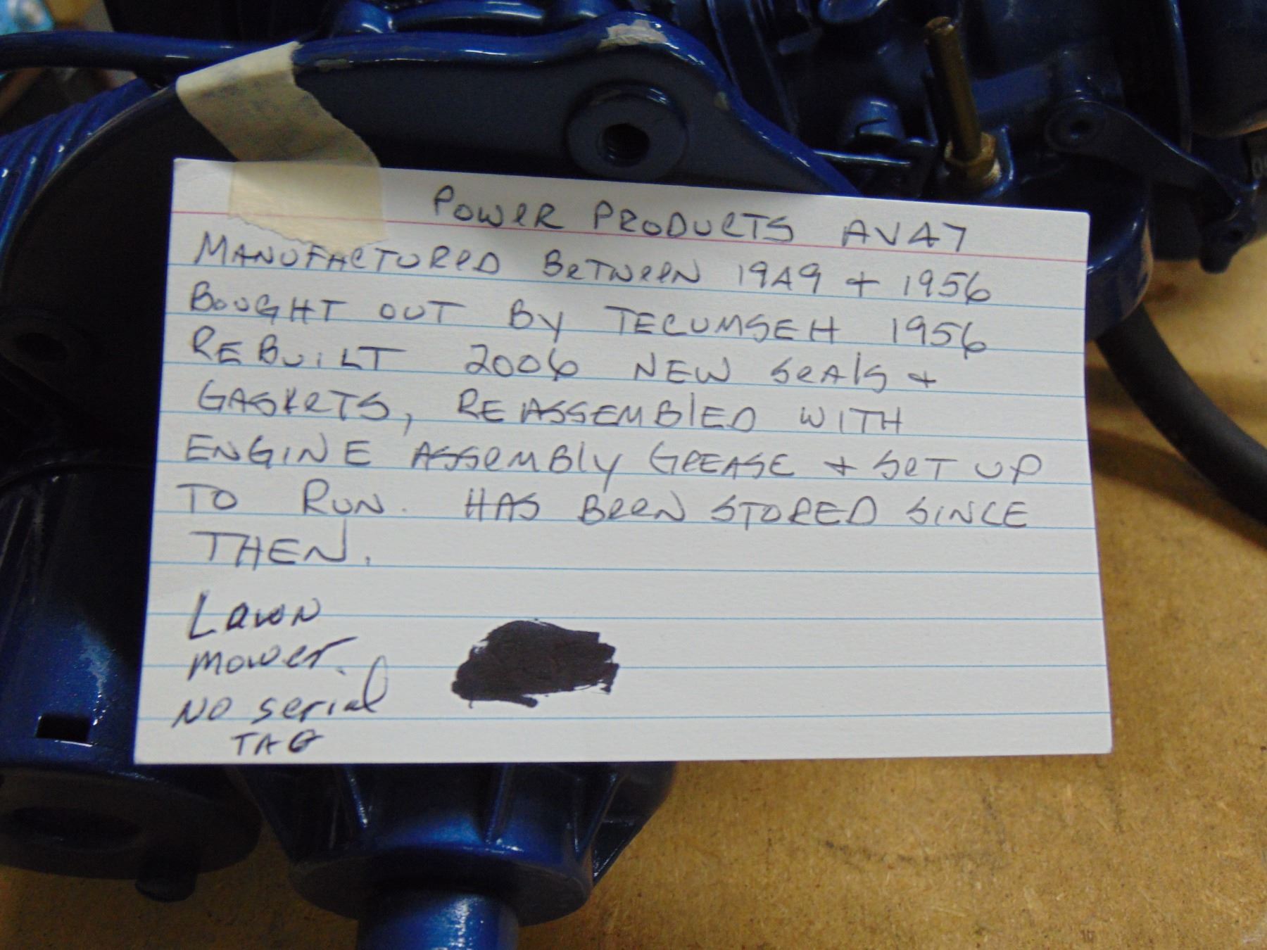 Power Products gas lawn mower engine model AV-47; Manufactured between 1949 and 1956; This unit has been rebuilt with new seals and gaskets; has been stored since 2006. Serial tag is missing