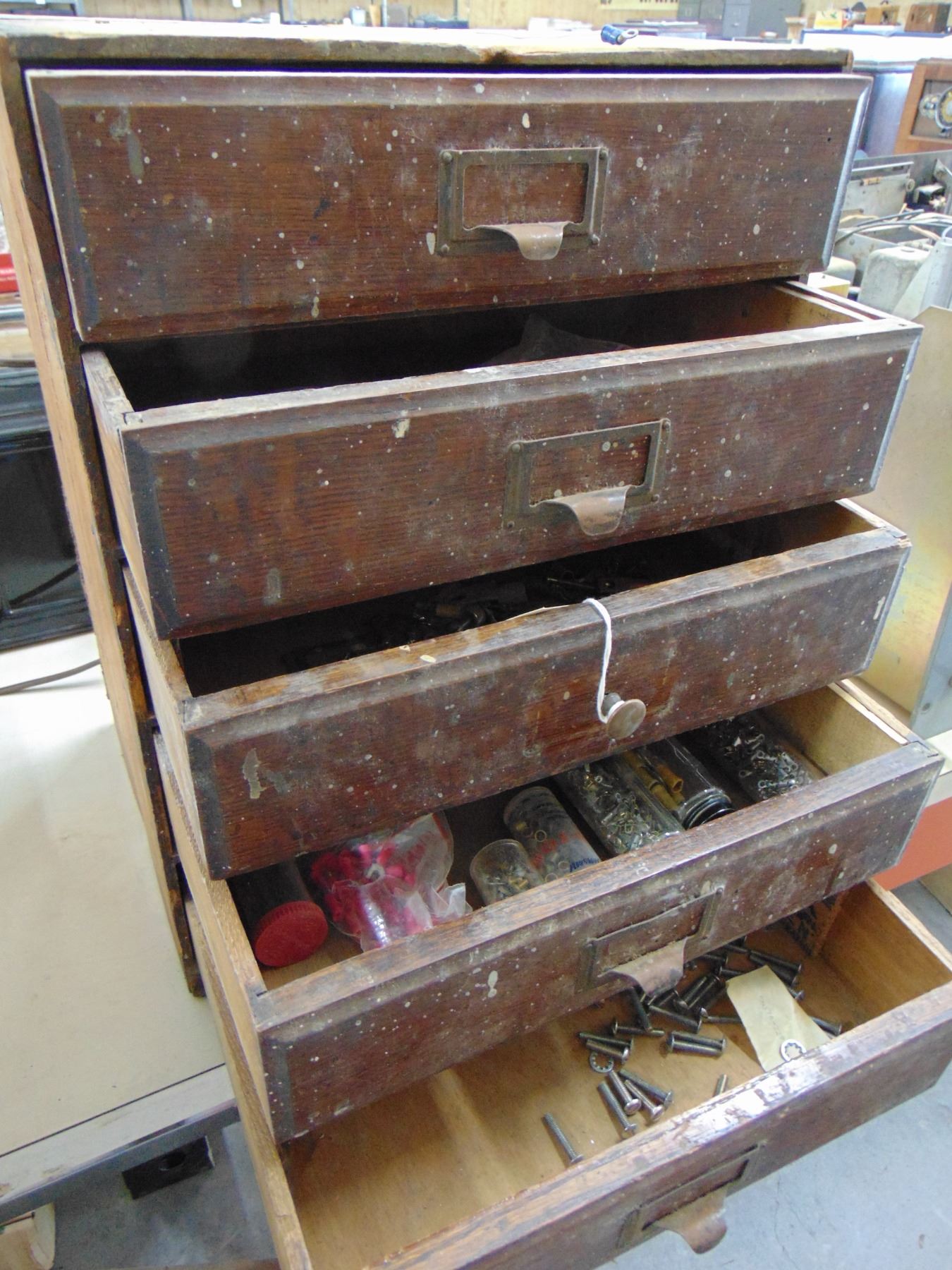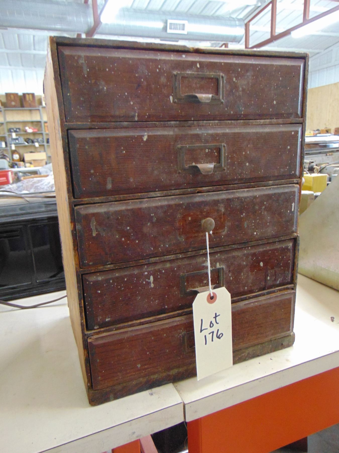 Wood parts cabinet; with 5 drawers; includes some parts; early