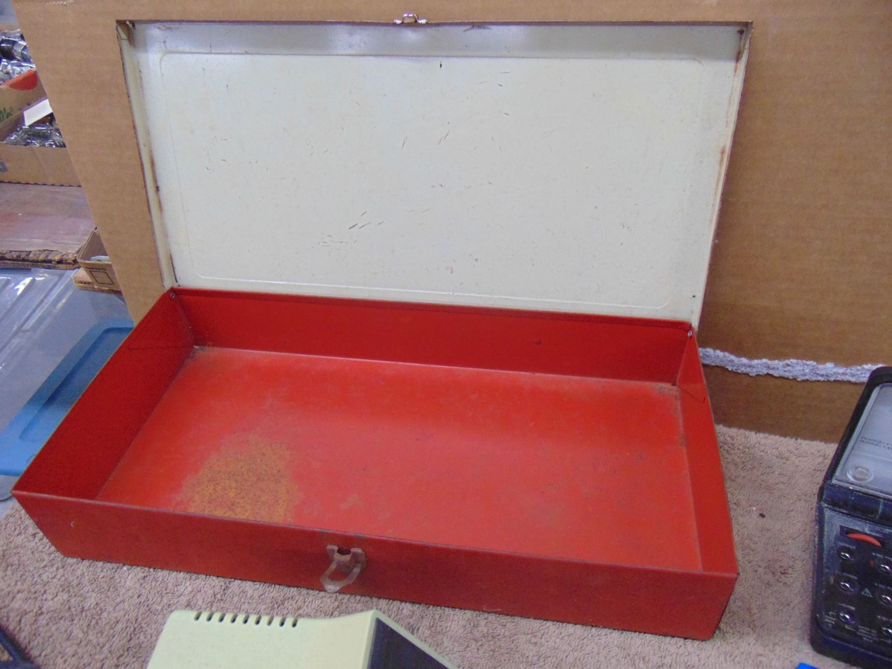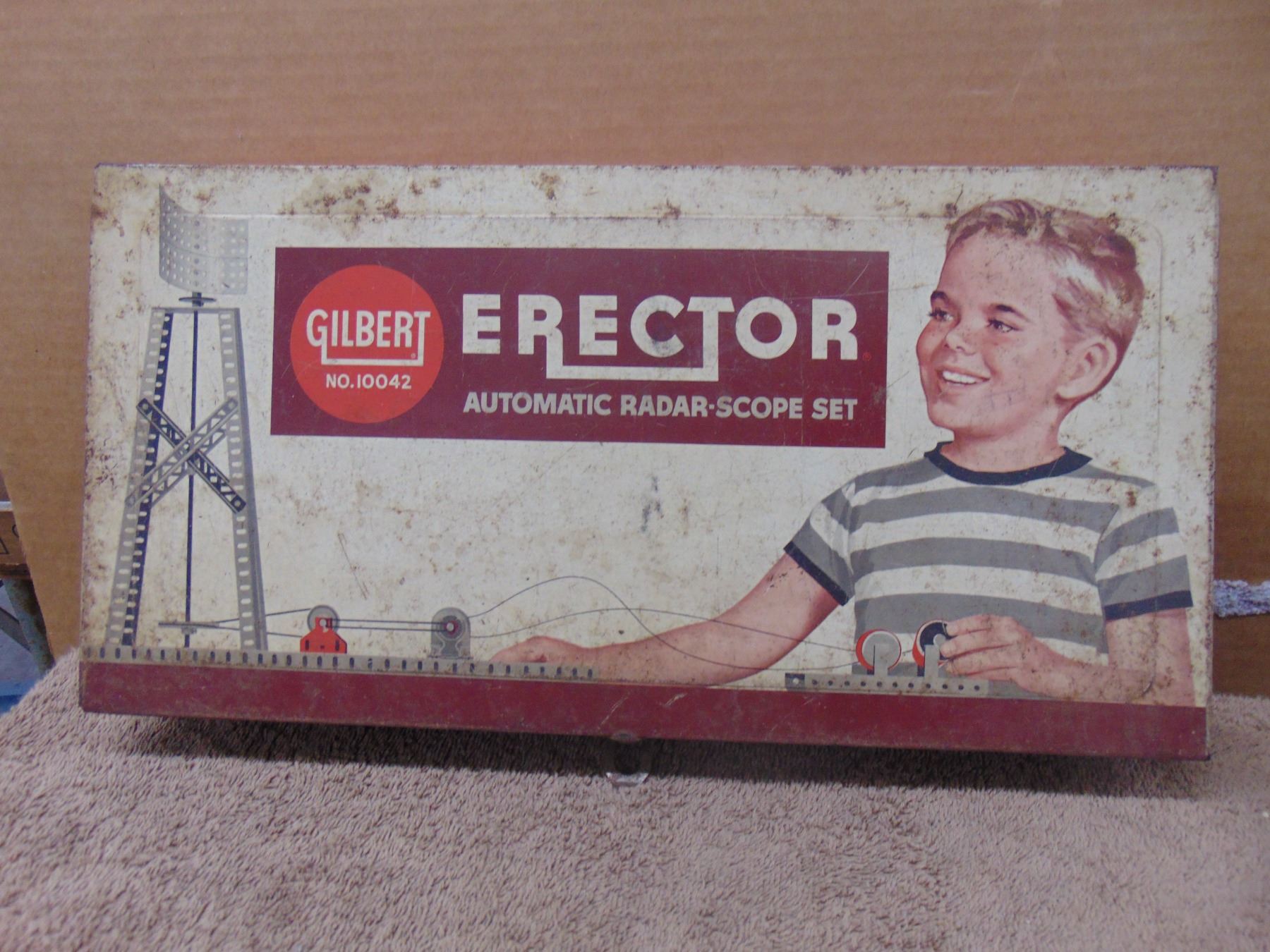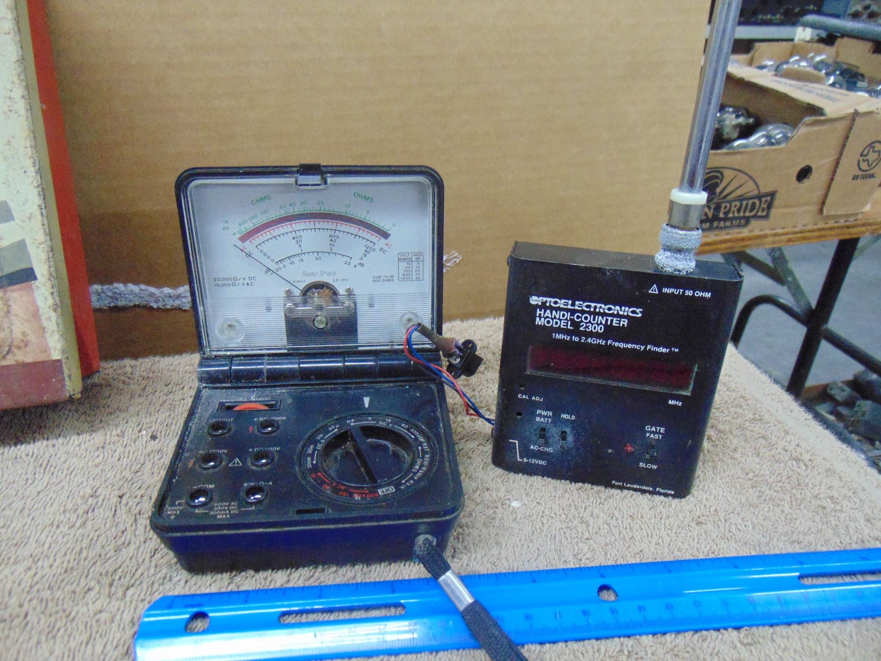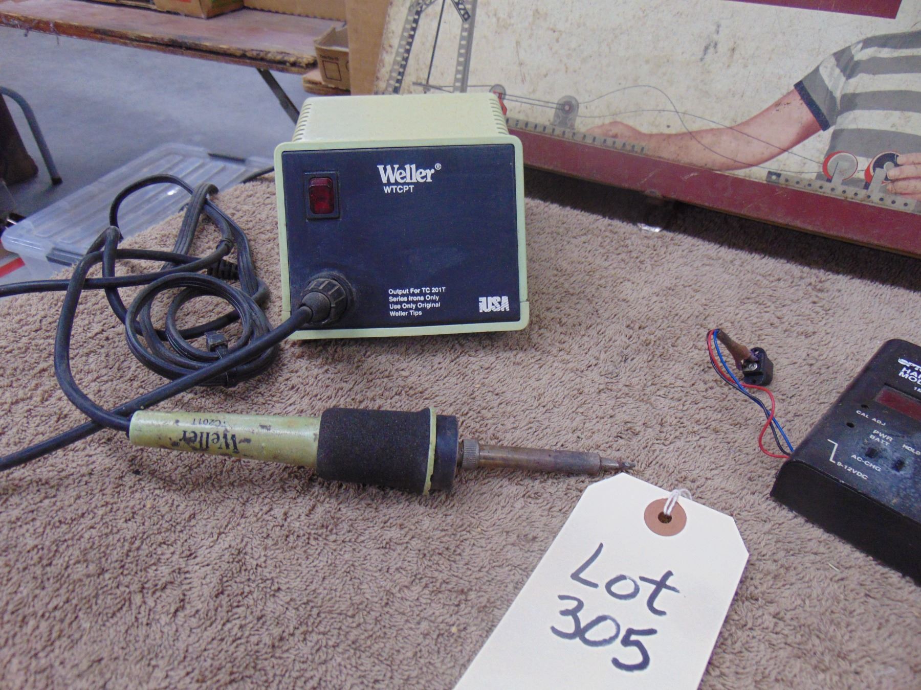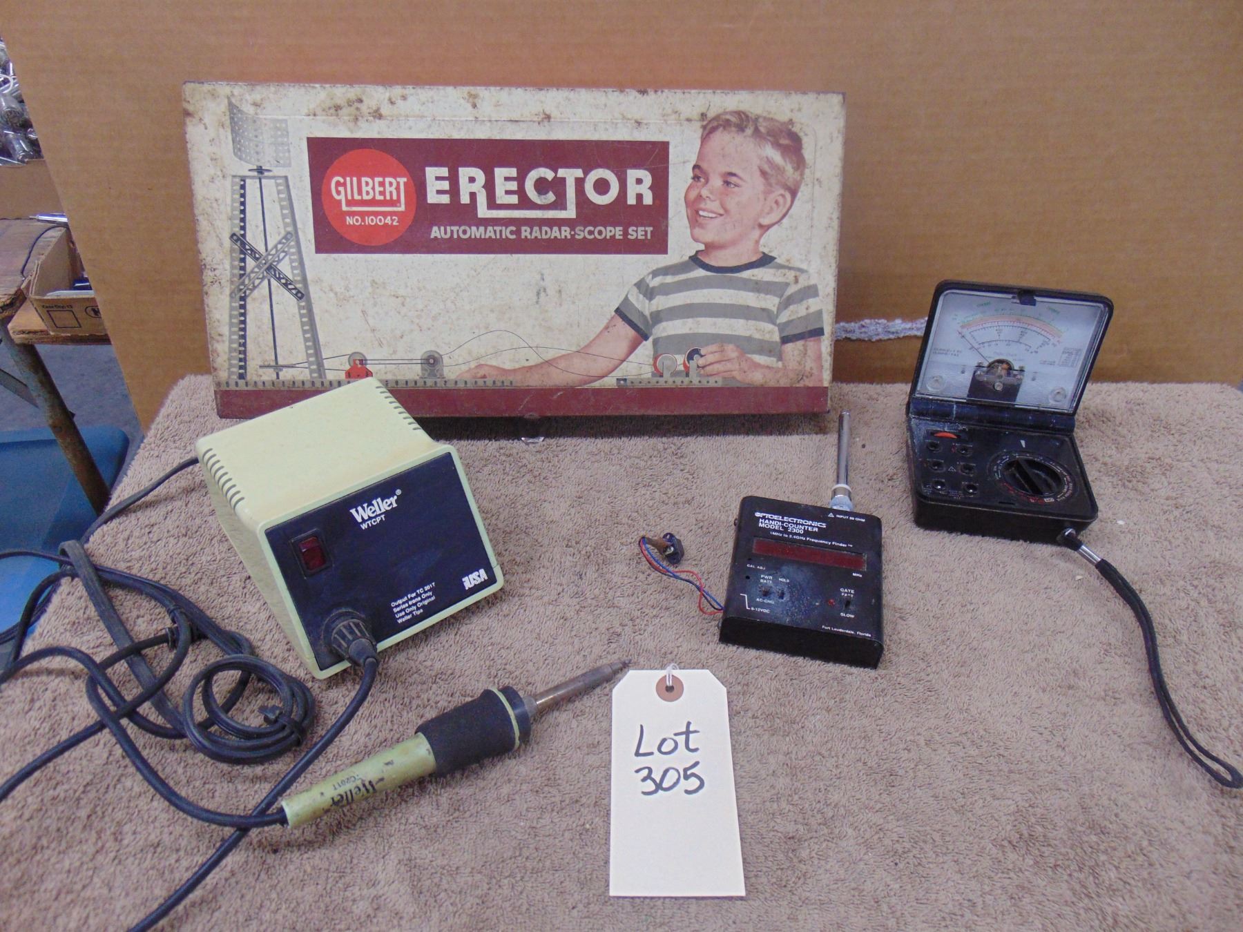 Four items; includes vintage Erector set (box only), Weller soldering iron station, Radio Shack VOM, and hand-held frequency counter