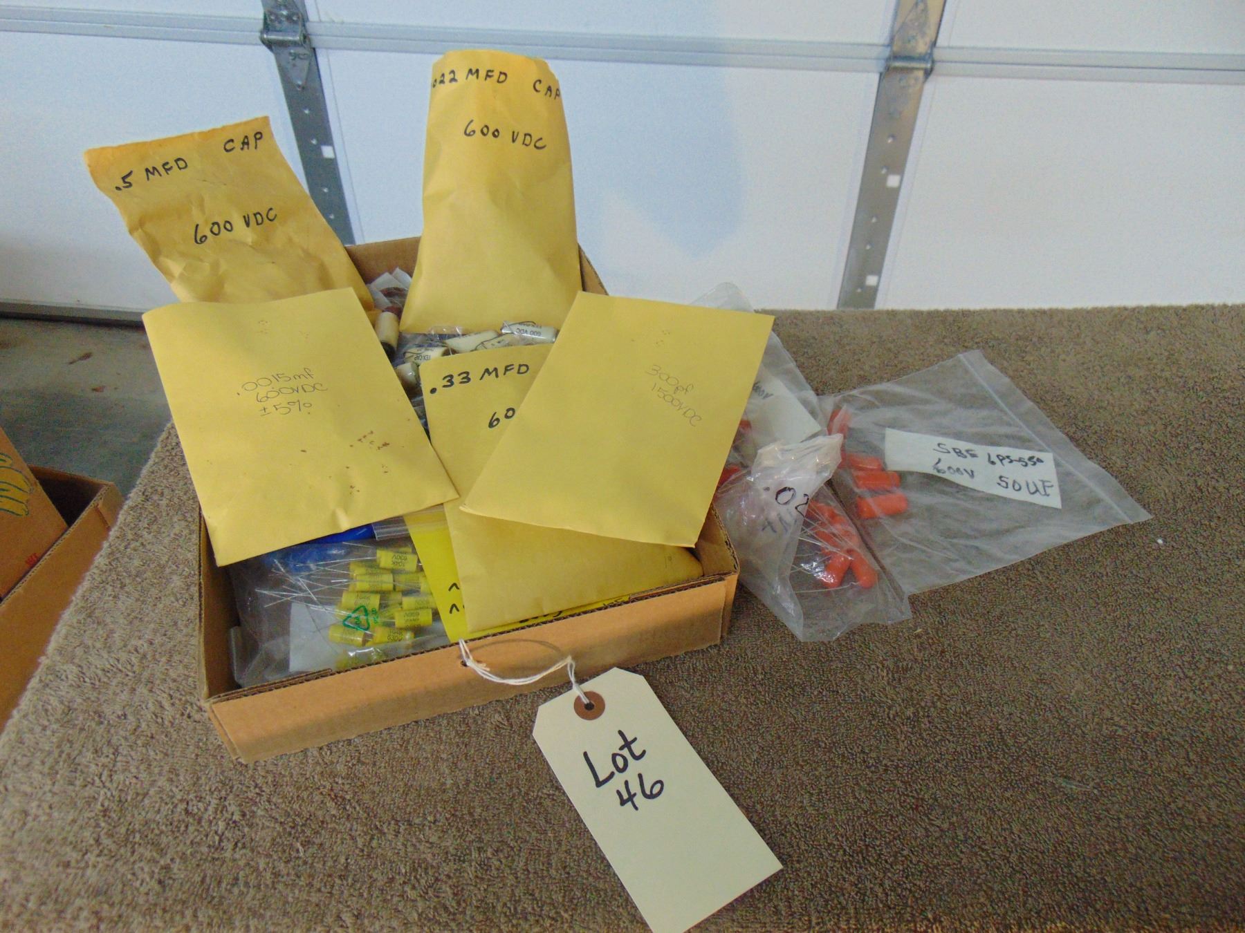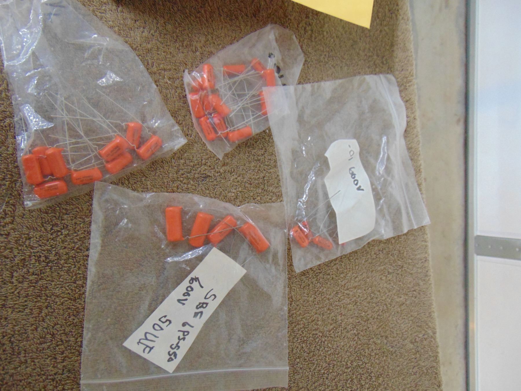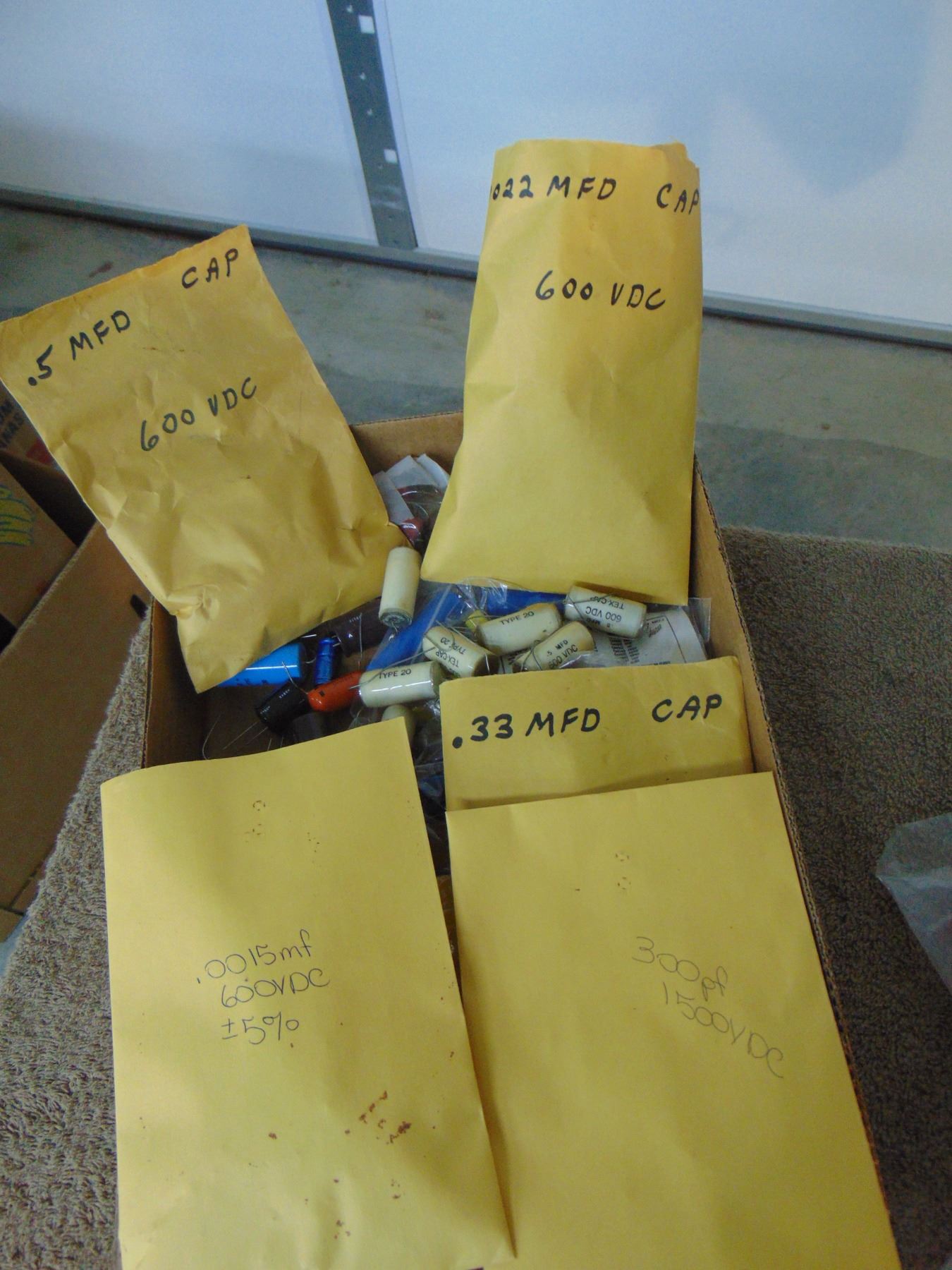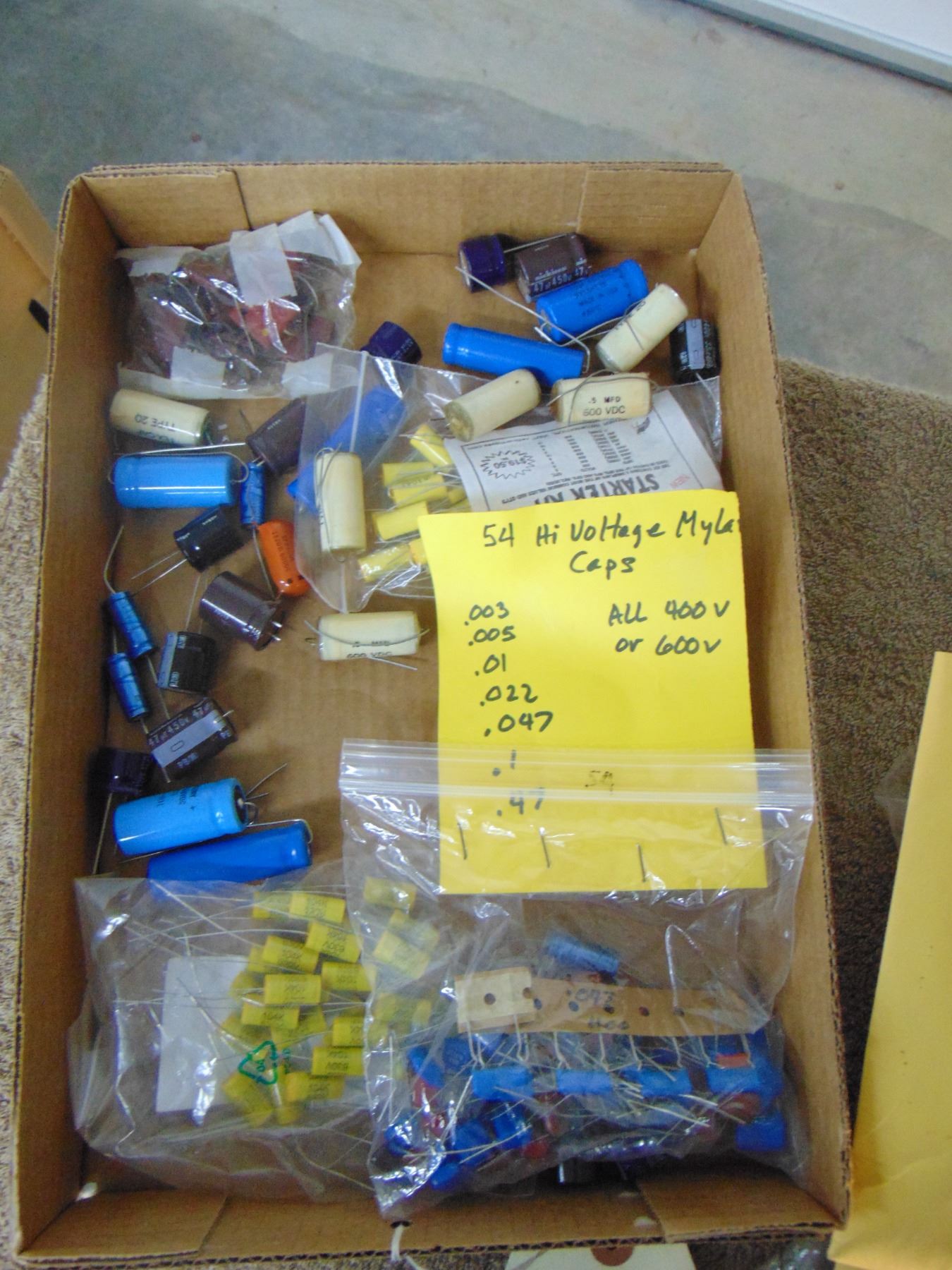 Flat of mostly NOS high voltage electrolytic and non-electrolytic capacitors; excellent lot
