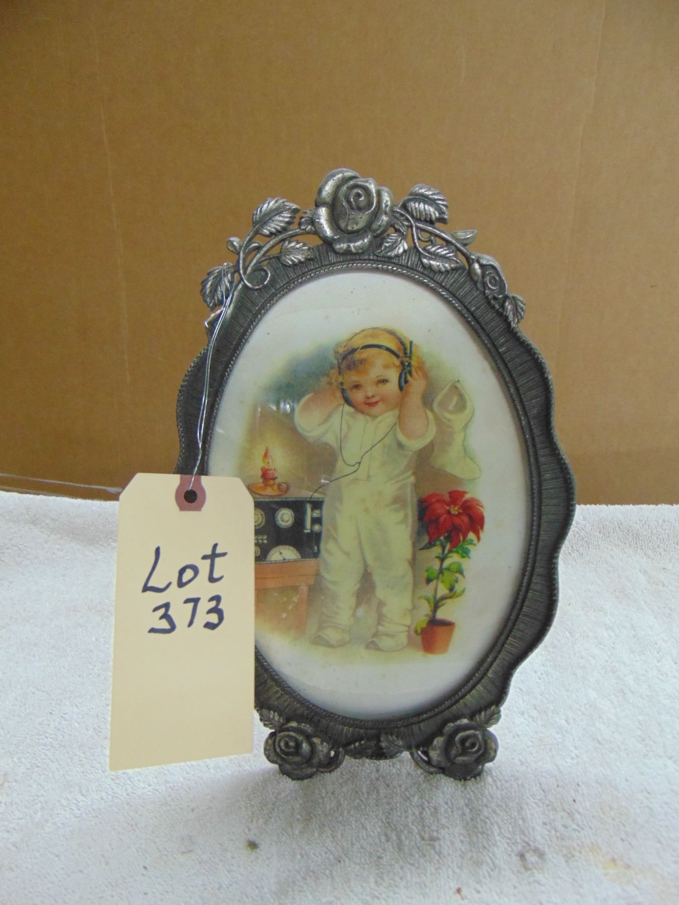 Framed vintage Christmas card featuring radio; circa 1920's; nice