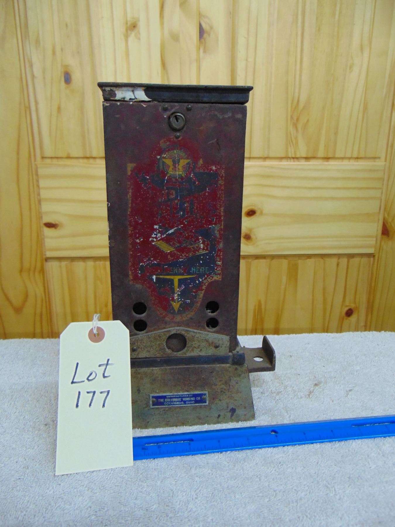 Vintage small box wooden matches vending machine; metal; no key; circa 1920's; awaiting restoration; Columbus Vending Co.
