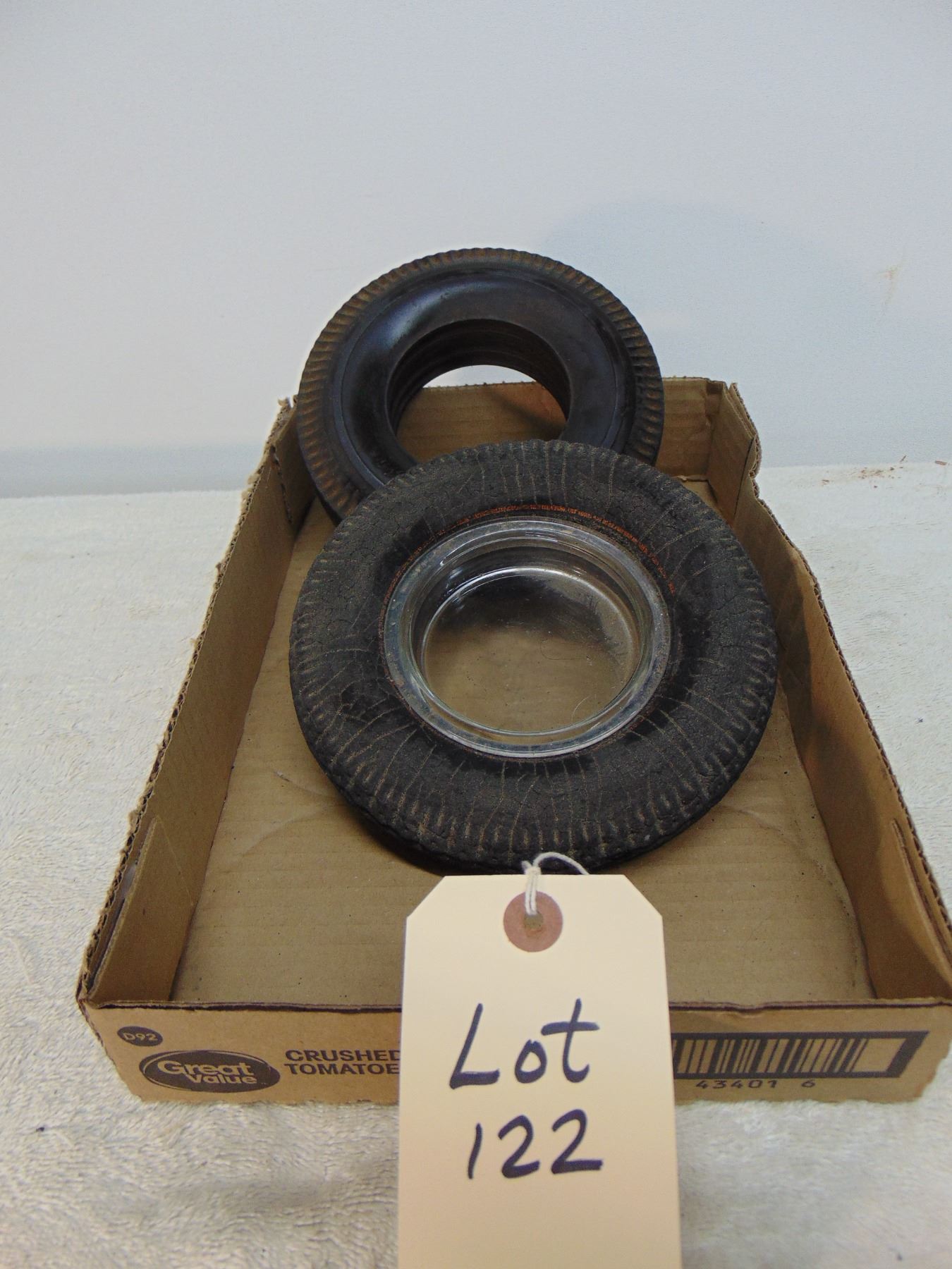 Flat of two advertising ashtrays; one Firestone (missing ashtray), one Cooper; rubber tires