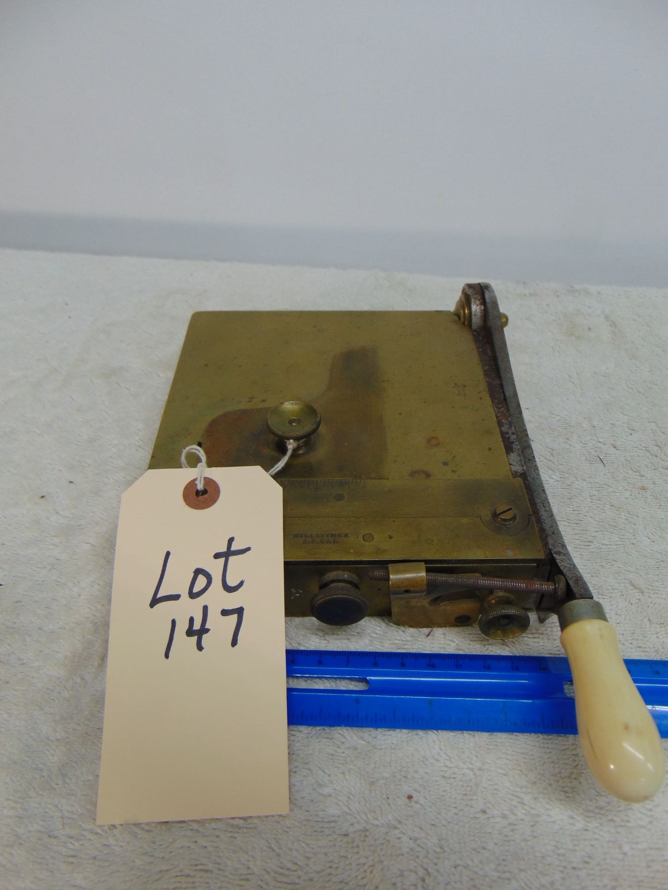 Playing card trimmer manufactured by Will & Finck in San Francisco , circa late 1800's; solid brass construction