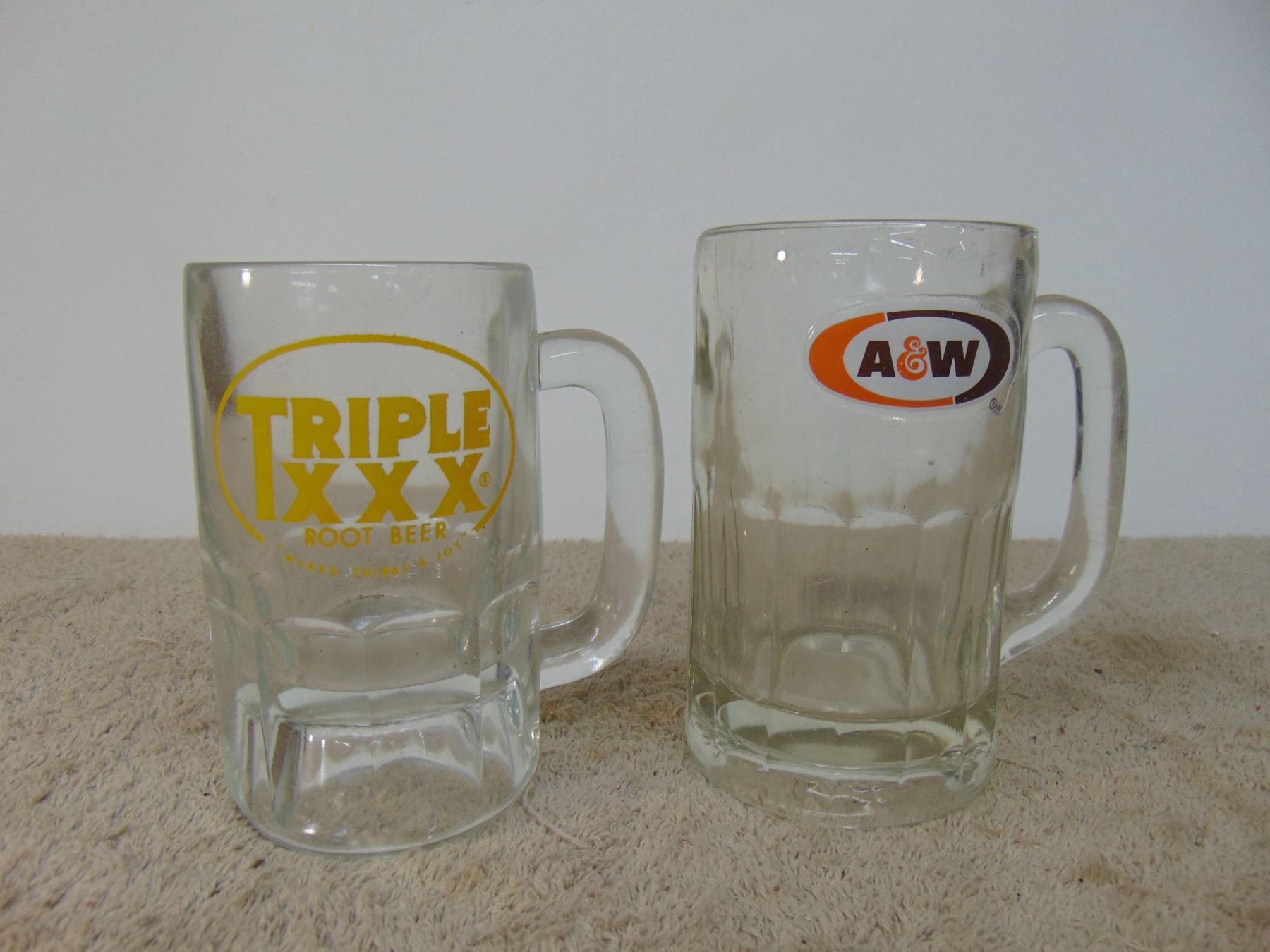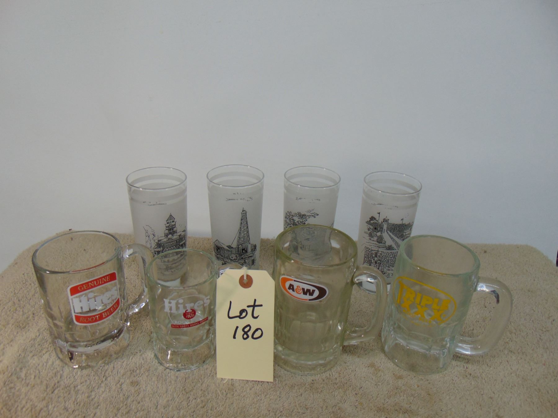 Flat of glassware; includes A&W, Hires, and XXX Root Beer; 8 pieces