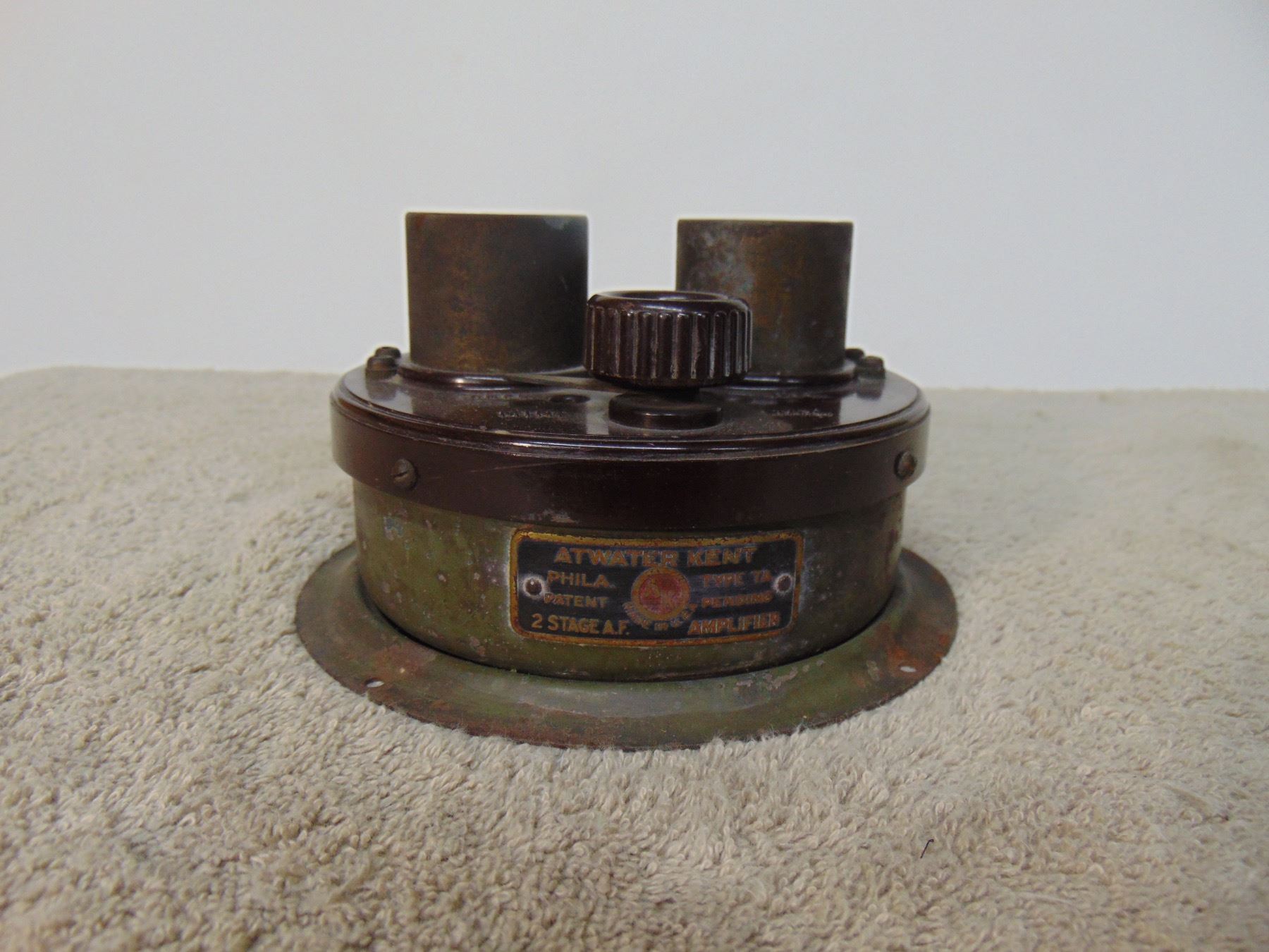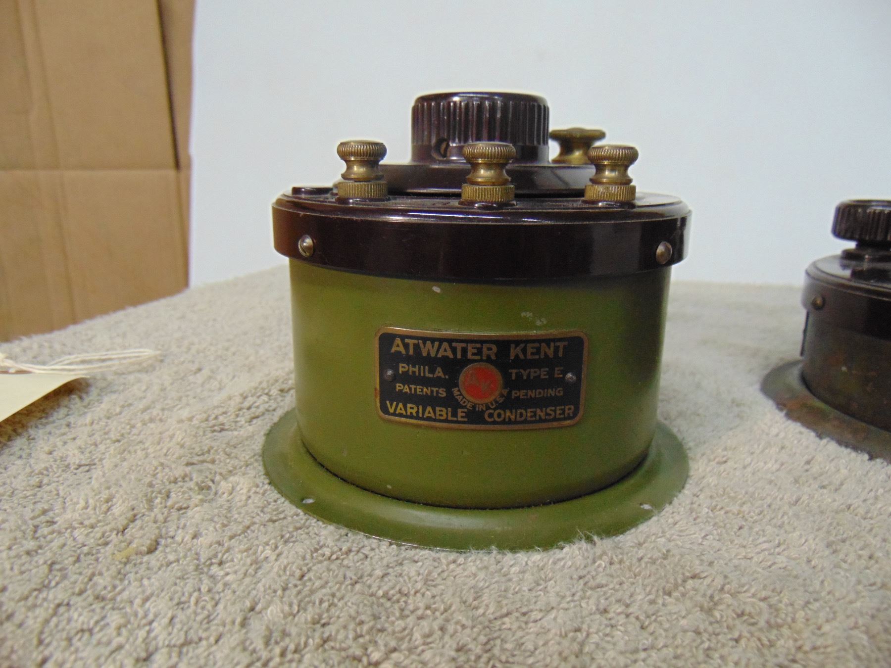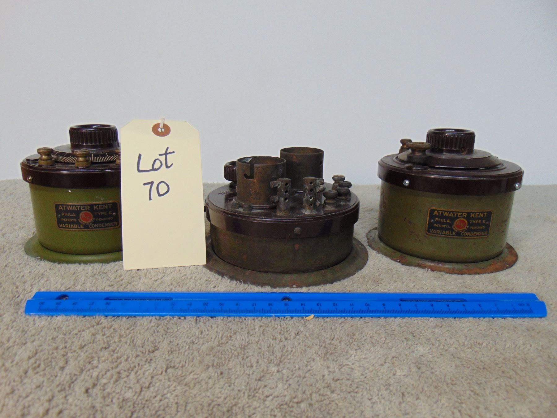 Flat of Atwater Kent tuning capacitors (type E); 2 stage audio frequency amplifier (model TA); all three in early green paint