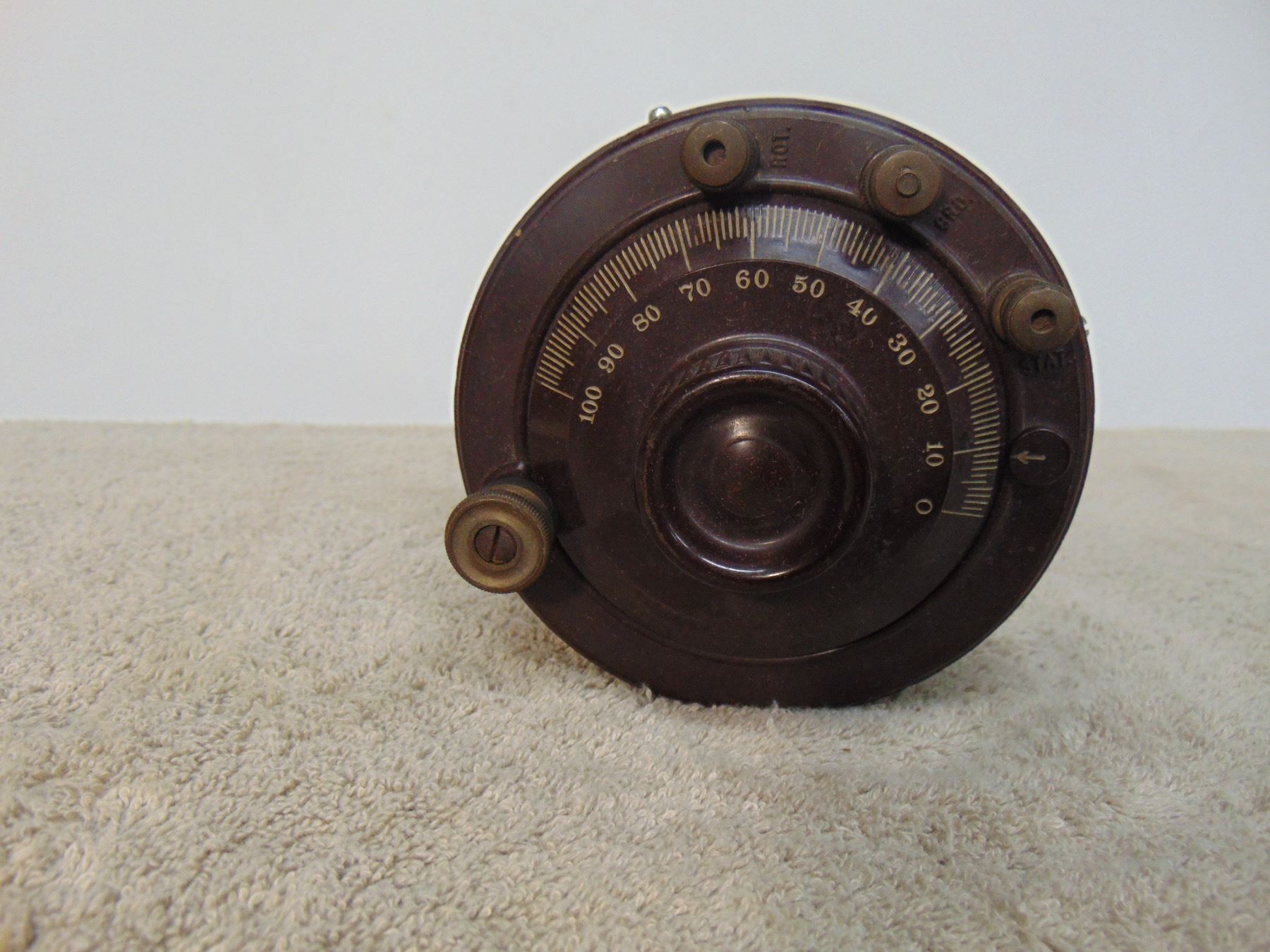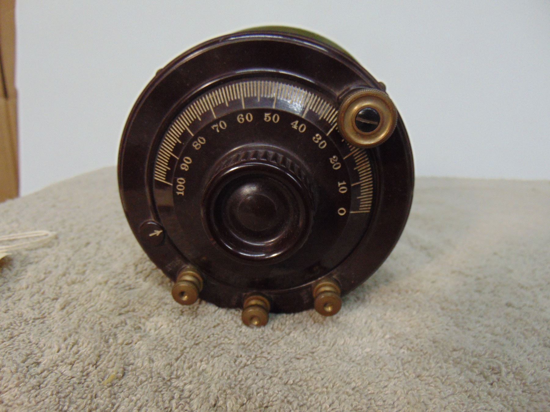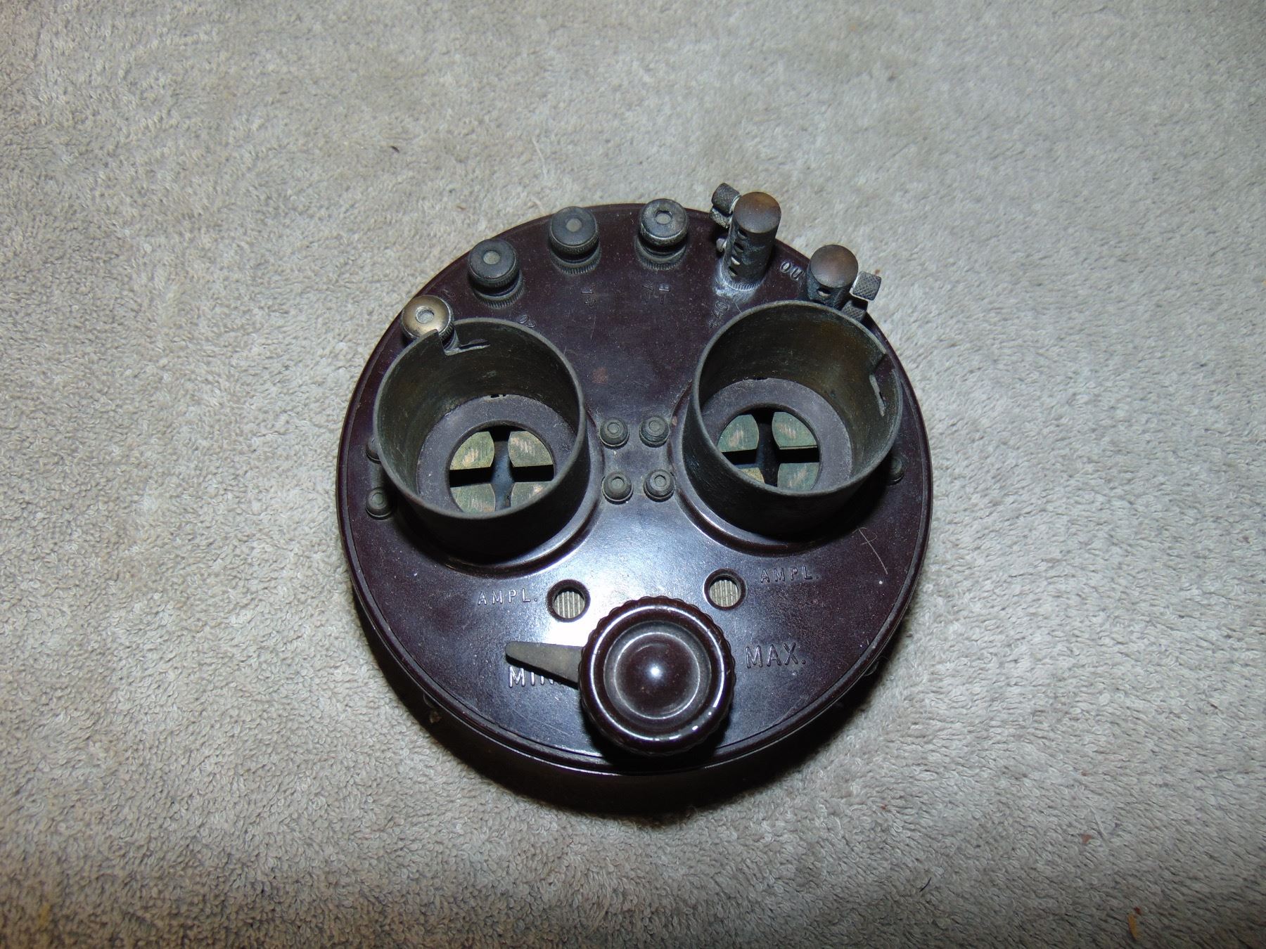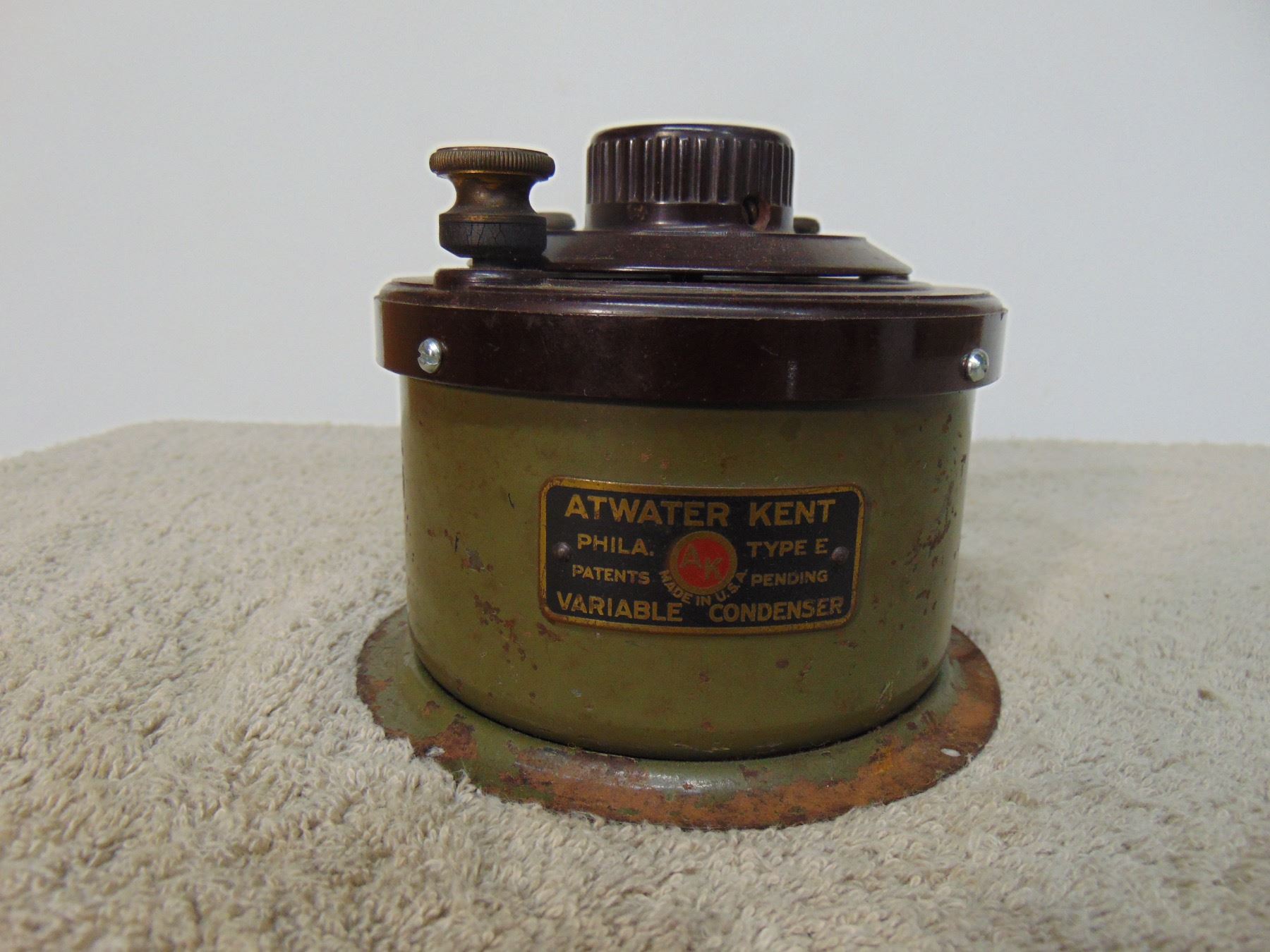 Flat of Atwater Kent tuning capacitors (type E); 2 stage audio frequency amplifier (model TA); all three in early green paint
