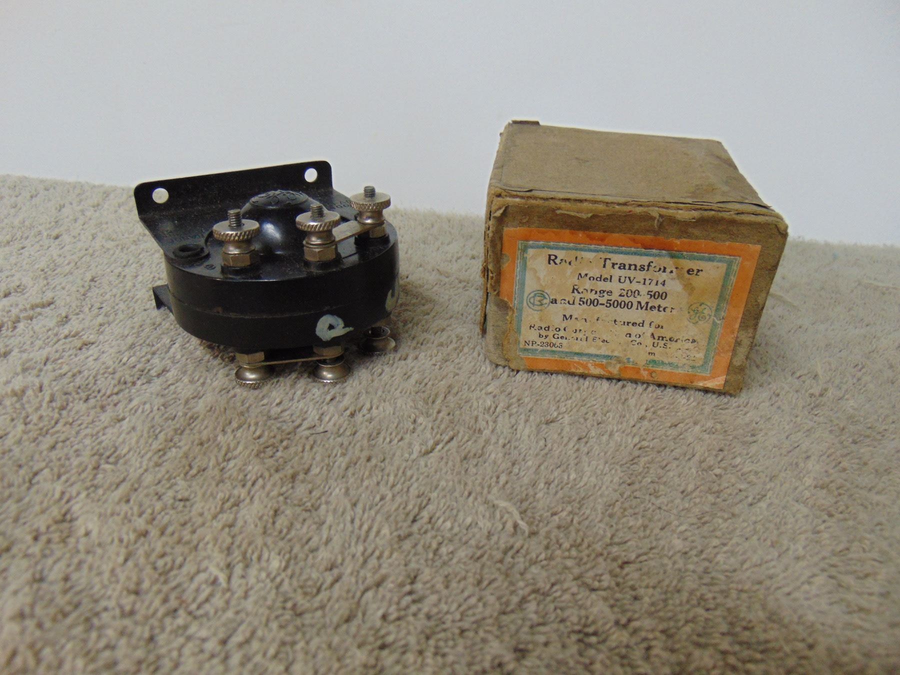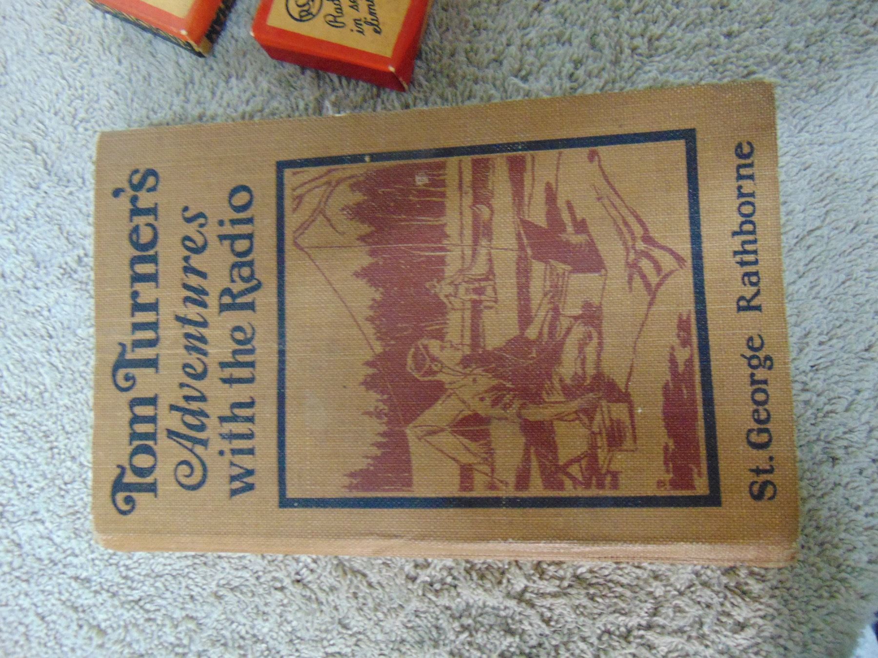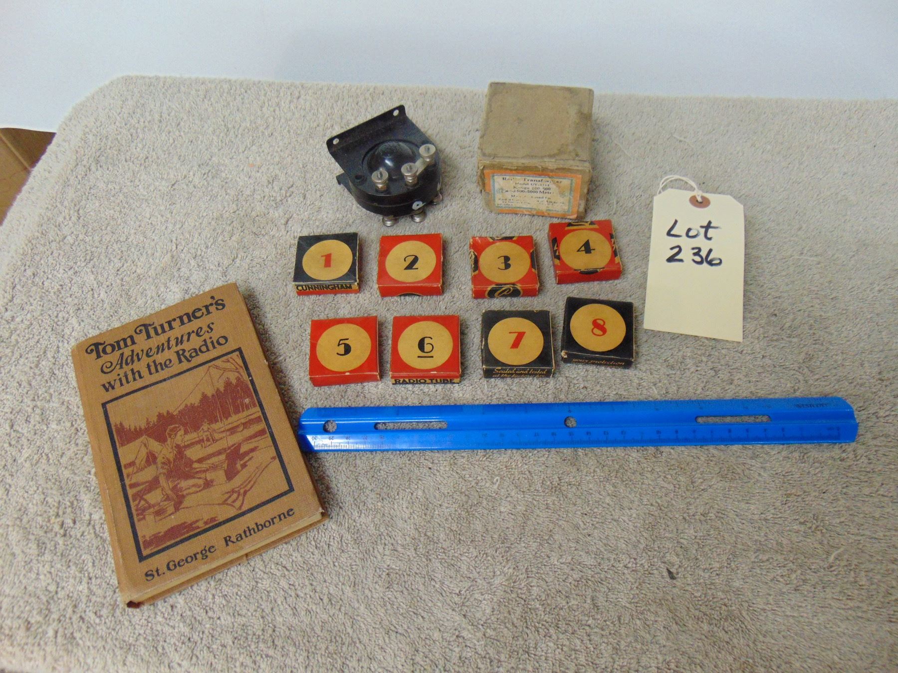 Three items: 1) Tom Turner Radio Adventures juvenile book; 2) RCA radio transformer, model UV-1714 (NIB); 3) Cunningham/RCA tube box puzzle (complete)