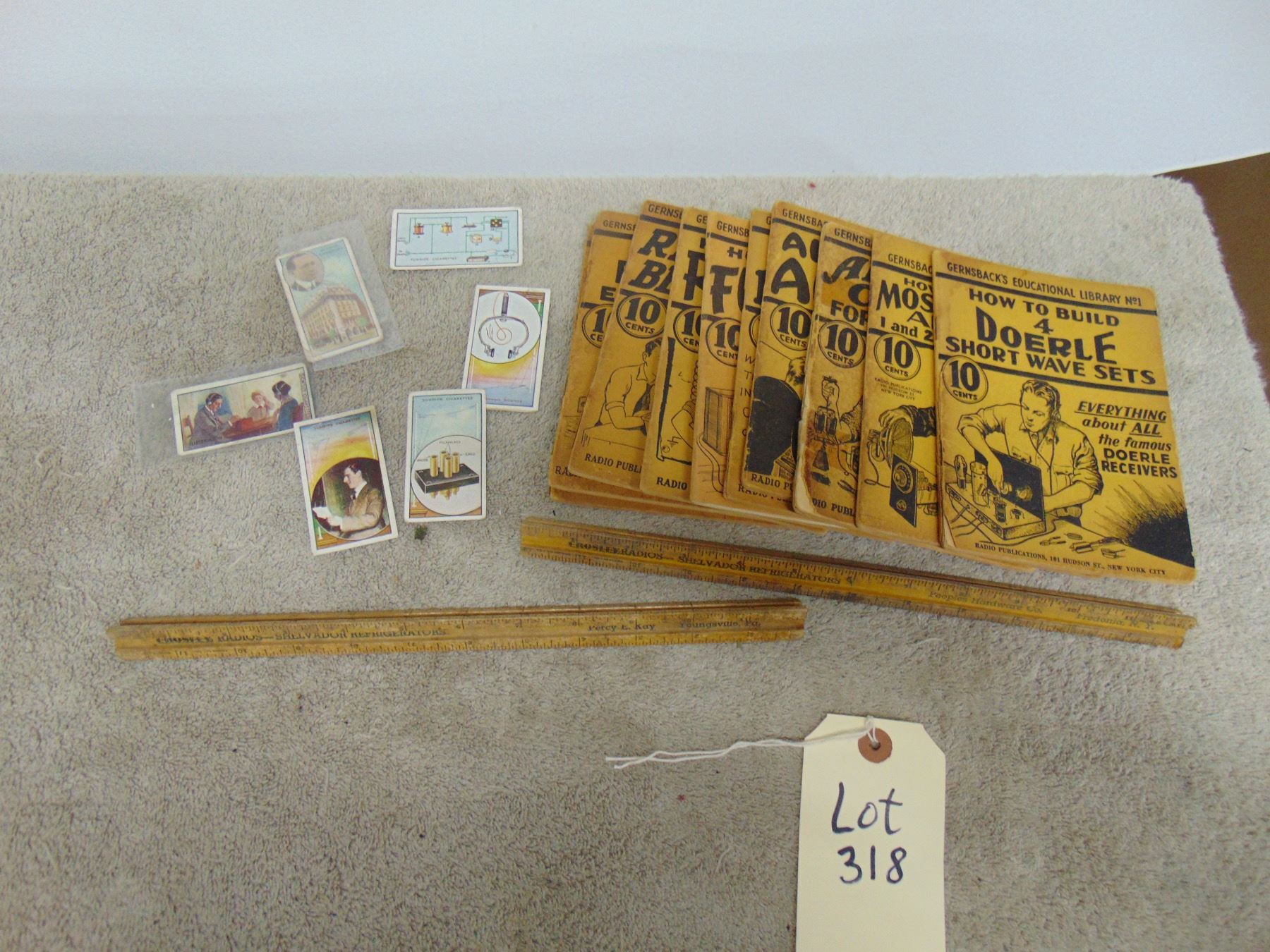 Three items: 1) 10 volume set of Gernsback educational library books; 2) cigarette trading cards depicting wireless appparatus, rare; 3) 2 Crosley radio rulers