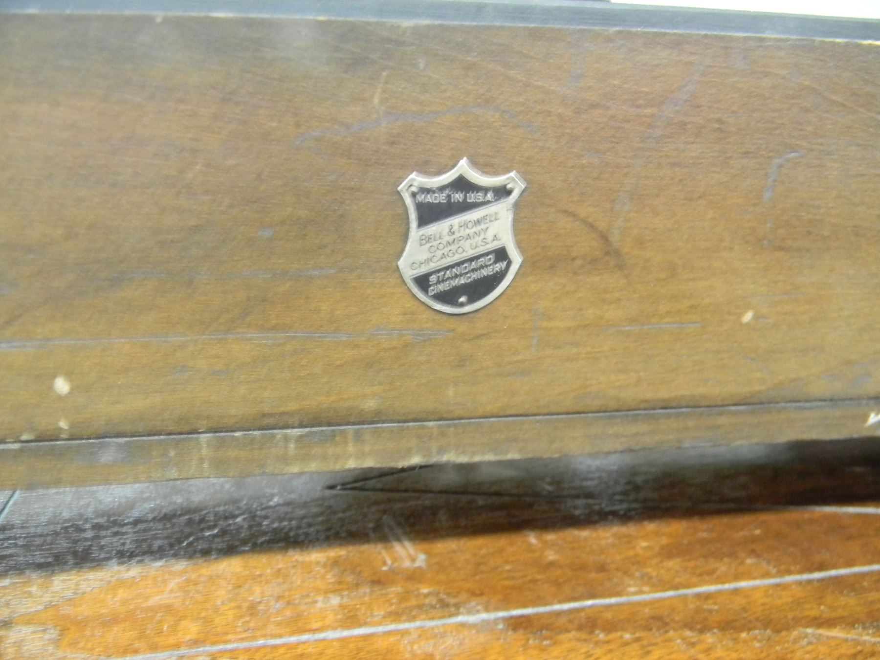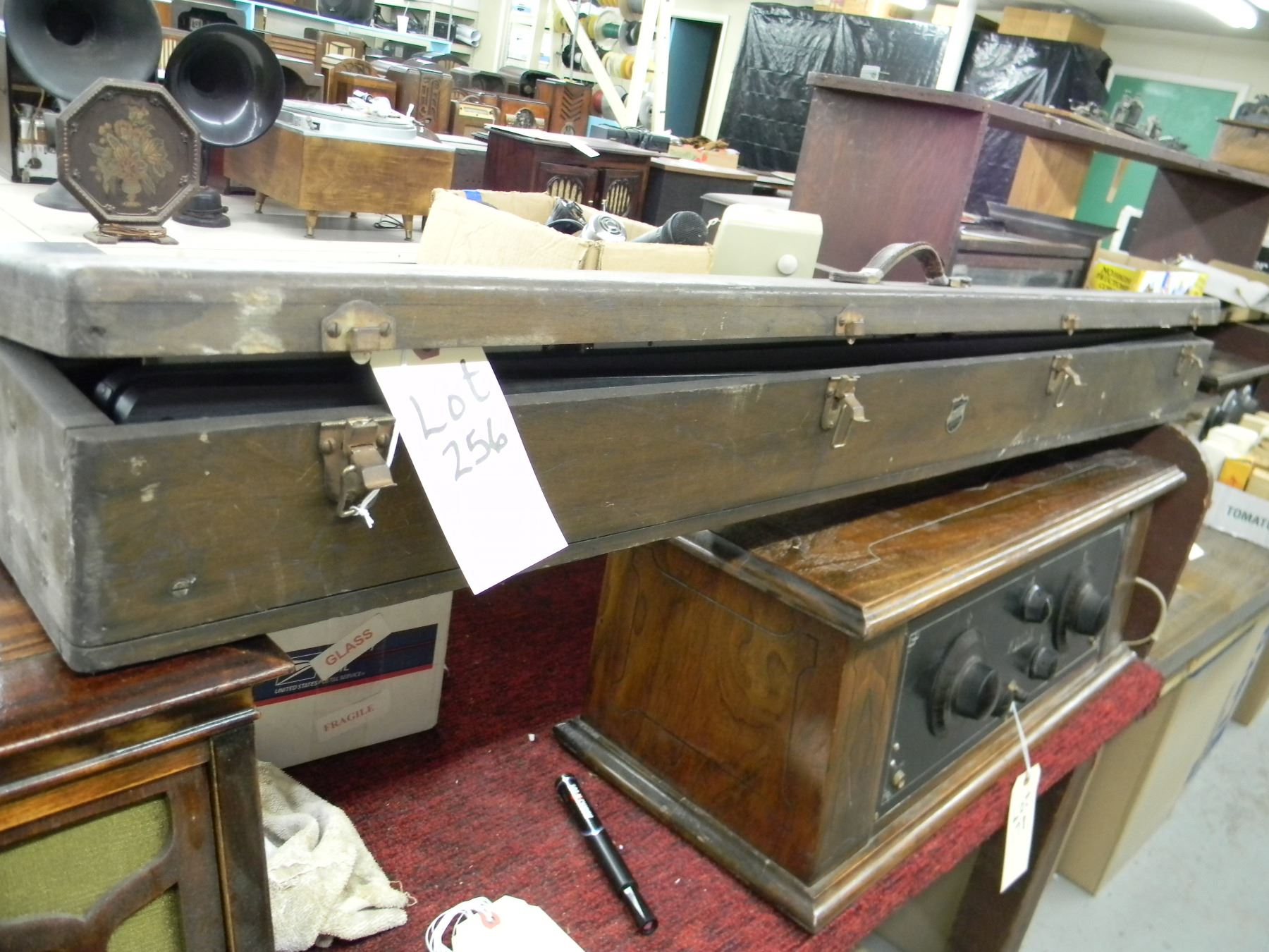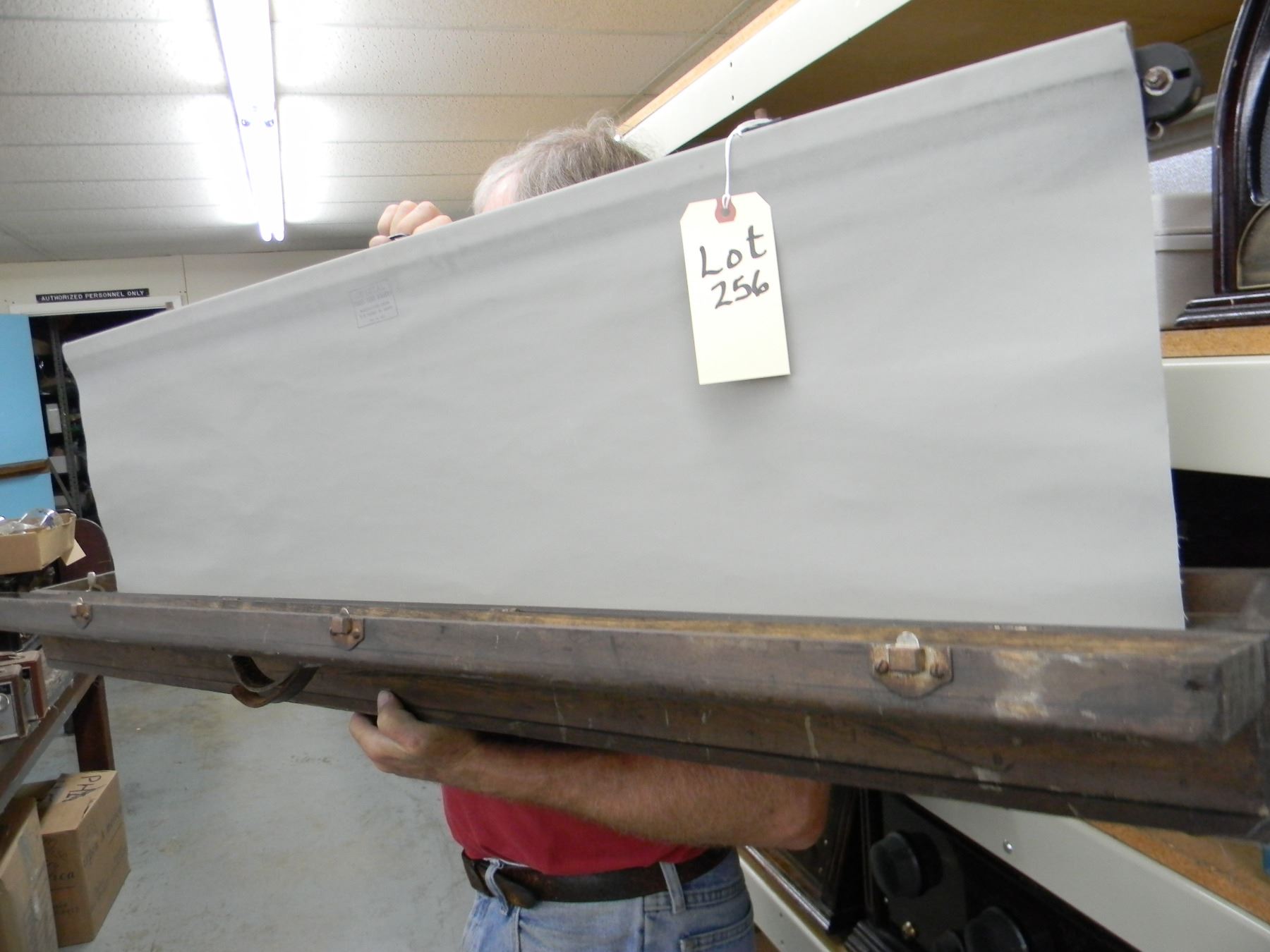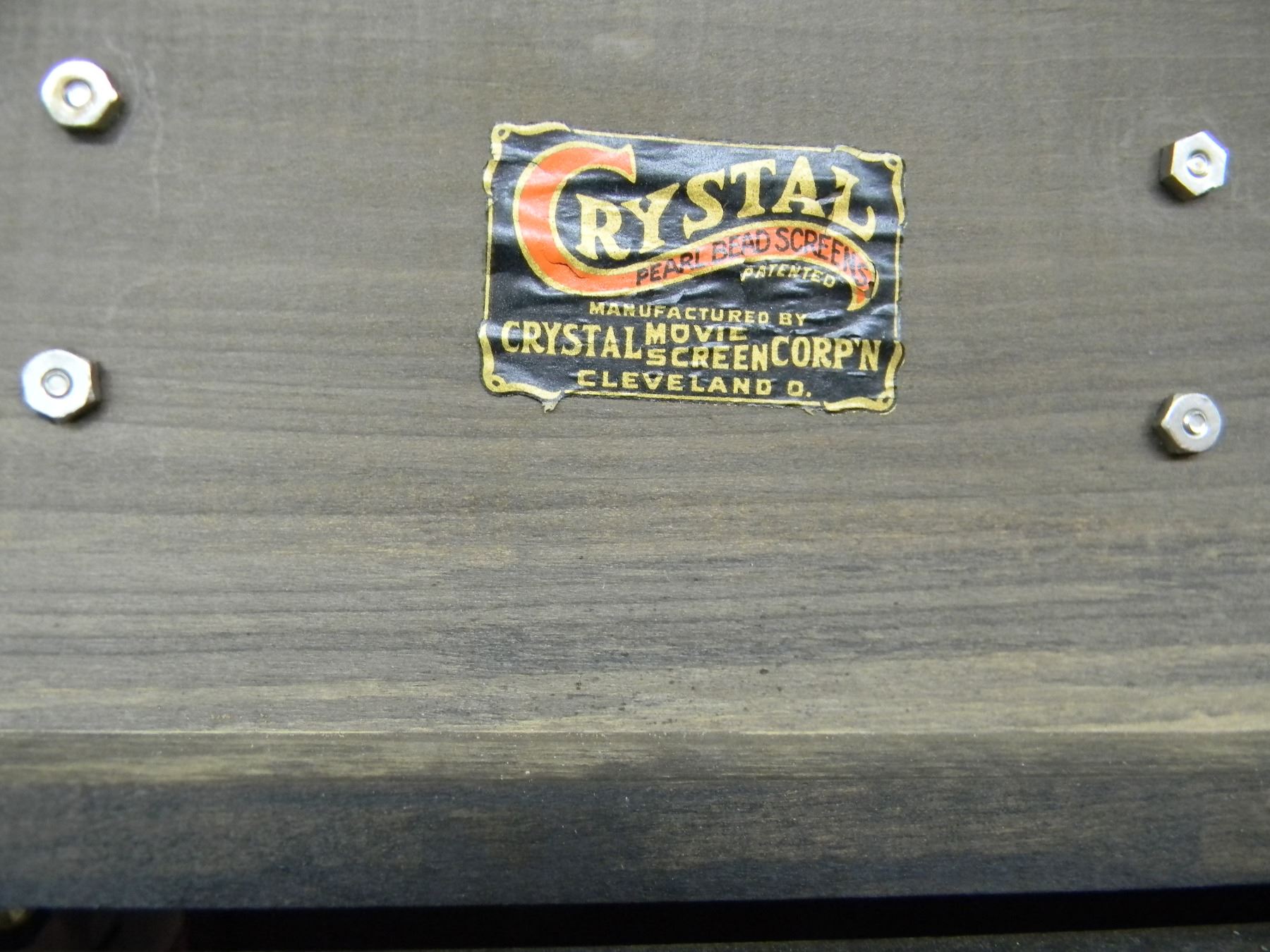 Early movie screen in wood box; Used by military for training films; manufactured by the Crystal Movie Screen Corp.; patented 1916