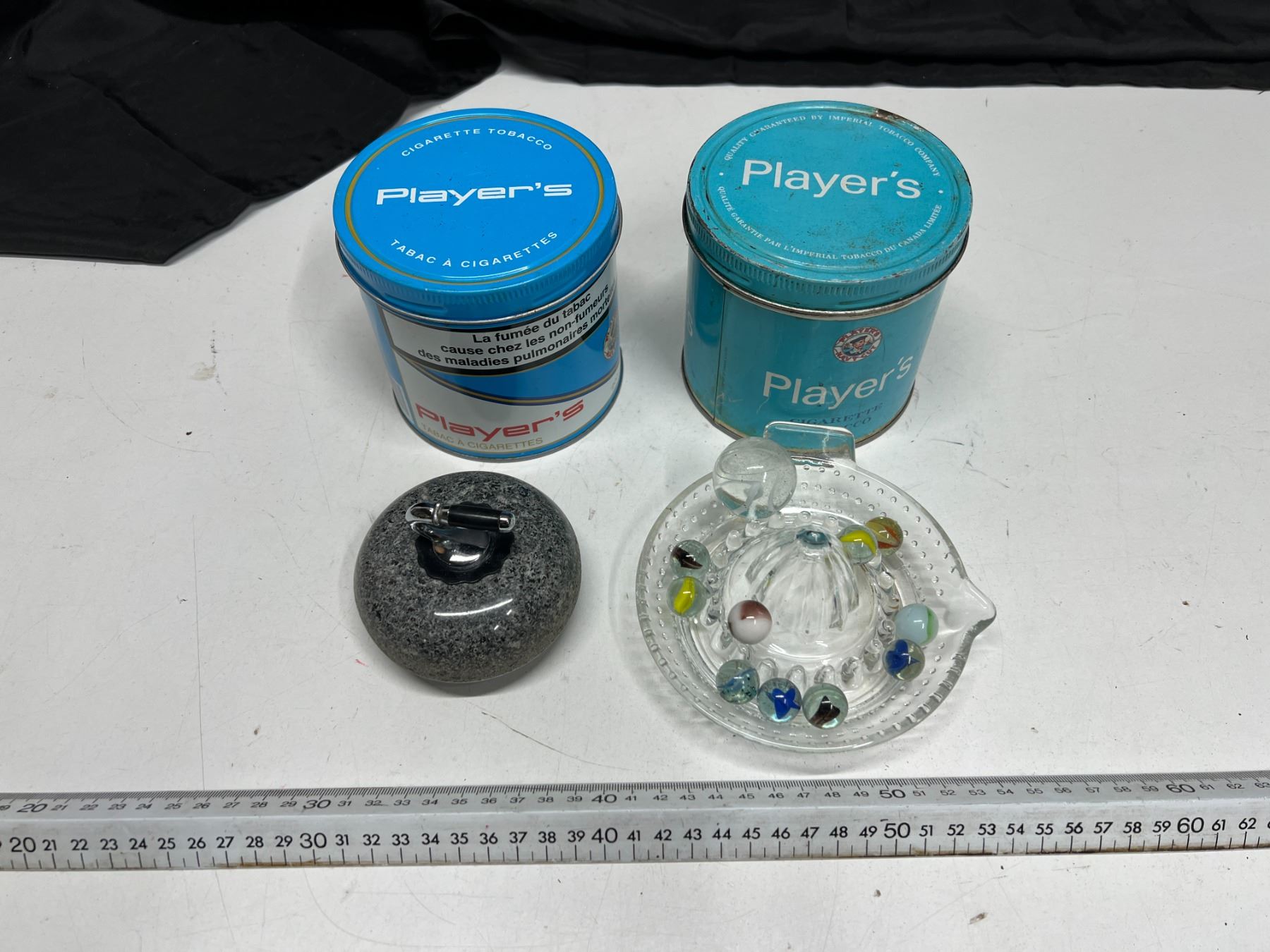 Miscenlleneous Items (Miniature Curling Rock, Marbles, Tin Cans)