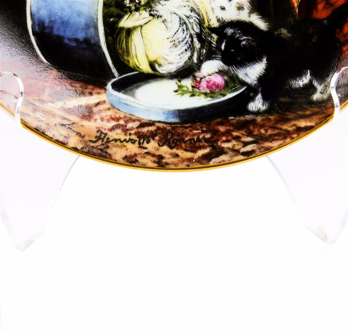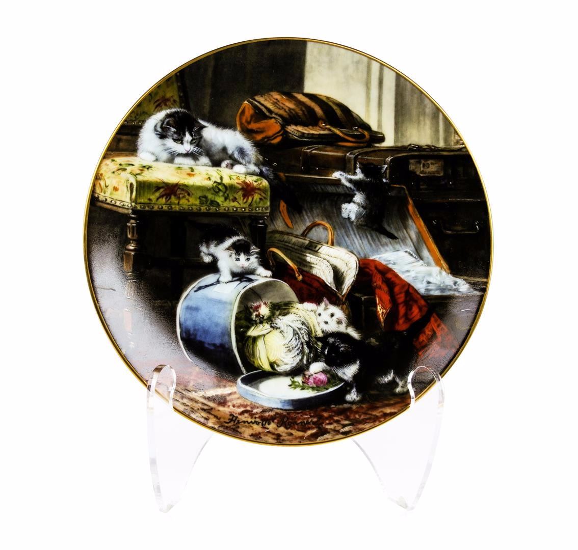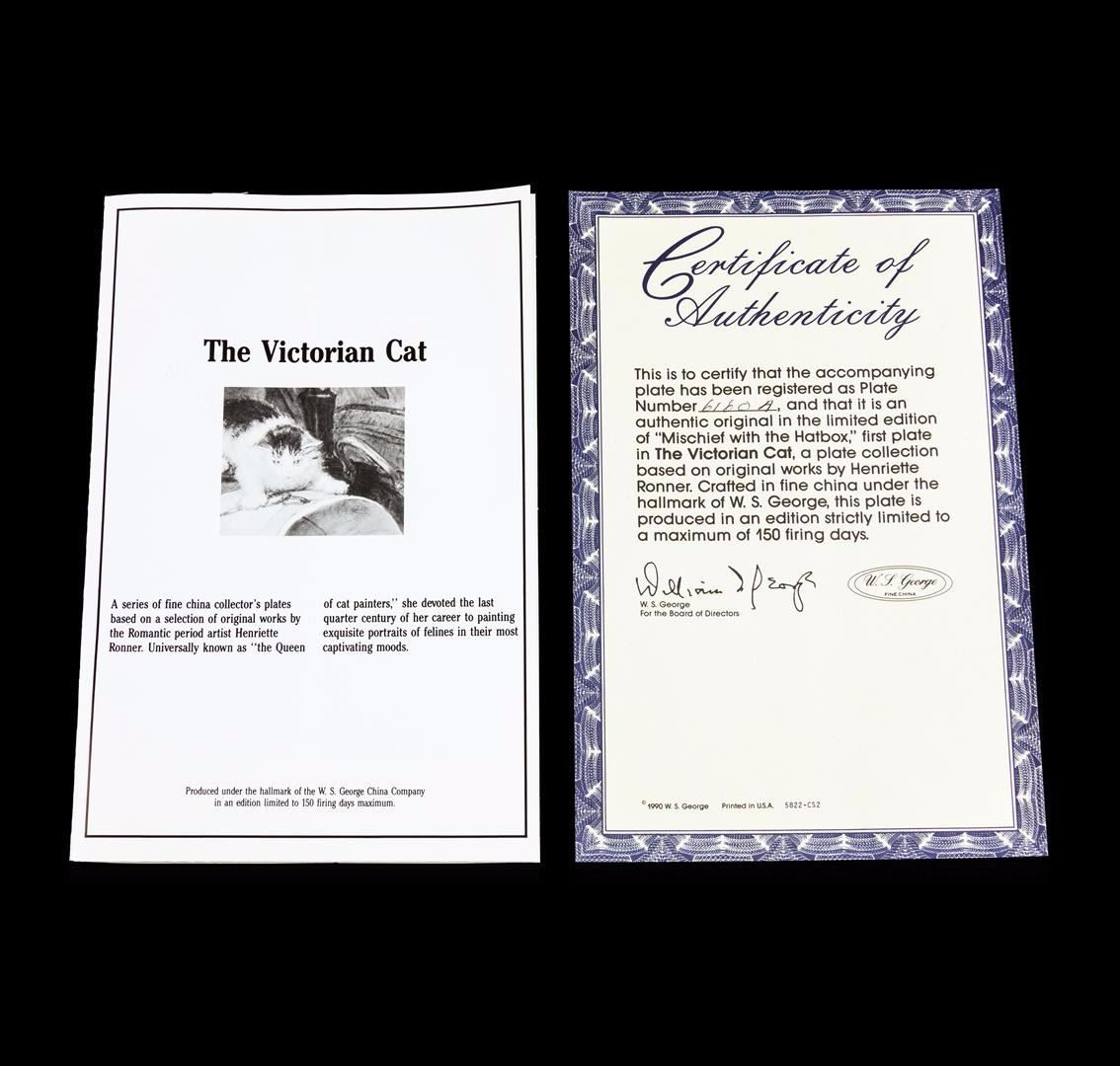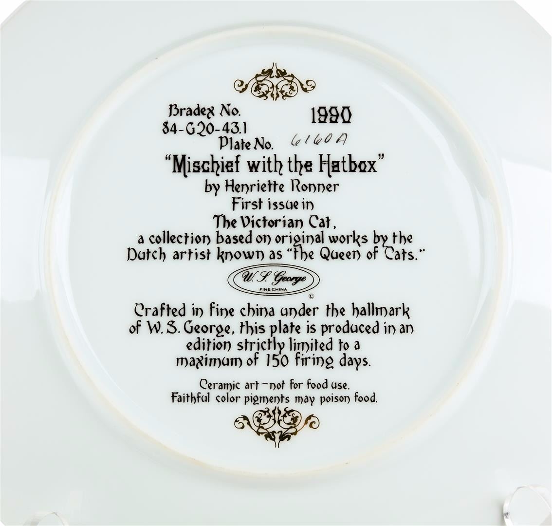 Mischief with the Hatbox, The Victorian Cat, Henriette Ronner, Collectible Plate. This beautiful fine china collector plate "Mischief with the Hatbox" is the first plate issued in The Victorian Cat, a collection based on original works by Henriette Ronner. Crafted under the hallmark of W.S. George, this plate was produced in 1990 in an edition strictly limited to a maximum of 150 firing days. This plate is listed for trading on The Bradford Exchange. You will receive the plate, and the original shipping box. Name: Mischief with the Hatbox. Series: The Victorian Cat. Plate Number: 6160A. Year of Issue: 1990. Material: Fine Porcelain China with 22-karat gold rim. Diameter: 8-1/4 inches. Bradex Number 84-G20-43.1. Manufacturer: W. S. George Fine China. Condition: Mint Condition.