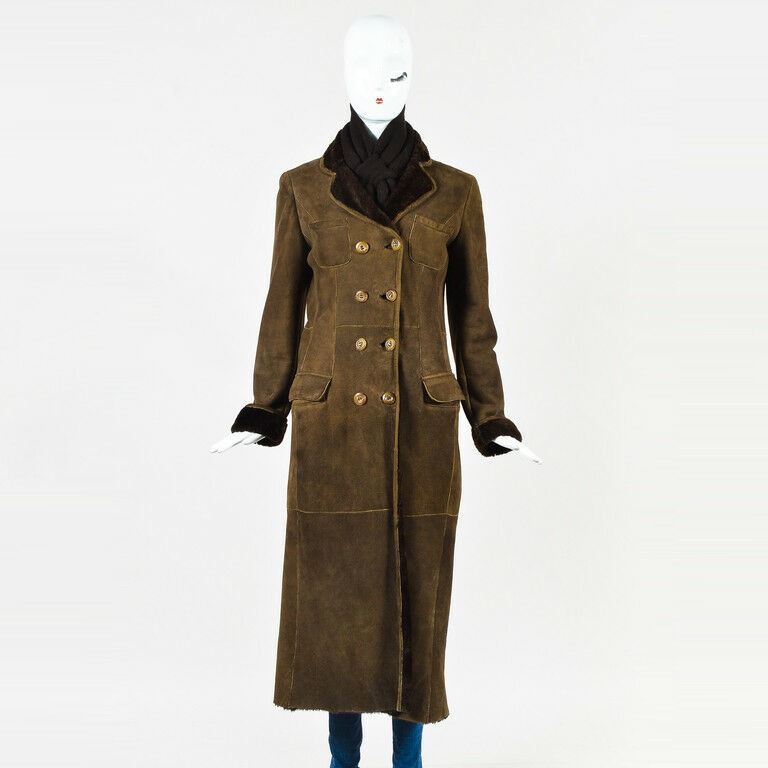 Brown Suede & Shearling Buttoned Maxi Coat w/ Knit Scarf