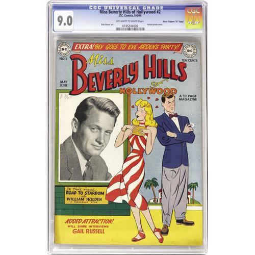 <B>Miss Beverly Hills of Hollywood #2 Davis Crippen ("D" Copy) pedigree (DC, 1949) CGC VF/NM 9.0 Off-white to white pages.</B></I> We were under the impression that William Holden was never young, but there's evidence to the contrary on this neat-o partial photo cover! Inside the issue, Miss Beverly Hills meets "Our Miss Brooks" herself, Eve Arden. You'll love the condition of this seldom-seen issue. Overstreet 2006 VF/NM 9.0 value = $422; NM- 9.2 value = $575. CGC census 6/06: 1 in 9.0, none higher. <I>From the Crippen Collection.</B></I> <BR><BR><B>Important notice:</B> Heritage usually auctions material at the rate of 200-250 lots per hour. On some occasions eBay Live bid software or the Internet may not be able to keep up with the pace of the auction. We recommend placing a realistic absentee bid now as insurance to avoid disappointment. Occasionally the auctioneer may eliminate or reject an eBay Live bid, and the auctioneer may also reopen a lot after the close of the eBay live bidding (usually because we missed an audience bid), and may reject your bid even if it shows you as the winning bidder. By bidding via eBay Live, you agree that Heritage may award the lot to another bidder at its sole discretion under the circumstances described above or any other reasonable circumstances. Since eBay bids are not shown to us until we open the lot on the floor, we treat those bids just like floor bids. In most cases the floor responds before the eBay bid is presented to us, due to Internet lag time, so for consistency we have made it a policy that floor bids are always considered first over tie eBay live bids. Also please note that all Heritage lots purchased through eBay Live carry a 22.5% Buyer's Premium. Please make sure you read the Terms and Conditions before you bid. This lot is being auctioned in conjunction with a live floor auction by Heritage Auction Galleries. All final auction and invoice information will be supplied by Heritage Auction Galleries, and all other information should be considered preliminary. Lot:41001 <BR><BR><B>Winning Notification and Billing:</B> After the FINAL session in this auction is complete, Heritage will send e-mail and snail mail invoices. This process normally takes several days. All final auction and invoice information will be supplied by Heritage Auction Galleries, and all other information should be considered preliminary. <BR><BR>This auction will be conducted on a live auction floor and over the Internet through eBay Live. If you choose to place an absentee bid, please take a moment to <font color='#0000ff'><u><a href='http://pages.ebay.com/liveauctions/help/before/laabsentee.html'>learn how eBay Live absentee bidding works</a></u></font><font color='#000000'>