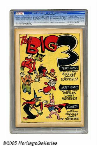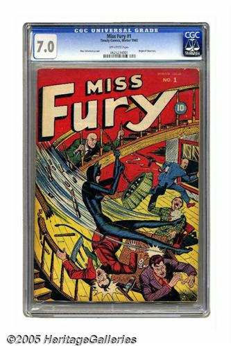 <B>Miss Fury #1 (Timely, 1942) CGC FN/VF 7.0 Off-white pages.</B></I> Tarpe Mills' newspaper heroine Miss Fury swung into her first comic book appearance here! The character is quite significant in comic book history, as she was one of the earliest superheroines -- according to some, she's the first superheroine to be created by a female cartoonist. This issue includes Miss Fury's origin, and she even appears in costume in the book, which wasn't the case for every issue. While Overstreet credits the cover to Alex Schomburg, our considered opinion is that it's the work of another Timely hand, probably Ms. Mills. This is the second-best copy CGC has graded thus far of this Timely #1. Overstreet 2005 FN 6.0 value = $1,137; VF 8.0 value = $2,464. CGC census 6/05: 1 in 7.0, 1 higher.