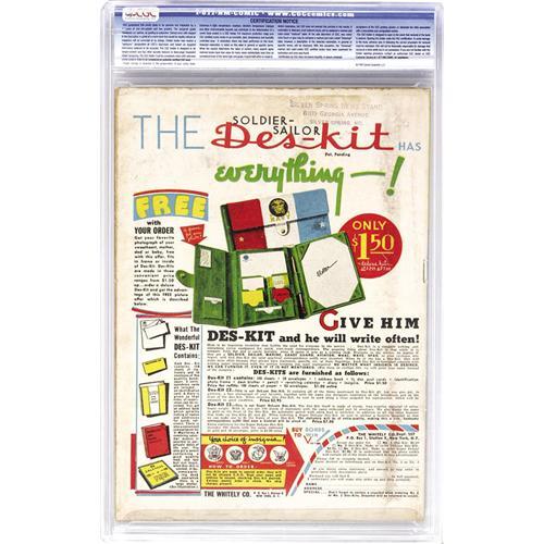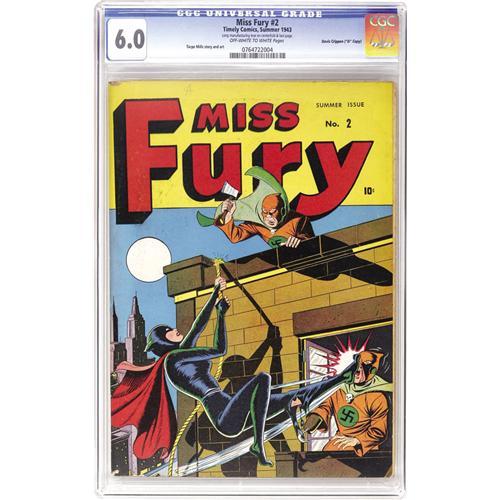 <B>Miss Fury #2 Davis Crippen ("D" Copy) pedigree (Timely, 1943) CGC FN 6.0 Off-white to white pages.</B></I> This is perhaps the best cover of this title's run! Tarpe Mills provided the interior story and art for her creation. CGC notes, "Long manufacturing tear on centerfold & last page." Overstreet 2006 FN 6.0 value = $588. CGC census 6/06: 1 in 6.0, 4 higher. <I>From the Crippen Collection.</B></I> <BR><BR><B>Important notice:</B> Heritage usually auctions material at the rate of 200-250 lots per hour. On some occasions eBay Live bid software or the Internet may not be able to keep up with the pace of the auction. We recommend placing a realistic absentee bid now as insurance to avoid disappointment. Occasionally the auctioneer may eliminate or reject an eBay Live bid, and the auctioneer may also reopen a lot after the close of the eBay live bidding (usually because we missed an audience bid), and may reject your bid even if it shows you as the winning bidder. By bidding via eBay Live, you agree that Heritage may award the lot to another bidder at its sole discretion under the circumstances described above or any other reasonable circumstances. Since eBay bids are not shown to us until we open the lot on the floor, we treat those bids just like floor bids. In most cases the floor responds before the eBay bid is presented to us, due to Internet lag time, so for consistency we have made it a policy that floor bids are always considered first over tie eBay live bids. Also please note that all Heritage lots purchased through eBay Live carry a 22.5% Buyer's Premium. Please make sure you read the Terms and Conditions before you bid. This lot is being auctioned in conjunction with a live floor auction by Heritage Auction Galleries. All final auction and invoice information will be supplied by Heritage Auction Galleries, and all other information should be considered preliminary. Lot:41001 <BR><BR><B>Winning Notification and Billing:</B> After the FINAL session in this auction is complete, Heritage will send e-mail and snail mail invoices. This process normally takes several days. All final auction and invoice information will be supplied by Heritage Auction Galleries, and all other information should be considered preliminary. <BR><BR>This auction will be conducted on a live auction floor and over the Internet through eBay Live. If you choose to place an absentee bid, please take a moment to <font color='#0000ff'><u><a href='http://pages.ebay.com/liveauctions/help/before/laabsentee.html'>learn how eBay Live absentee bidding works</a></u></font><font color='#000000'>