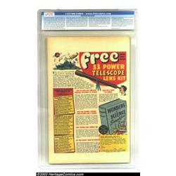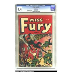 Miss Fury #5 (Timely, 1945) CGC NM 9.4 Off-white pages. This exquisite copy, with a stunning bondage and torture cover by Alex Schomburg, has been given CGC's highest grade for this issue, to date. Miss Fury's alluring form towers over the beastly objects of her, well... fury reflecting the inevitable triumphant of America over the evil empire, in this last issue to feature a war related theme on the cover. This is a razor sharp copy with lush colors, and a clean, flat surface. Overstreet 2003 NM 9.4 value = $1,075. Important notice: Heritage usually auctions material at the rate of 200-250 lots per hour. On some occasions eBay Live bid software or the Internet may not be able to keep up with the pace of the auction. We recommend placing a realistic absentee bid now as insurance to avoid disappointment. Occasionally the auctioneer may eliminate or reject an eBay Live bid, and the auctioneer may also reopen a lot after the close of the eBay live bidding (usually because we missed an audience bid), and may reject your bid even if it shows you as the winning bidder. By bidding via eBay Live, you agree that Heritage may award the lot to another bidder at its sole discretion under the circumstances described above or any other reasonable circumstances. Also please note that all Heritage lots purchased through eBay Live carry a 20% Buyer's Premium. Please make sure you read the Terms and Conditions before you bid.