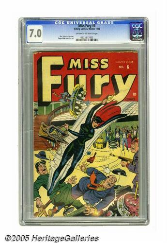 <B>Miss Fury #6 (Timely, 1945) CGC FN/VF 7.0 Off-white to white pages.</B></I> Alex Schomburg adds his distinctive touch to this issue's cover as Miss Fury breaks up a masquerade party heist. Inside, it's all Tarpe Mills, who wrote and drew the stories and pin-ups. Overstreet 2005 FN 6.0 value = $282; VF 8.0 value = $588. CGC census 7/05: 2 in 7.0, 5 higher.