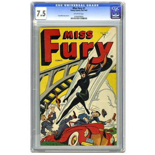 <B>Miss Fury #7 (Timely, 1945) CGC VF- 7.5 Off-white pages.</B></I> To judge a book by its cover, this one is a knock-out. Tarpe Mills' curvaceous crime-fighter cuts a mean figure as she hops off an overpass to deliver a couple of well-placed kicks to the gun-toting gangsters cruising by in a red convertible. Overstreet tells us that Miss F. dons her costume for only a single page inside, but hey -- this sweet copy's cover is good enough to enjoy just as it is, encased in a sturdy CGC holder! Overstreet 2006 VF 8.0 value = $506. CGC census 3/06: 1 in 7.5, 6 higher.