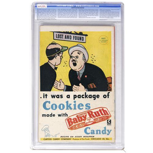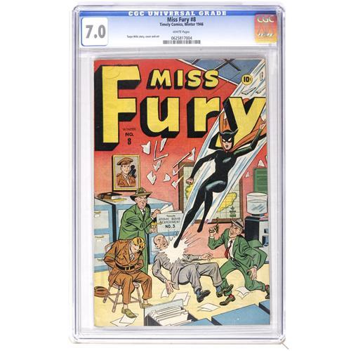 <B>Miss Fury #8 (Timely, 1946) CGC FN/VF 7.0 White pages.</B></I> Miss Fury interrupts some unsuspecting criminals in the act of stealing atomic bomb plans on this Tarpe Mills cover. You will be hard-pressed to locate a copy with nicer pages than this one! Mills also supplies the story and interior art. Overstreet 2006 FN 6.0 value = $243; VF 8.0 value = $506. CGC census 7/06: 2 in 7.0, 3 higher. <BR><BR><B>Important notice:</B> Heritage usually auctions material at the rate of 200-250 lots per hour. On some occasions eBay Live bid software or the Internet may not be able to keep up with the pace of the auction. We recommend placing a realistic absentee bid now as insurance to avoid disappointment. Occasionally the auctioneer may eliminate or reject an eBay Live bid, and the auctioneer may also reopen a lot after the close of the eBay live bidding (usually because we missed an audience bid), and may reject your bid even if it shows you as the winning bidder. By bidding via eBay Live, you agree that Heritage may award the lot to another bidder at its sole discretion under the circumstances described above or any other reasonable circumstances. Since eBay bids are not shown to us until we open the lot on the floor, we treat those bids just like floor bids. In most cases the floor responds before the eBay bid is presented to us, due to Internet lag time, so for consistency we have made it a policy that floor bids are always considered first over tie eBay live bids. Also please note that all Heritage lots purchased through eBay Live carry a 22.5% Buyer's Premium. Please make sure you read the Terms and Conditions before you bid. This lot is being auctioned in conjunction with a live floor auction by Heritage Auction Galleries. All final auction and invoice information will be supplied by Heritage Auction Galleries, and all other information should be considered preliminary. Lot:41001 <BR><BR><B>Winning Notification and Billing:</B> After the FINAL session in this auction is complete, Heritage will send e-mail and snail mail invoices. This process normally takes several days. All final auction and invoice information will be supplied by Heritage Auction Galleries, and all other information should be considered preliminary. <BR><BR>This auction will be conducted on a live auction floor and over the Internet through eBay Live. If you choose to place an absentee bid, please take a moment to <font color='#0000ff'><u><a href='http://pages.ebay.com/liveauctions/help/before/laabsentee.html'>learn how eBay Live absentee bidding works</a></u></font><font color='#000000'>
