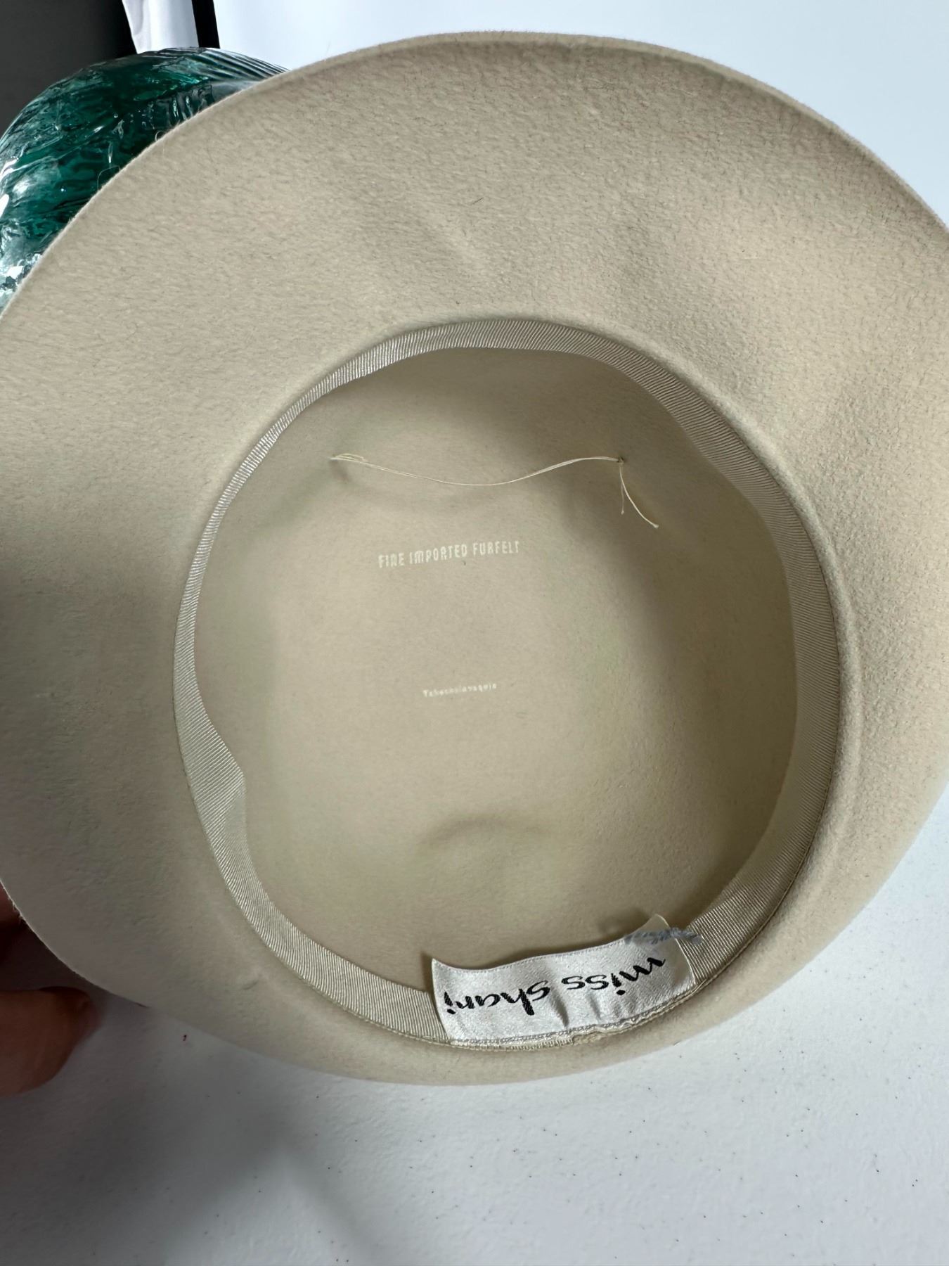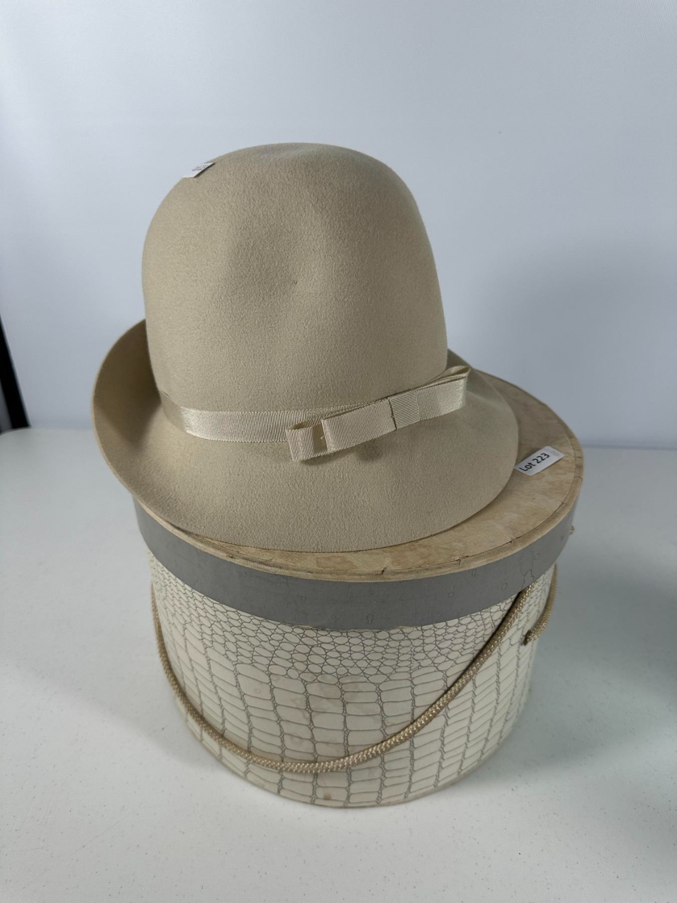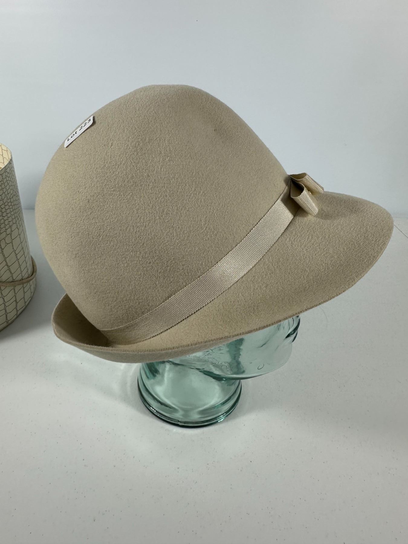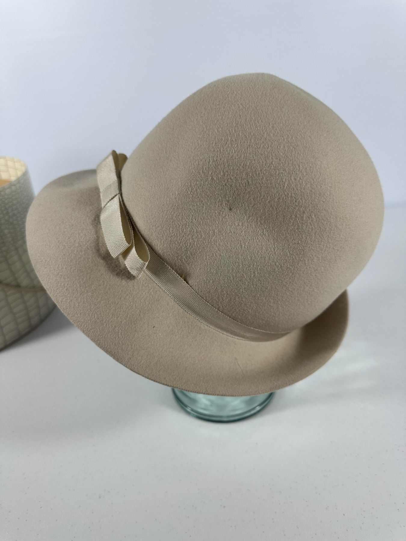 Includes a cream-colored felt hat by Miss Shari with ribbon trim, complete with vintage patterned hat box. A stylish mid-century millinery collectible.