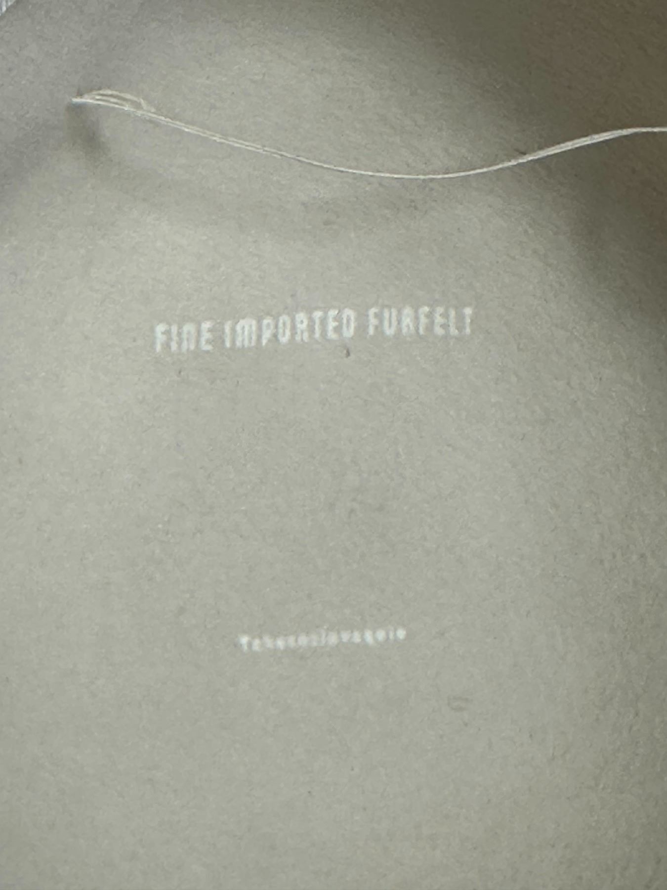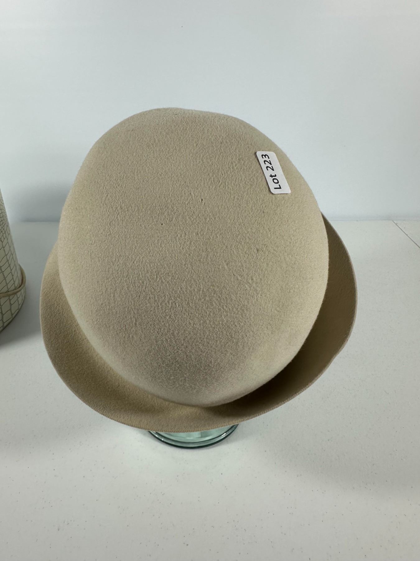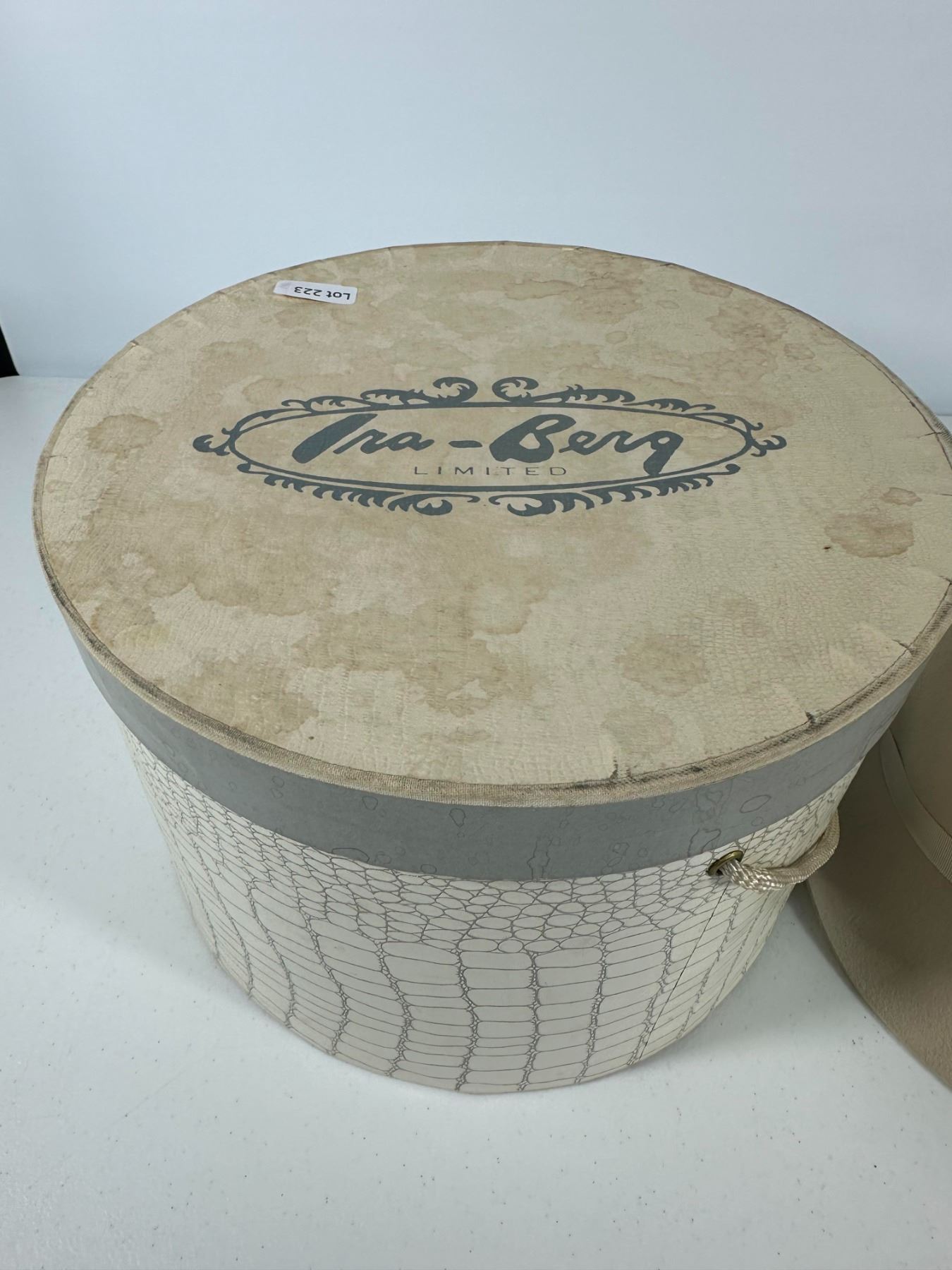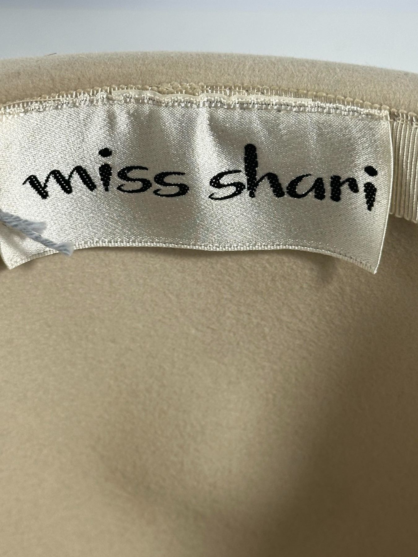 Includes a cream-colored felt hat by Miss Shari with ribbon trim, complete with vintage patterned hat box. A stylish mid-century millinery collectible.