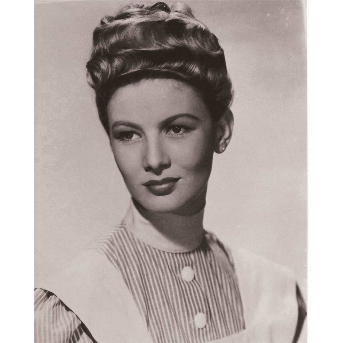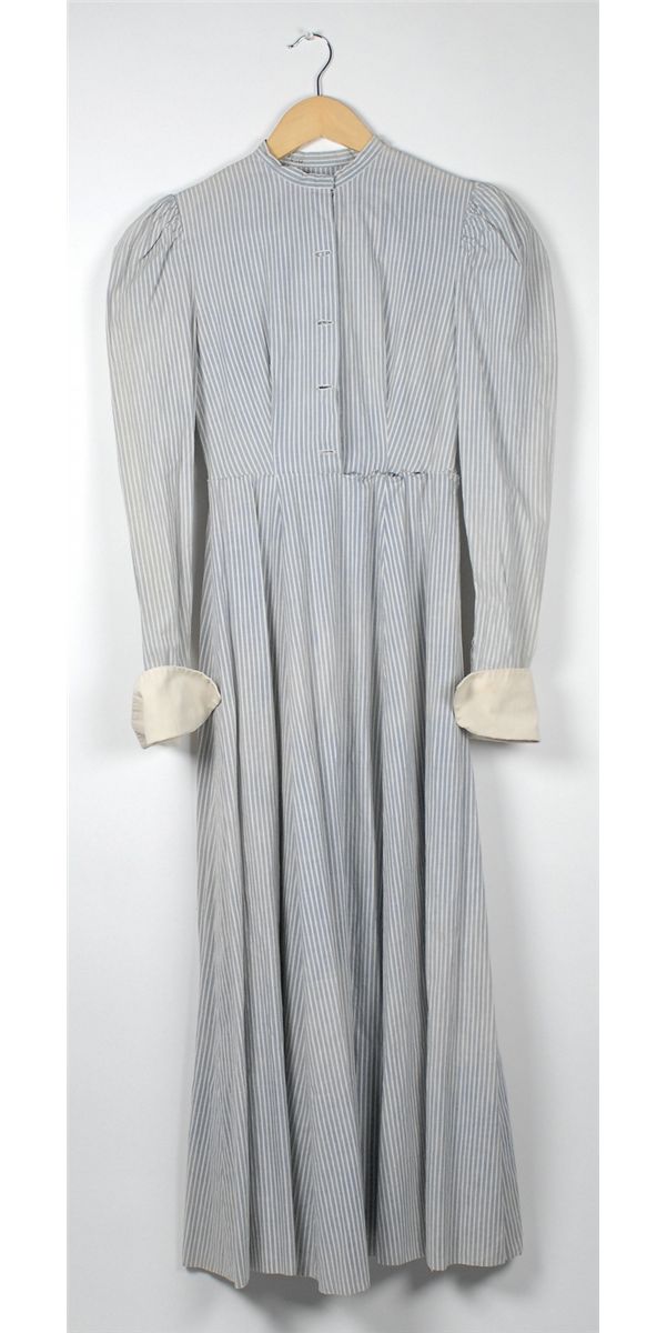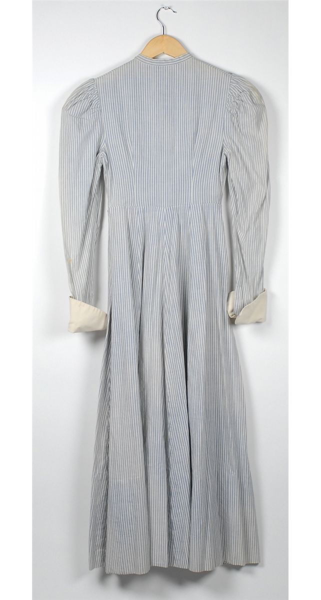 Dress worn by Lake in the 1946 film Miss Susie Slagle’s. Full-length blue and white striped dress has a button-up front and wide white cuffs. The number “12600” is written in black ink inside the collar and the inside of the costume bears a Paramount cleaning tag. In very good condition, with missing buttons and snaps on the front and expected light soiling.